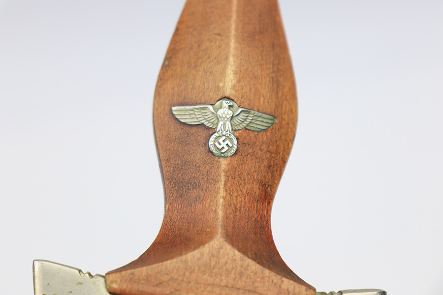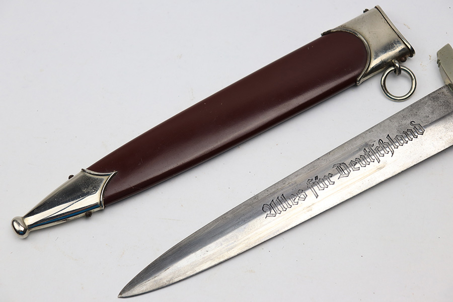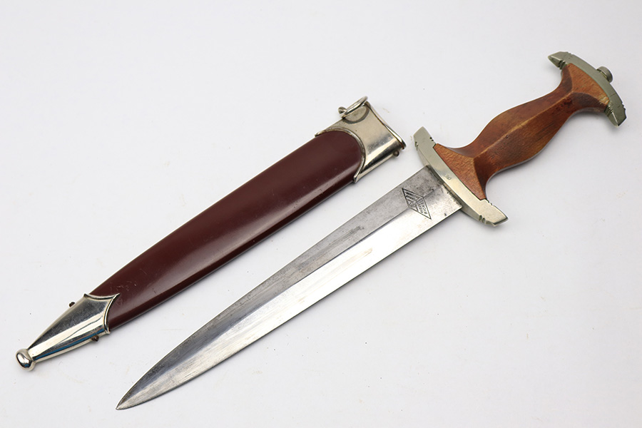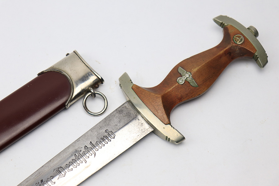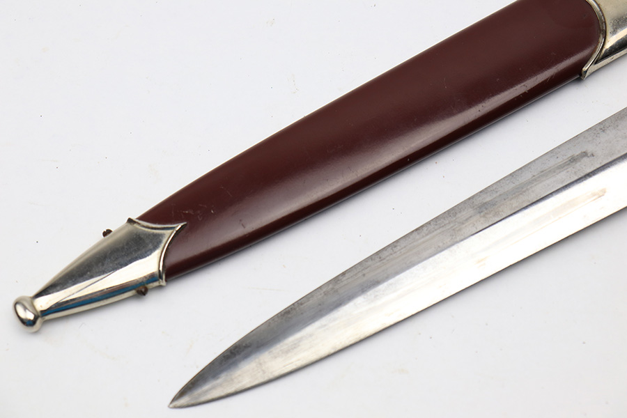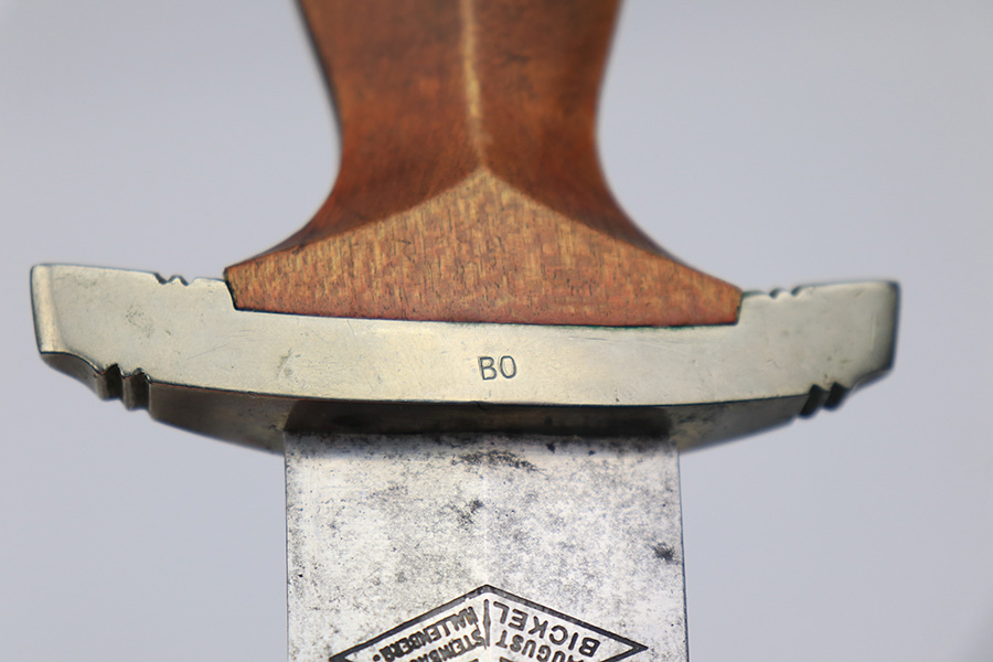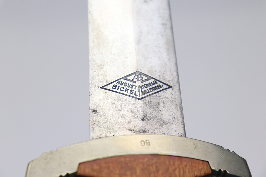 3/24/22 – This is an original WW2 SA Dagger by a fairly scarce maker, August Bickel. The dagger blade has surface oxidation throughout, but this is mild discoloration and not deep into the finish. No signs of sharpening. The wood handle has a few small dings and imperfections, but no cracks or chips. There’s mild patina on the hand guard and pommel. The scabbard is excellent throughout.