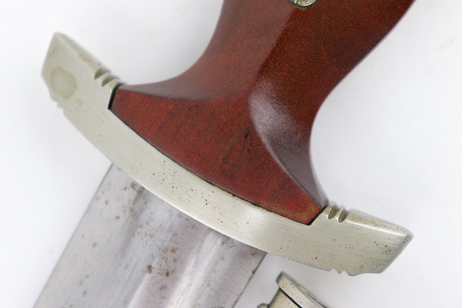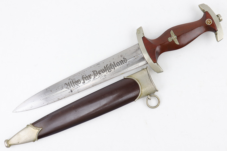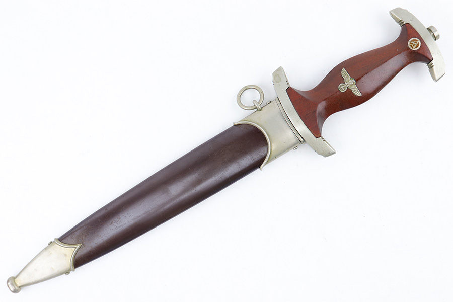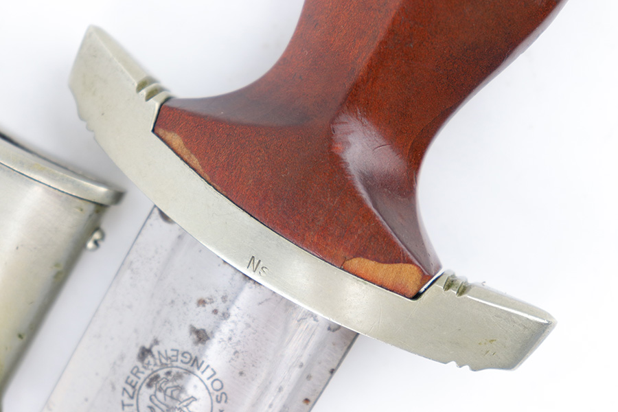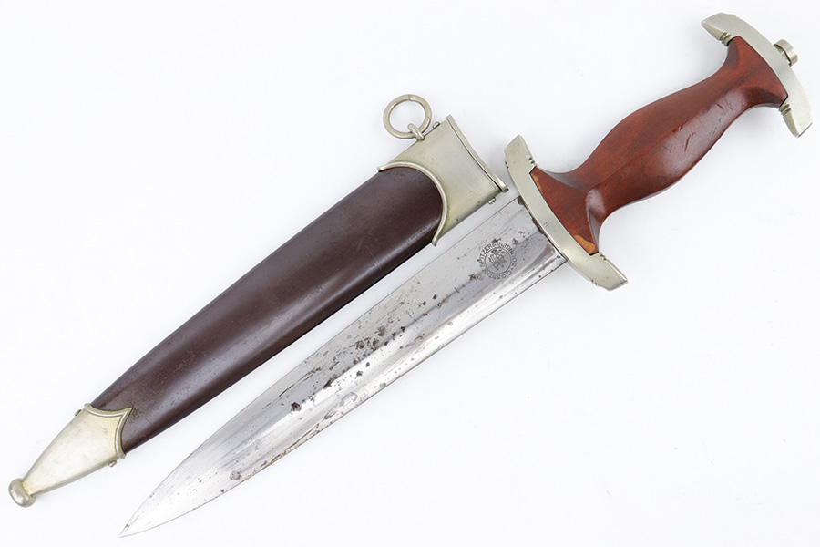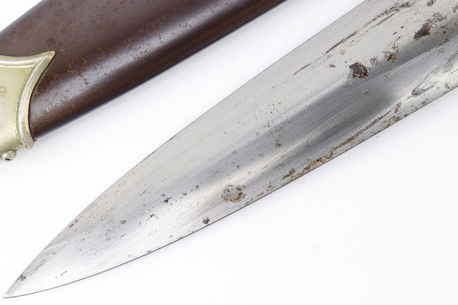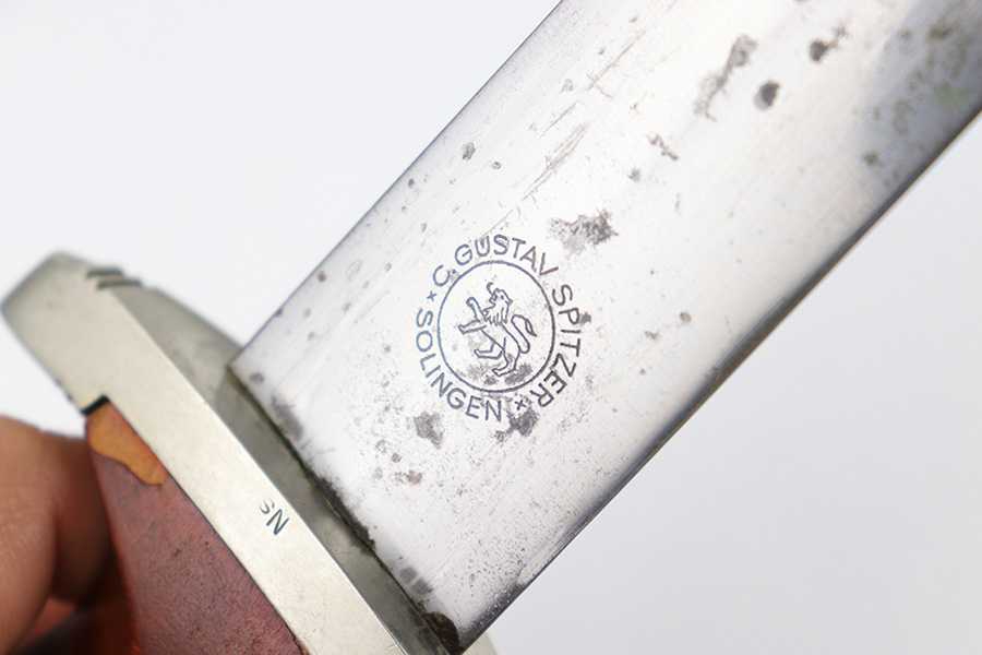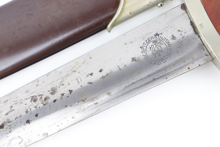 5/25/23 – This is an original WW2 production SA Dagger by Gustav Spitzer. The dagger is all original with a good condition blade that shows spotty dark discoloration and speckling oxidation. There’s also scabbard rub wear and typical micro-scratching on the blade, but the cross-graining is still visible. The cross guards are solid nickel and in great condition. There’s a few small chips in the base of the handle, and a few imperfections around the “SA” emblem in the wood. Comes with a brown painted scabbard that’s in great overall condition.