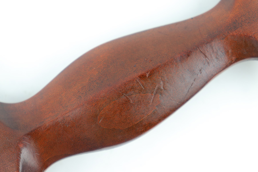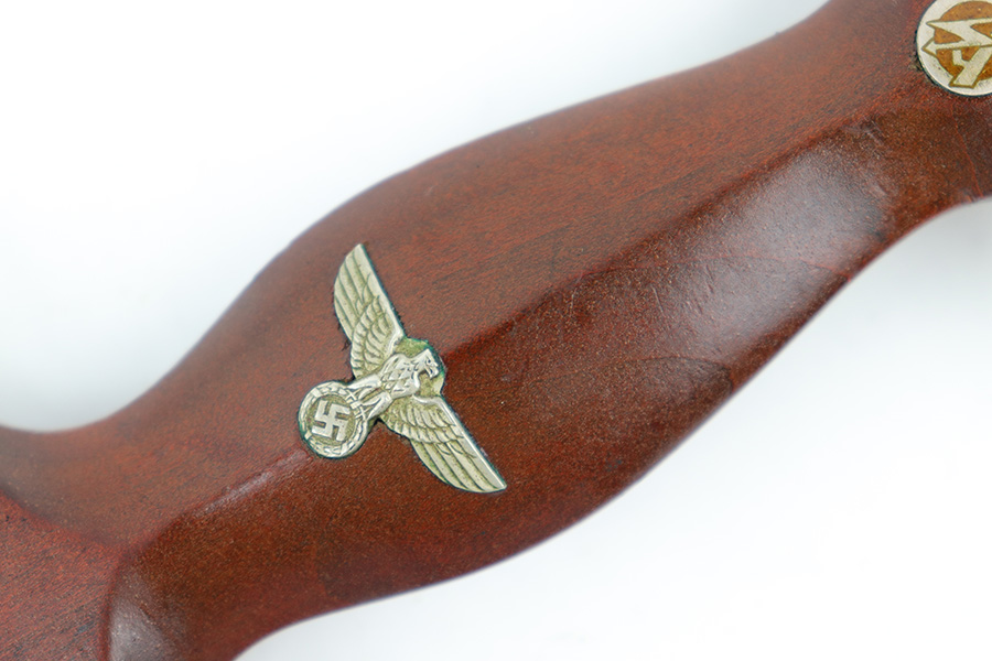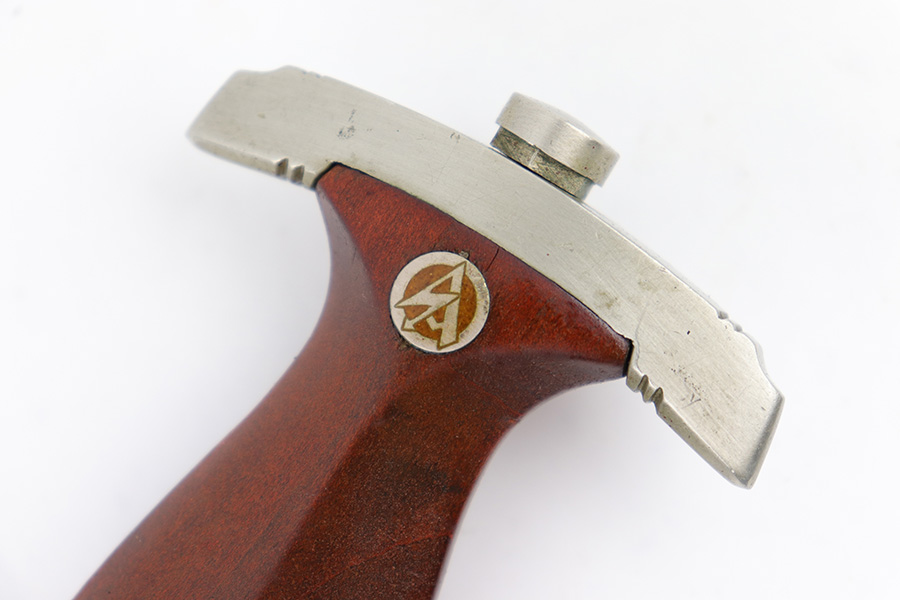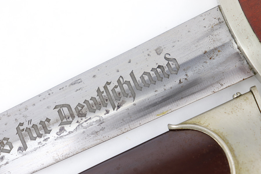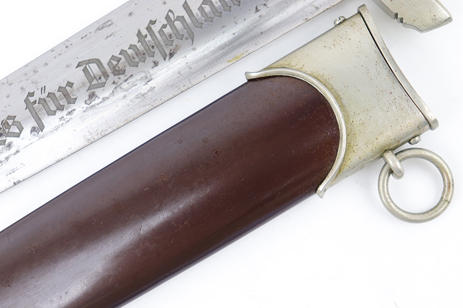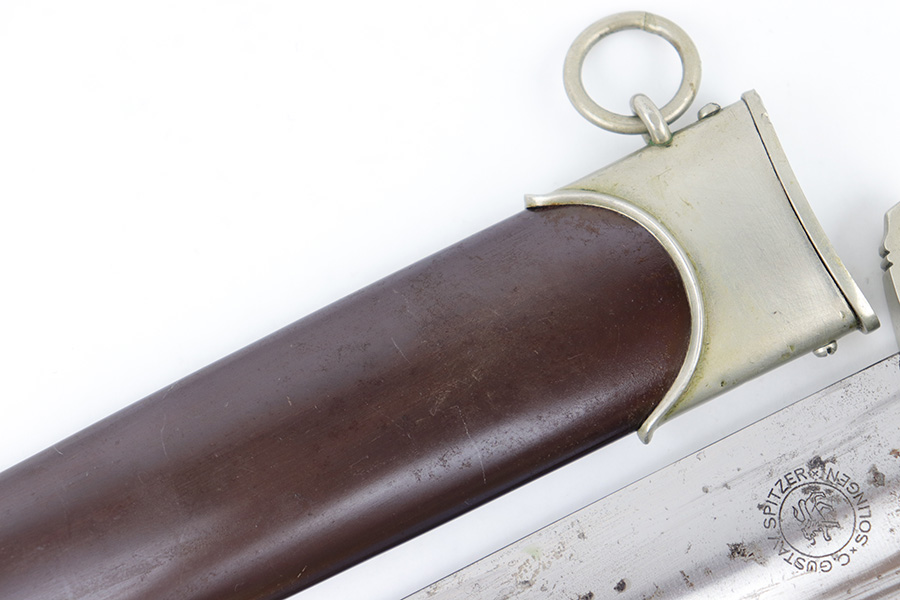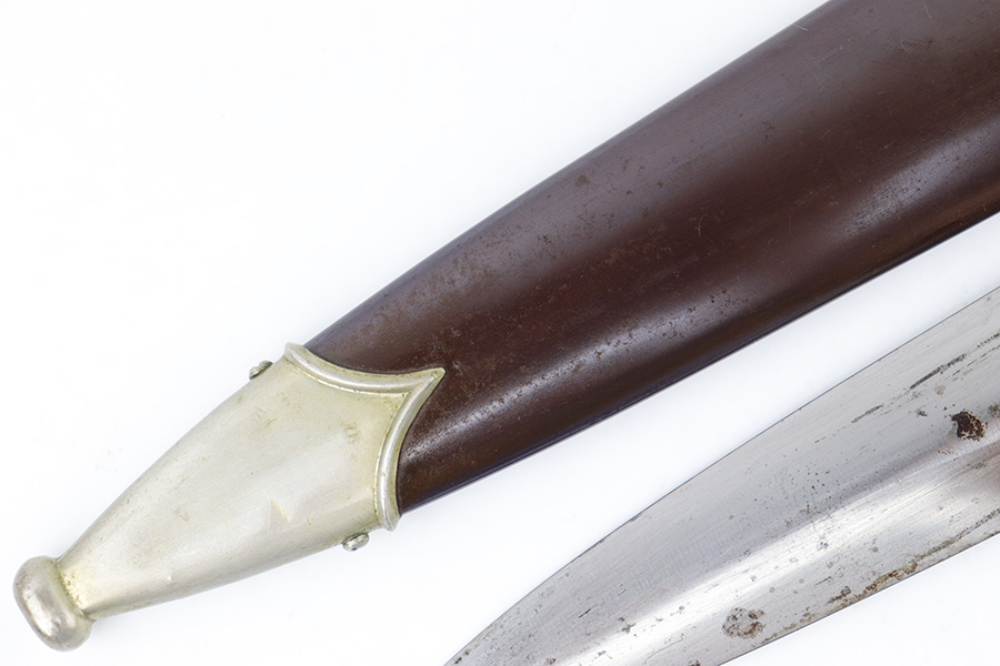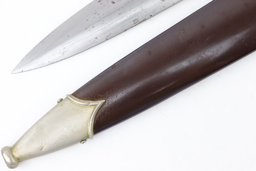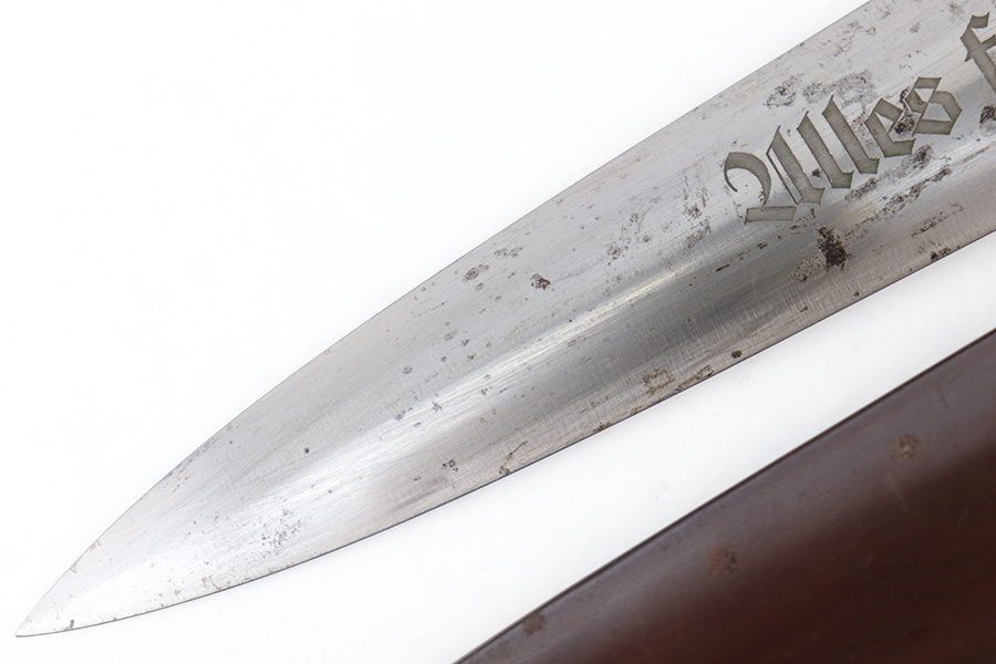 5/25/23 – This is an original WW2 production SA Dagger by Gustav Spitzer. The dagger is all original with a good condition blade that shows spotty dark discoloration and speckling oxidation. There’s also scabbard rub wear and typical micro-scratching on the blade, but the cross-graining is still visible. The cross guards are solid nickel and in great condition. There’s a few small chips in the base of the handle, and a few imperfections around the “SA” emblem in the wood. Comes with a brown painted scabbard that’s in great overall condition.