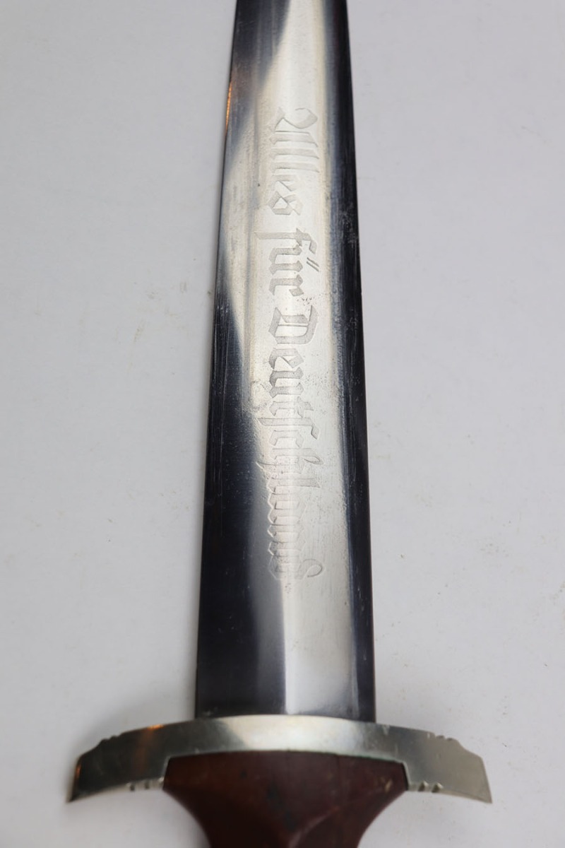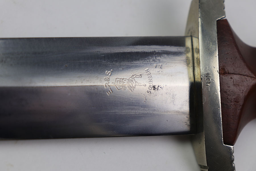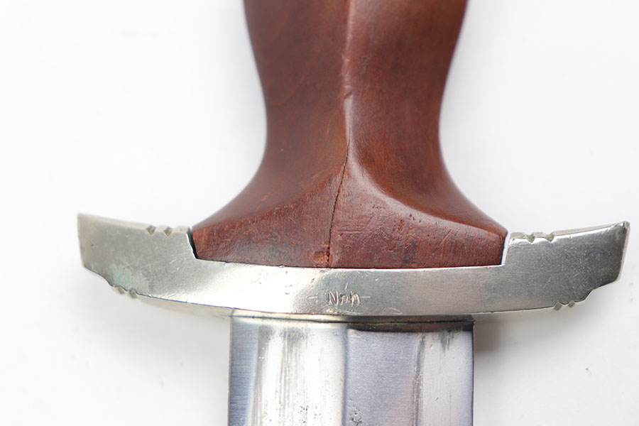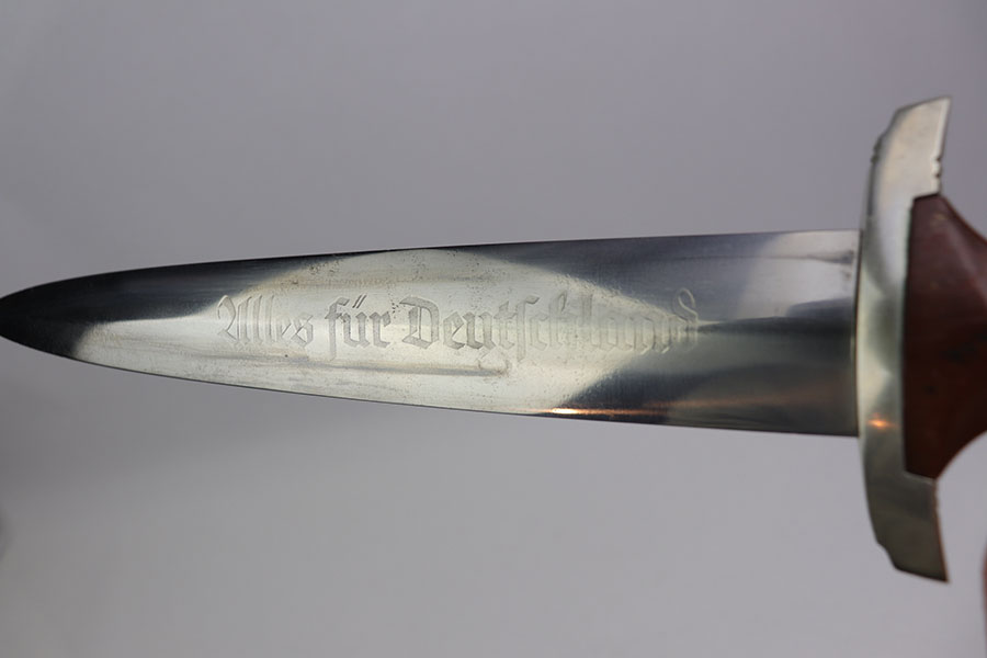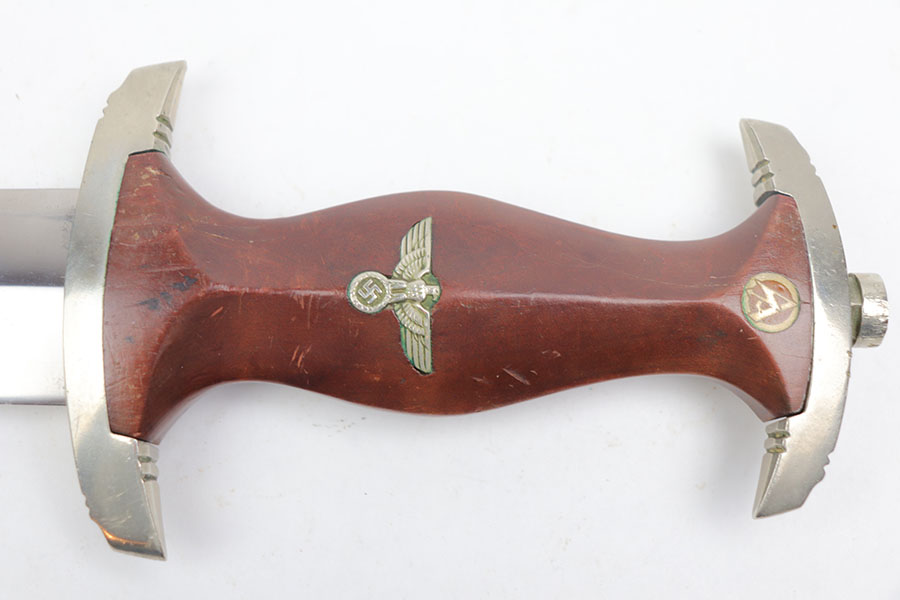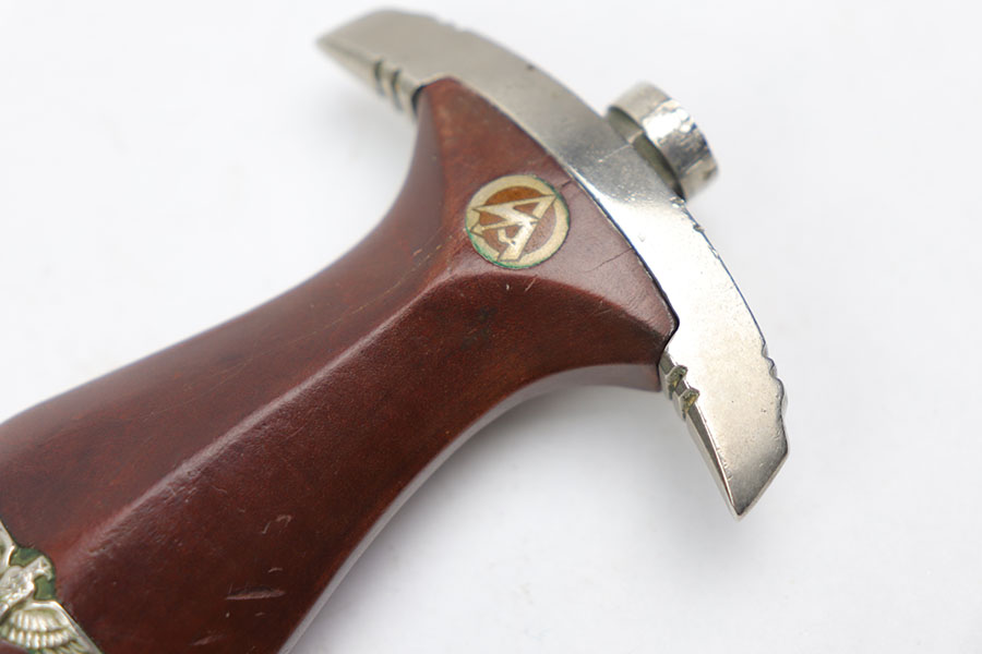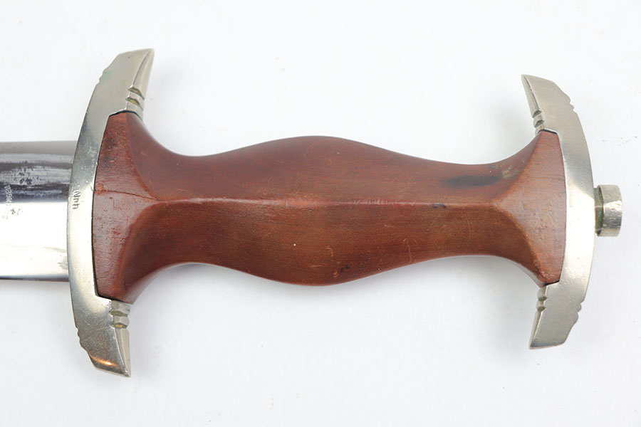 12/31/20 – This is an original SA Dagger with original scabbard. The dagger blade is very clean and excellent overall with Alles fur Deutschland on one side and a maker stamp on the reverse. The wood handle has a crack on the backside. Shown in photos. The scabbard has patina and light paint loss throughout, along with some darker spots of wear.