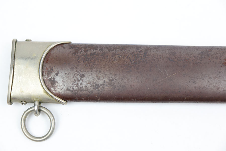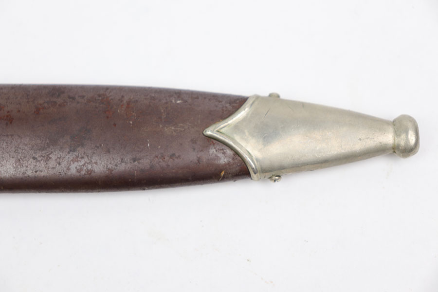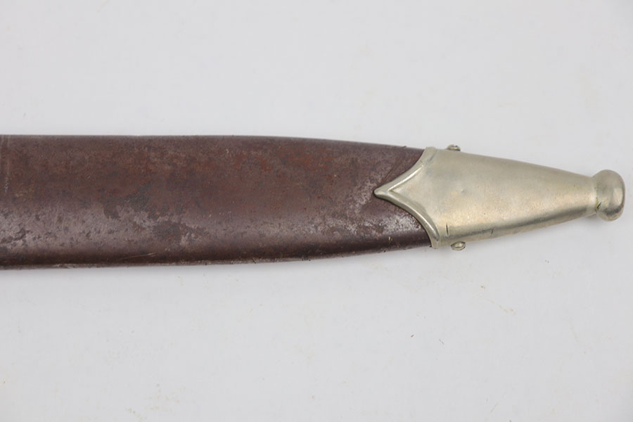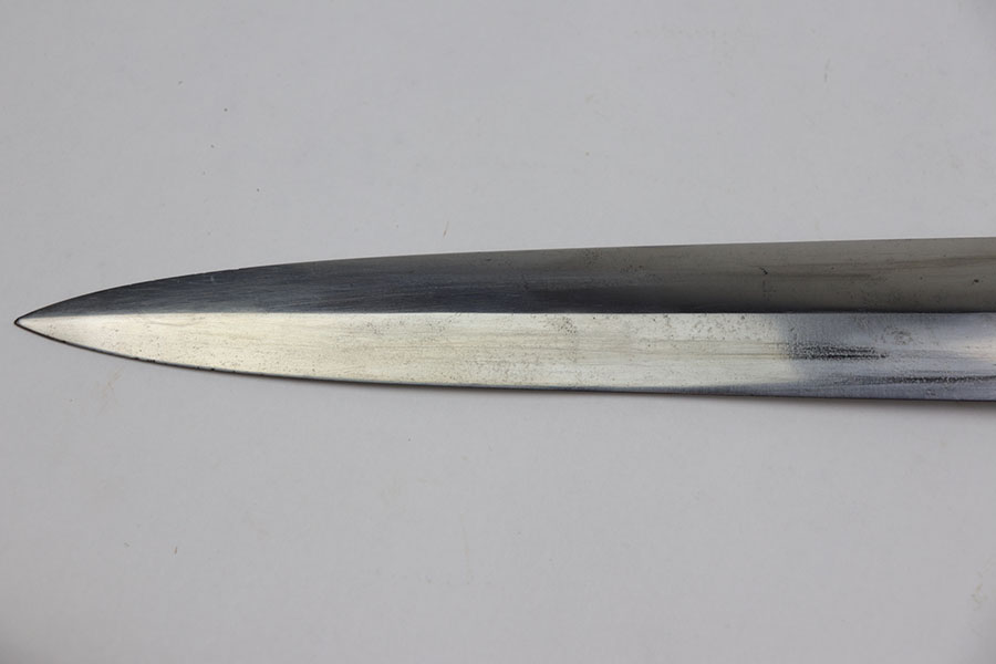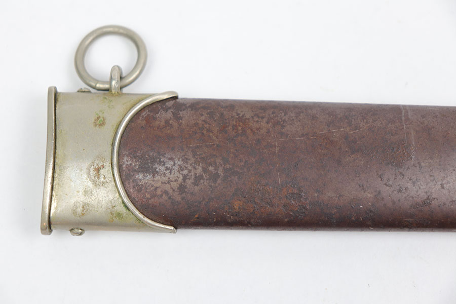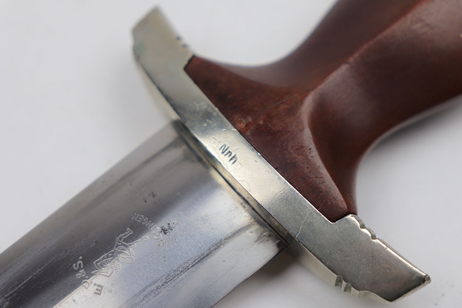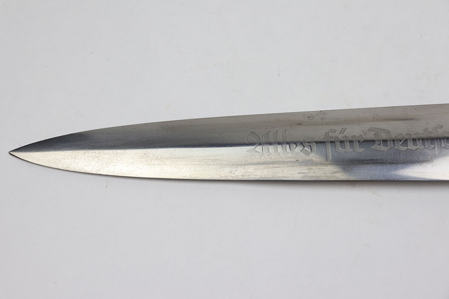 12/31/20 – This is an original SA Dagger with original scabbard. The dagger blade is very clean and excellent overall with Alles fur Deutschland on one side and a maker stamp on the reverse. The wood handle has a crack on the backside. Shown in photos. The scabbard has patina and light paint loss throughout, along with some darker spots of wear.