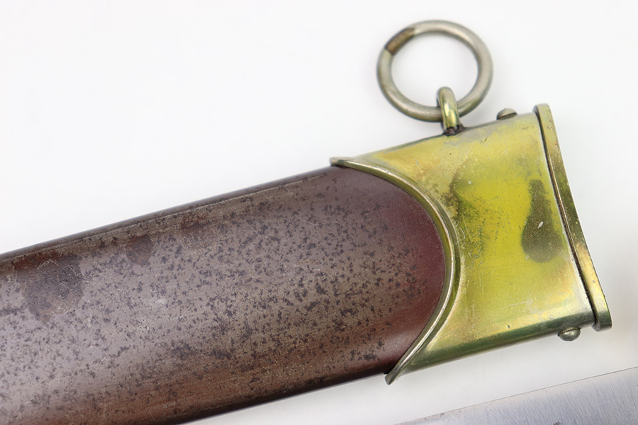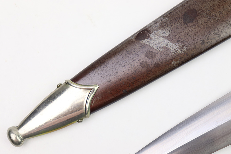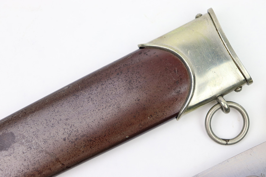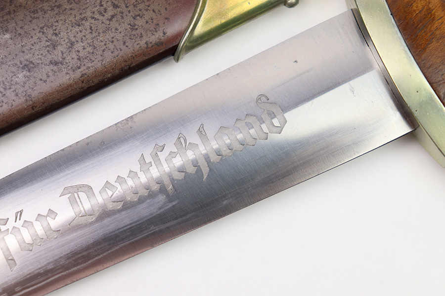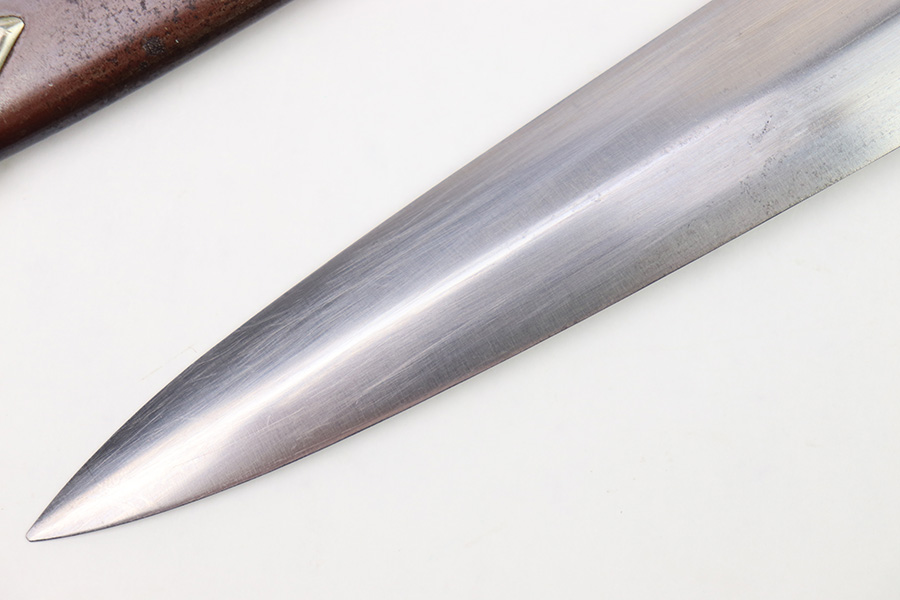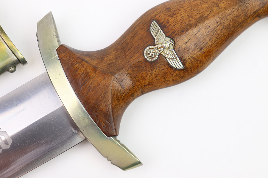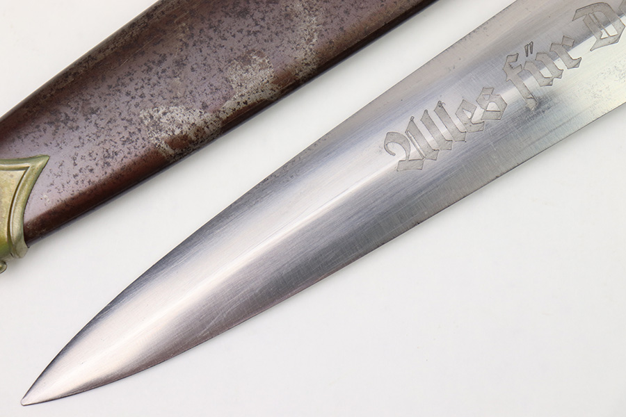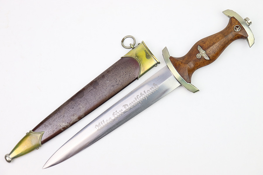 8/30/22 – This is an original WW2 production SA Dagger. The dagger blade is in great condition and is maker stamped by J.P. Sauer & Sohn. There’s evident cross-graining throughout the blade, and minimal discoloration. Most of the wear is surface scratches and scabbard wear. There are a few areas of dark speckling oxidation as well. No signs of sharpening. The hand guard has some yellowing from age, and is SA Gruppe stamped “Mi”. The wood handle is cracked near the SA emblem and there are two hairline cracks from the pommel that extend downward. The scabbard is anodized metal and has surface patina as well as yellowing and color fading throughout.