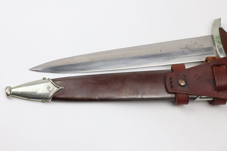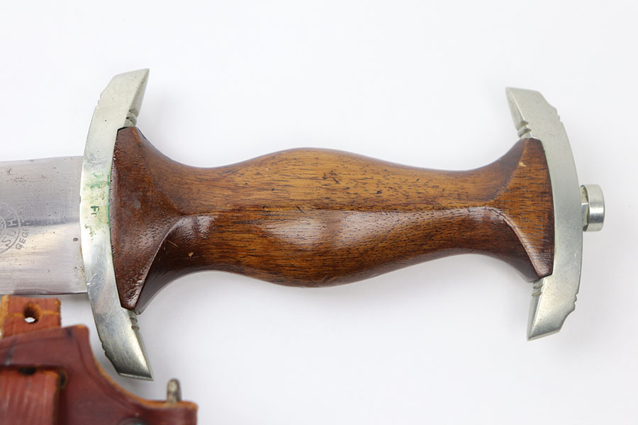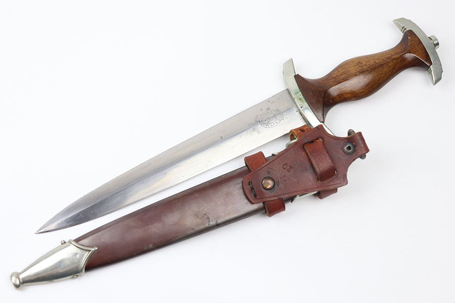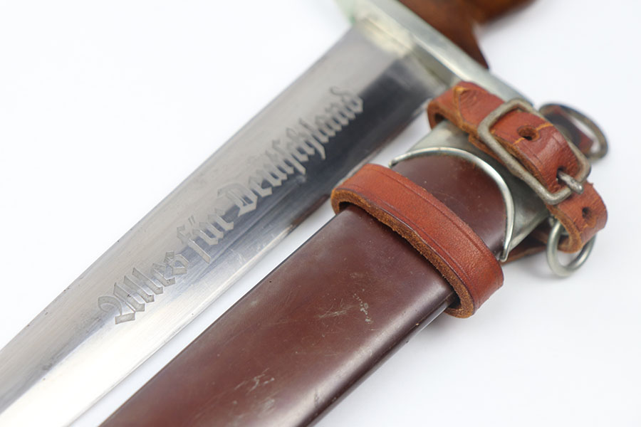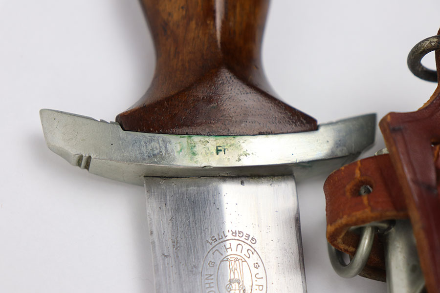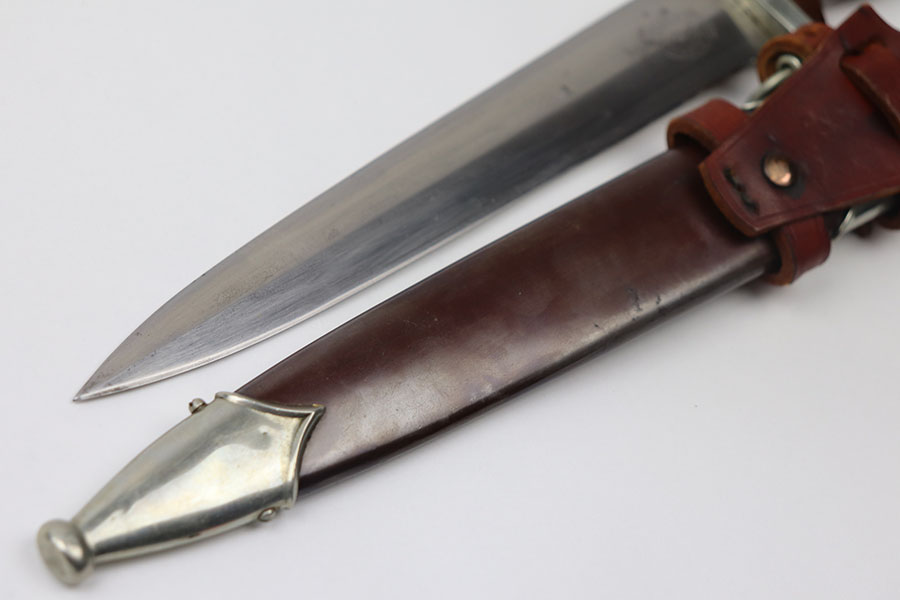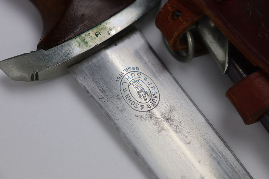 6/16/21 – This is an original SA Dagger from WW2 made by JP Sauer. The dagger comes with an original scabbard and a leather belt hanger. The blade is fairly clean with some mild surface scratches. The edge appears to have a mild amount of sharpening throughout the entirety of the blade. The wood handle has no cracks or chips. The scabbard is in great condition with no dents or major issues.