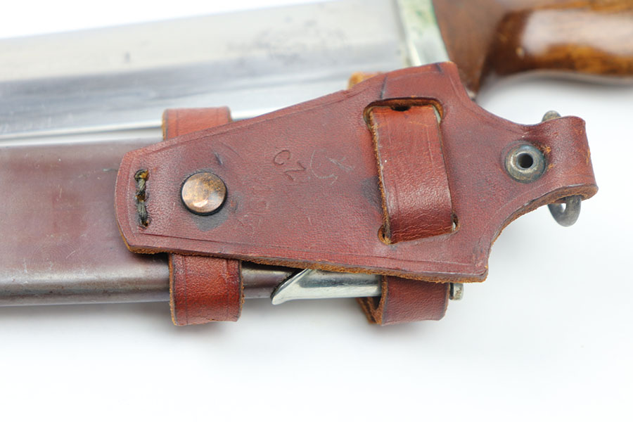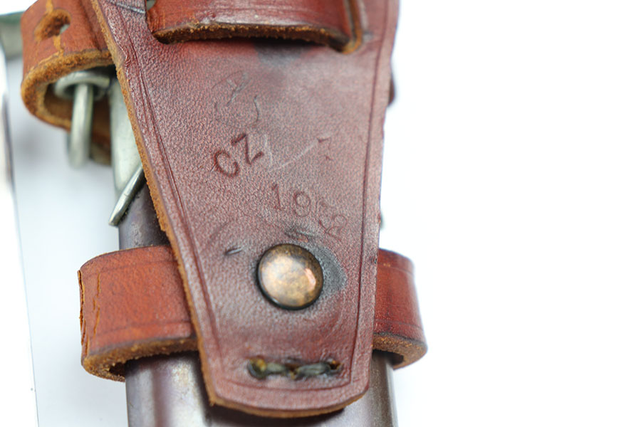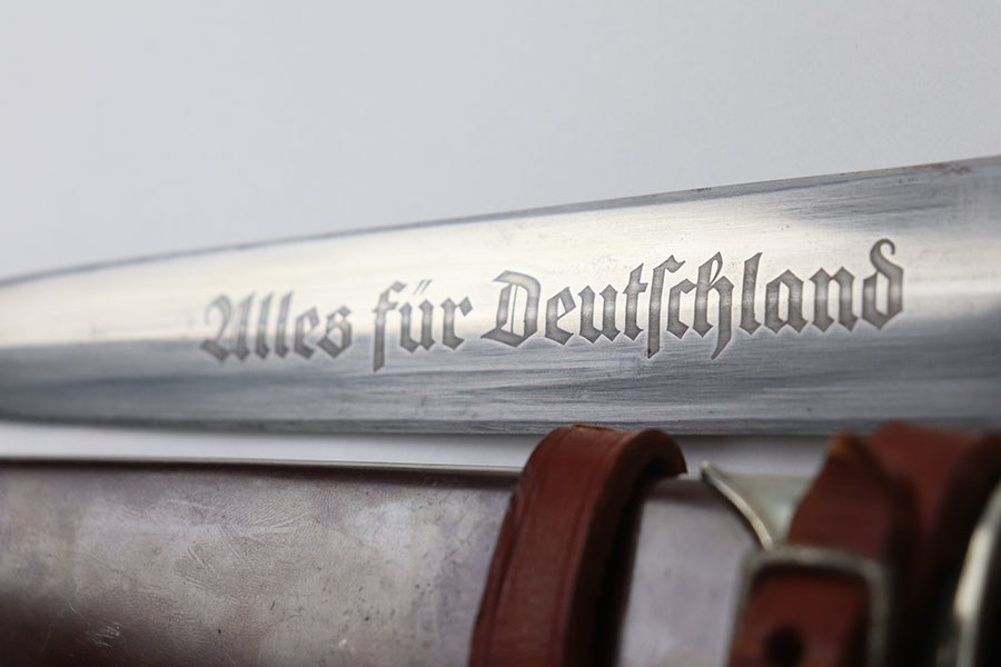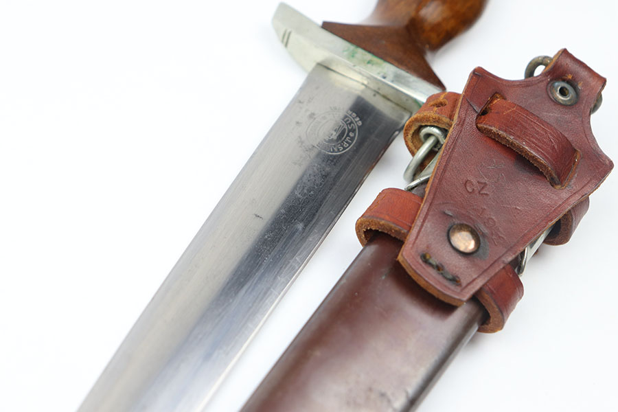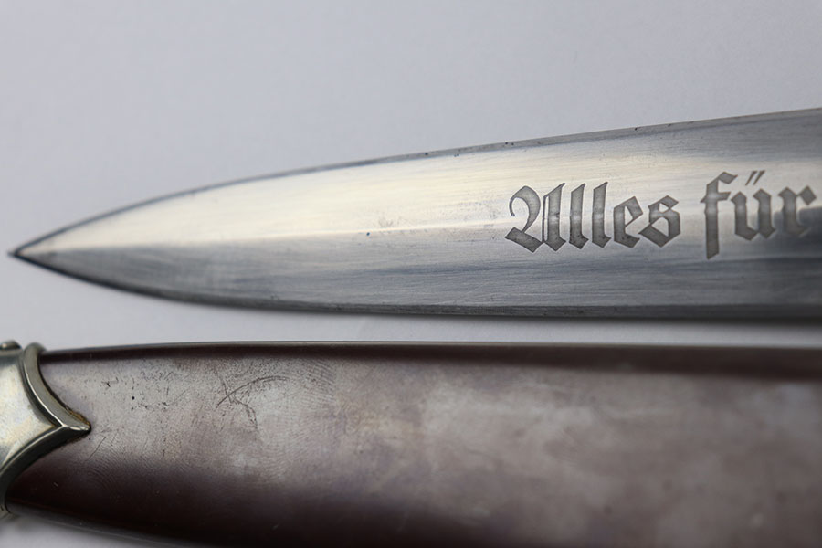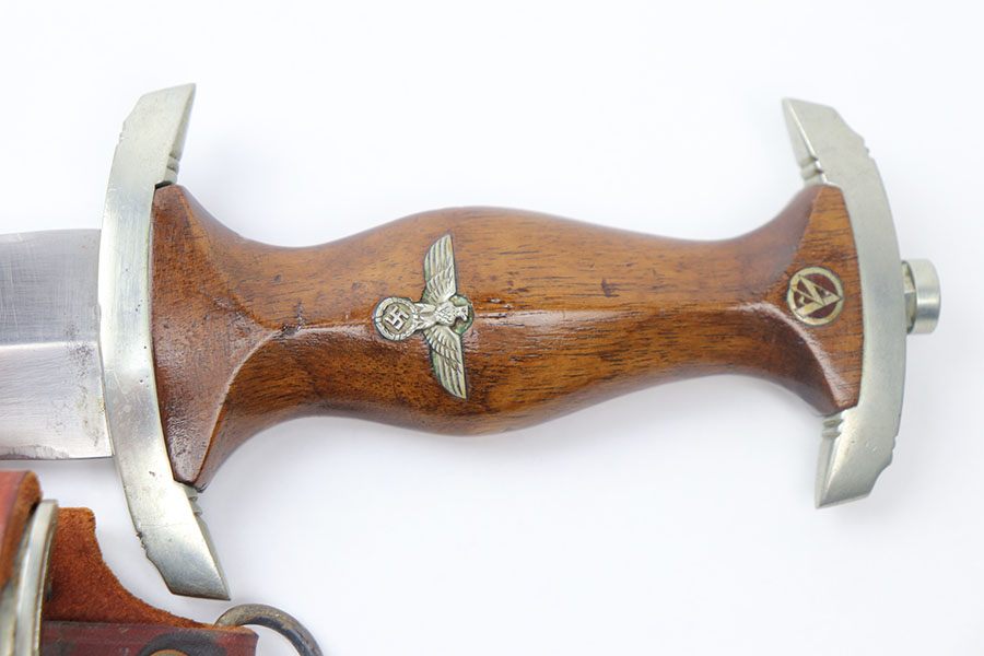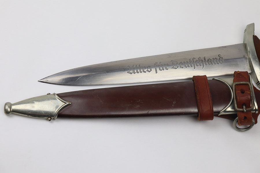6/16/21 – This is an original SA Dagger from WW2 made by JP Sauer. The dagger comes with an original scabbard and a leather belt hanger. The blade is fairly clean with some mild surface scratches. The edge appears to have a mild amount of sharpening throughout the entirety of the blade. The wood handle has no cracks or chips. The scabbard is in great condition with no dents or major issues.