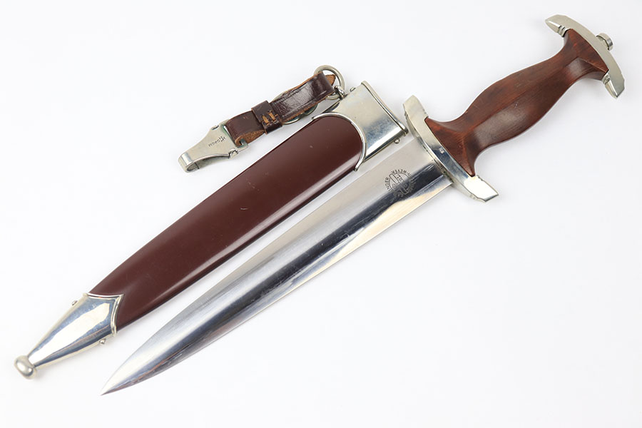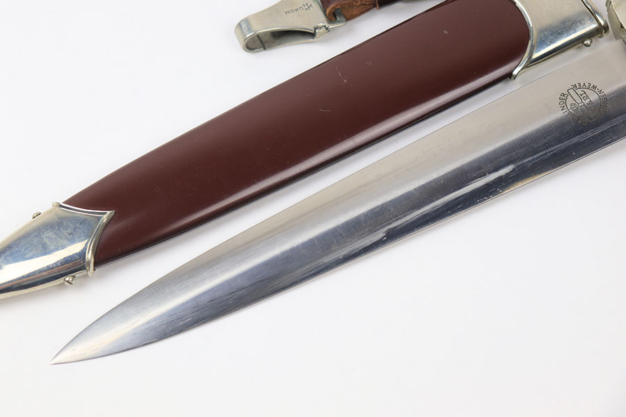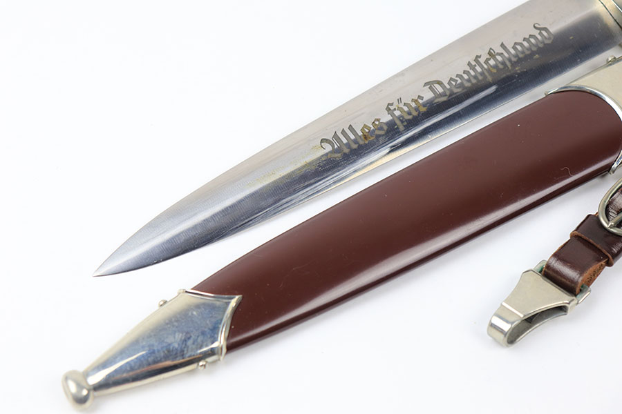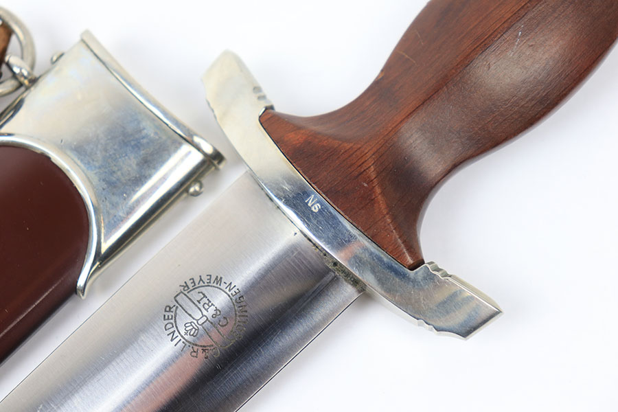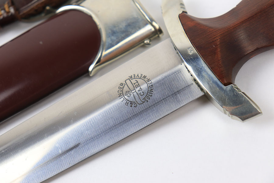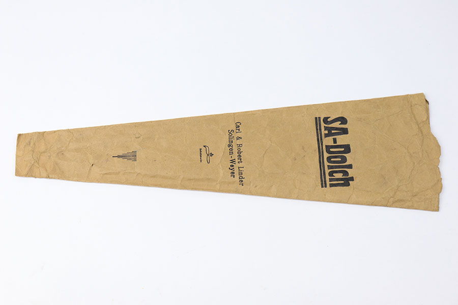 7/8/21 – This is an excellent, fairly scarce SA Dagger with an original hanger and a very rare factory bag / sleeve. The dagger is scarce because it is maker stamped by C&R Linder, which isn’t a very common maker. The blade is excellent and clean throughout with good cross graining. There’s some old oil in the inscription but this will likely clean out. Excellent wood handle and scabbard is in minty condition. Minty hanger as well. The bag is fragile but completely in tact. This “rig” came together out of a collection and was originally acquired / sold by Thomas Johnson (author).