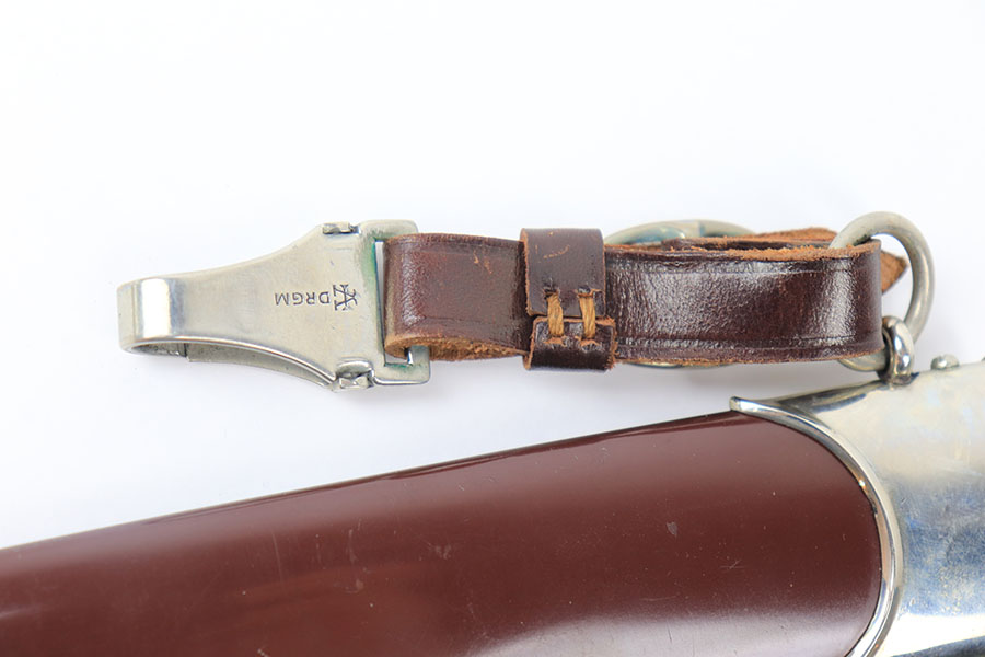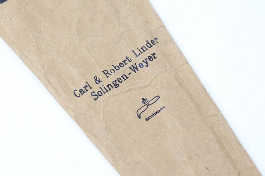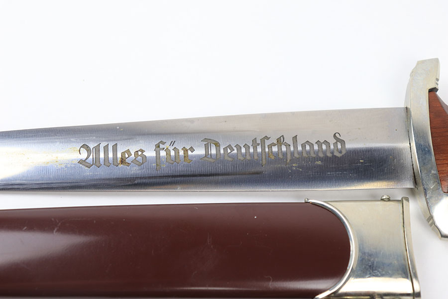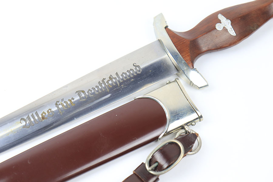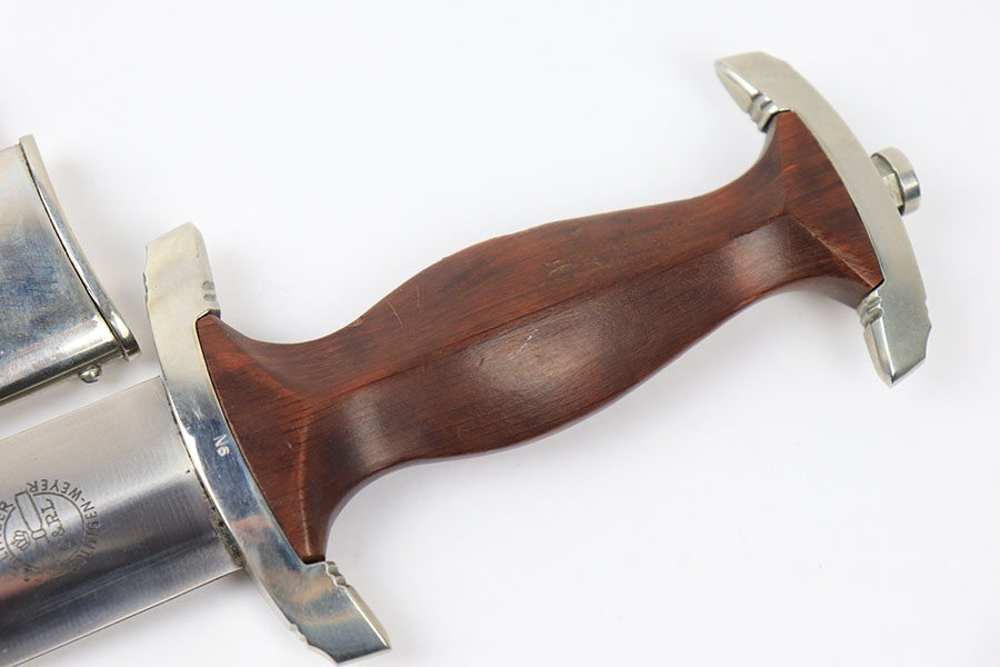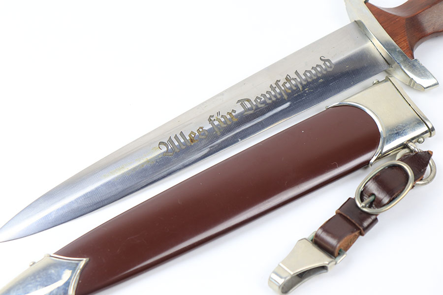 7/8/21 – This is an excellent, fairly scarce SA Dagger with an original hanger and a very rare factory bag / sleeve. The dagger is scarce because it is maker stamped by C&R Linder, which isn’t a very common maker. The blade is excellent and clean throughout with good cross graining. There’s some old oil in the inscription but this will likely clean out. Excellent wood handle and scabbard is in minty condition. Minty hanger as well. The bag is fragile but completely in tact. This “rig” came together out of a collection and was originally acquired / sold by Thomas Johnson (author).