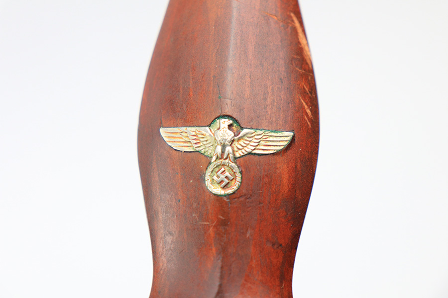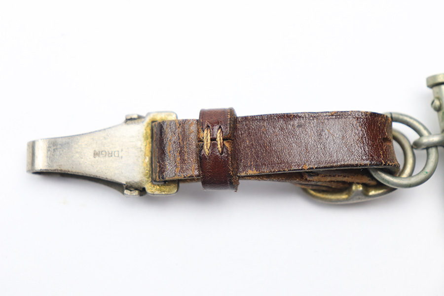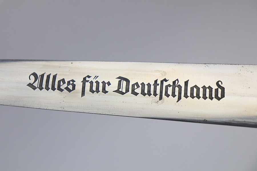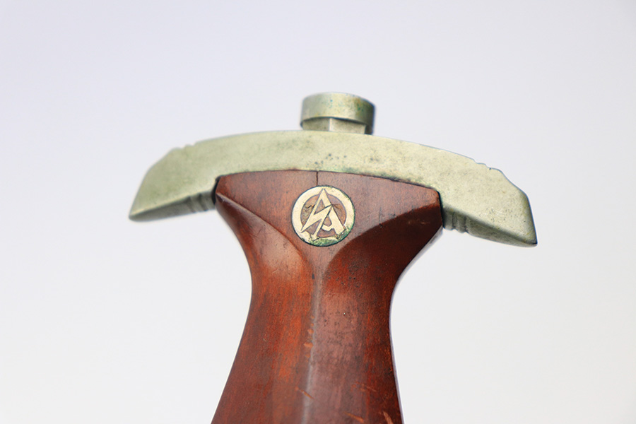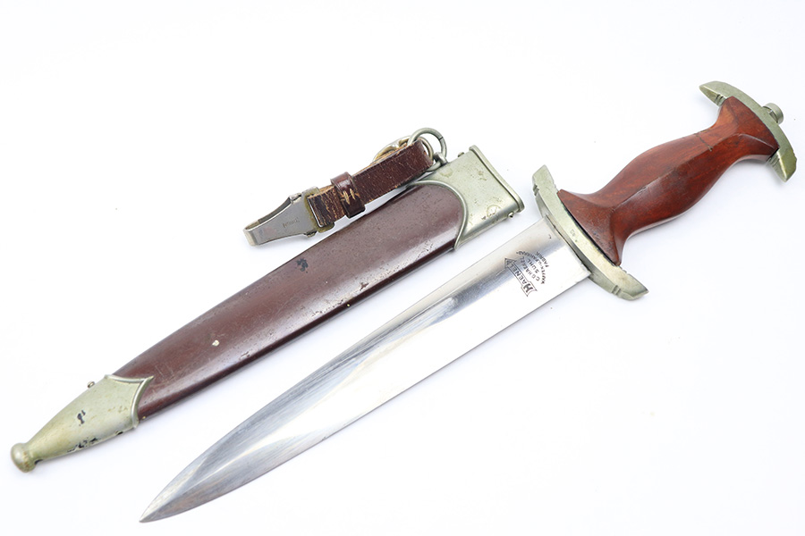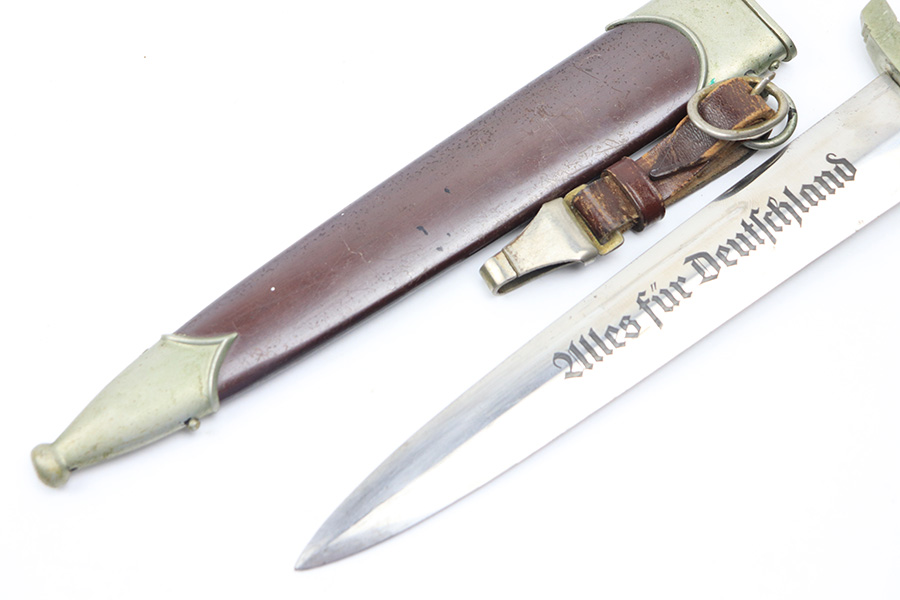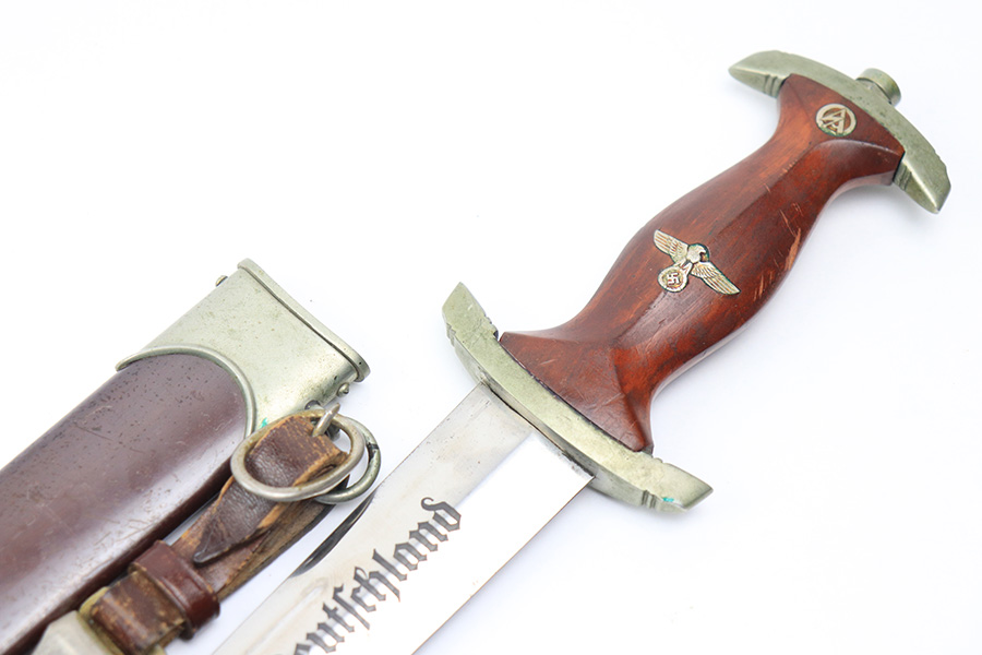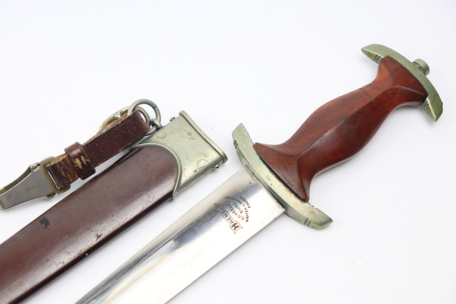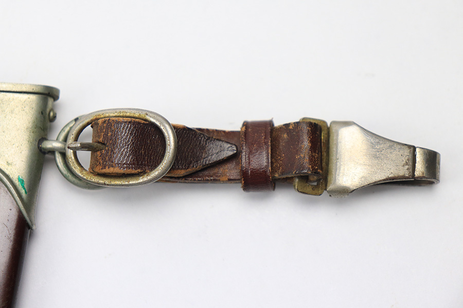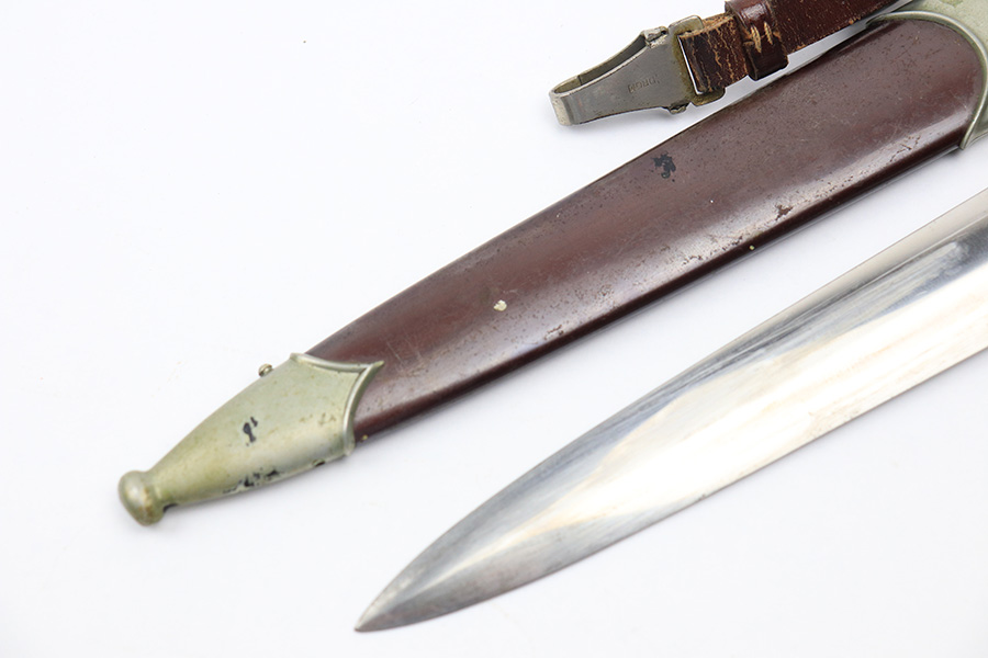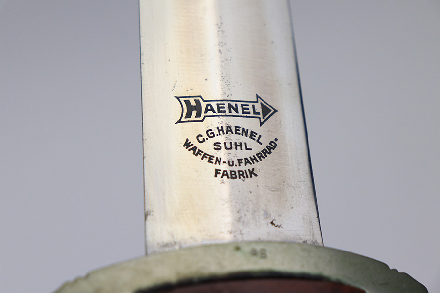 1/18/22 – This is an original SA Dagger from WW2 made by Haenel. Comes with an original scabbard and leather hanger. The blade is clean and in great condition with some mild surface wear from the scabbard and some light surface oxidation in a few areas. Strong maker stamp by Haenel and excellent cross graining. The wood handle has a few small surface blemishes and scratches but no major cracks or issues. Typical patina on the hand guard and pommel. The hand guard is “Sa” stamped for Gruppe Saachsen. The scabbard has no dents and most of the painted finish in tact. One of the screws in the tip of the scabbard is missing. The hanger clip is DRGM stamped.
