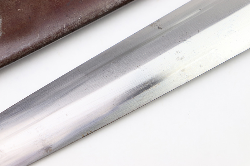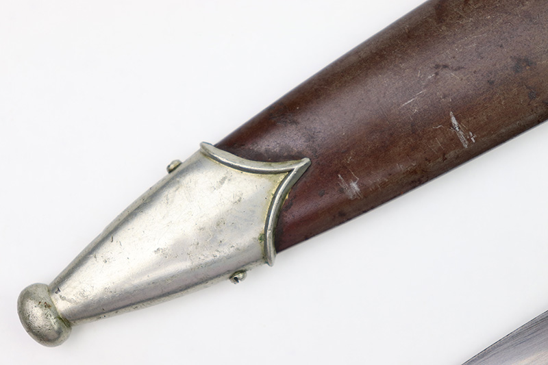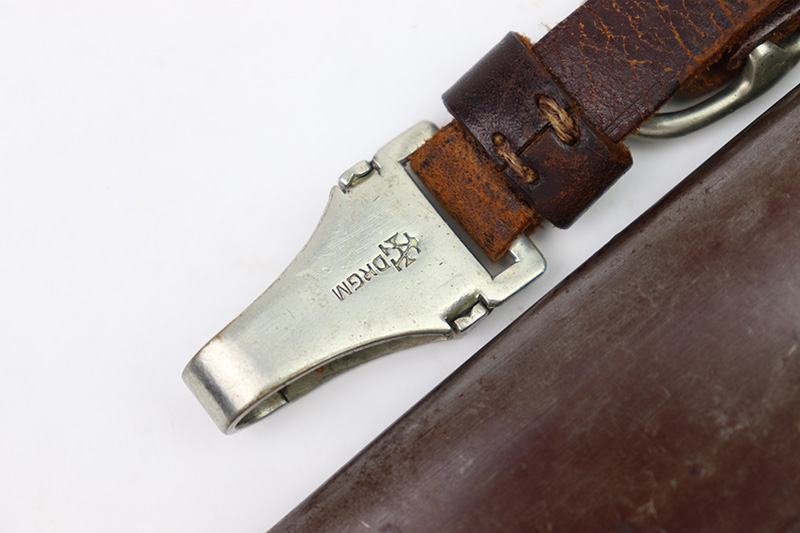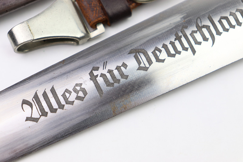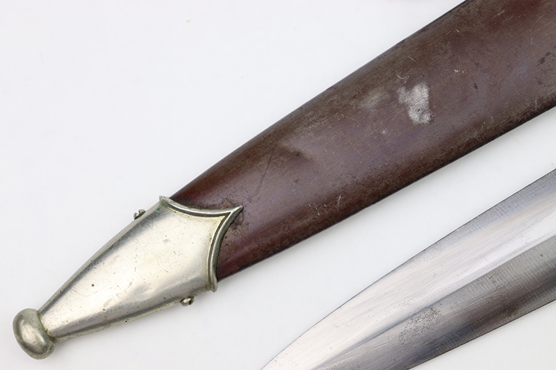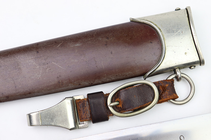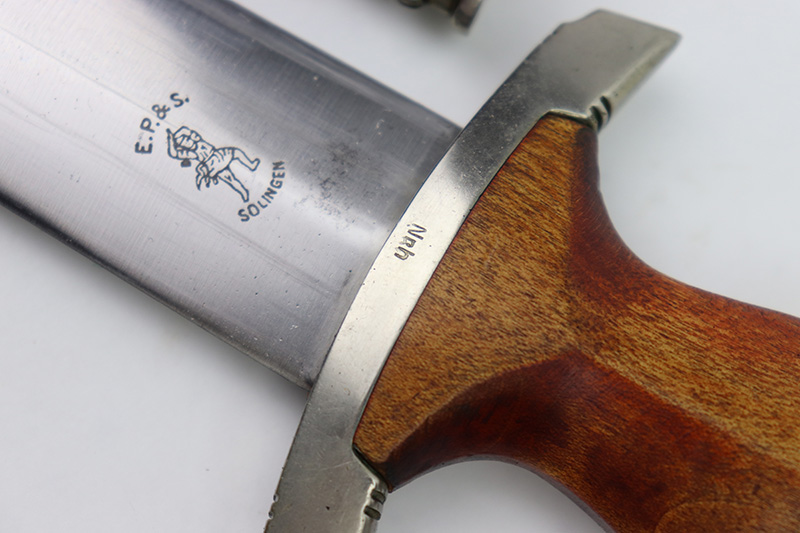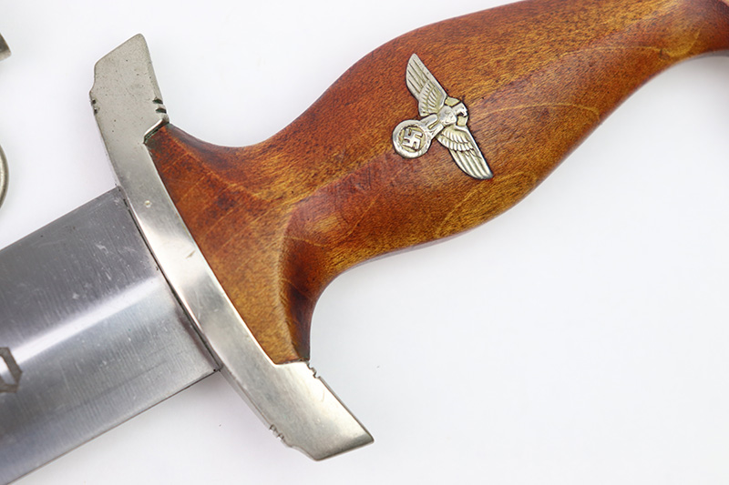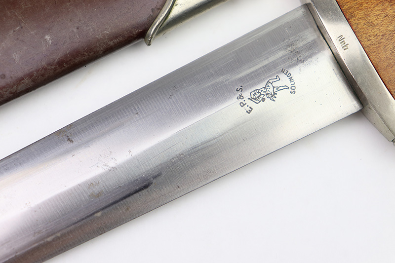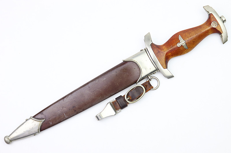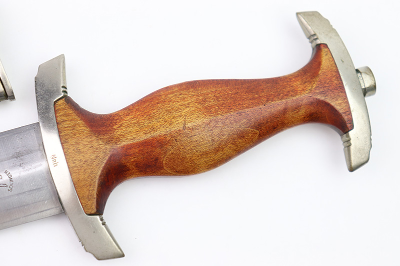 8/18/22 – This is an original SA Dagger by E. Pack & Sohne. The dagger has a relatively clean blade in great overall condition. There’s no signs of sharpening along the edge, and cross graining is visible on each side. There is some spotty discoloration and mild speckling on the blade, as well as surface scratches and scabbard wear. The hand guard is SA Gruppe stamped “Nrh” on one side. The hand guard and pommel are in great condition with mild patina. No cracks or chips in the wood handle. The scabbard is the earlier brown anodized metal style, with thinning throughout and a few mild dings in the metal. The hanger is in good condition and maker stamped by Assmann.