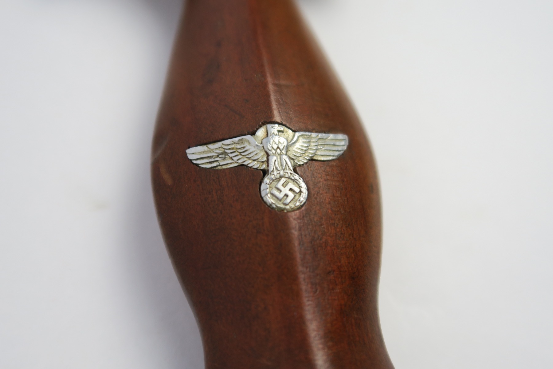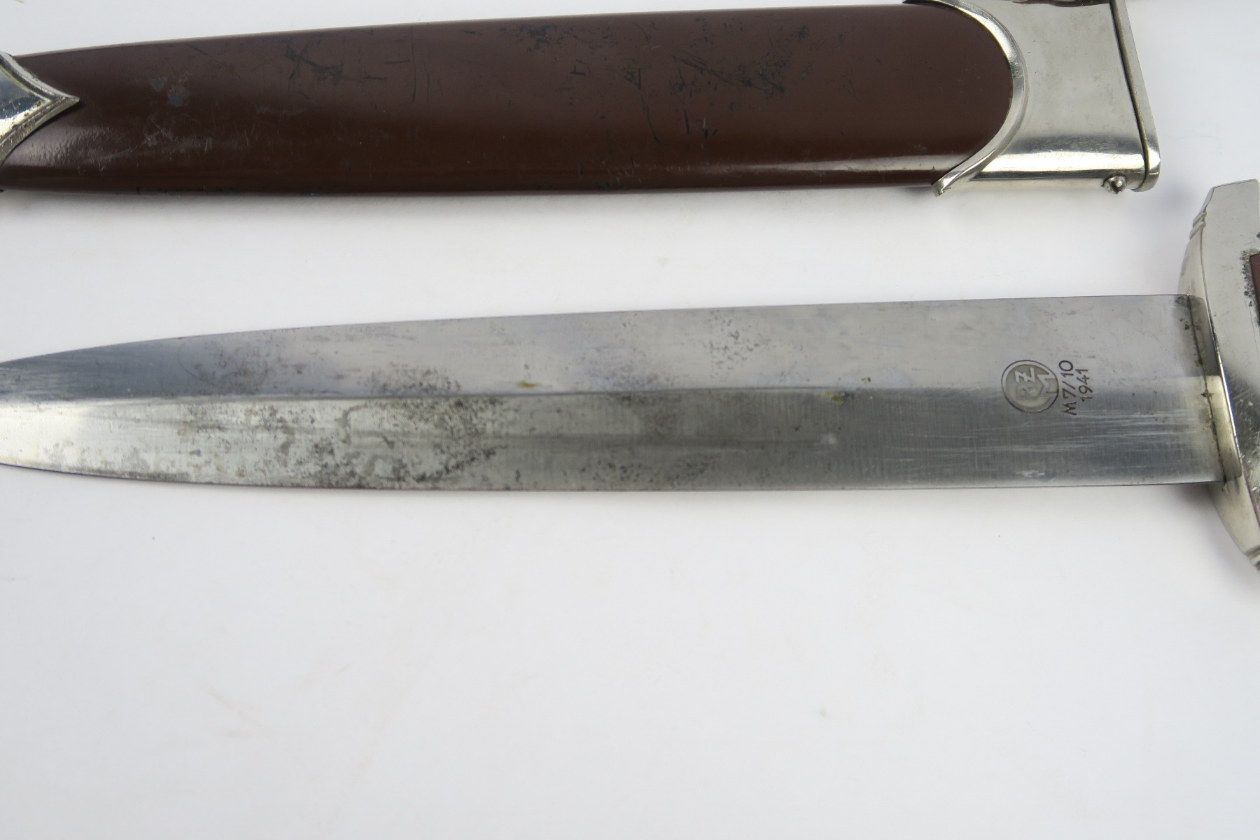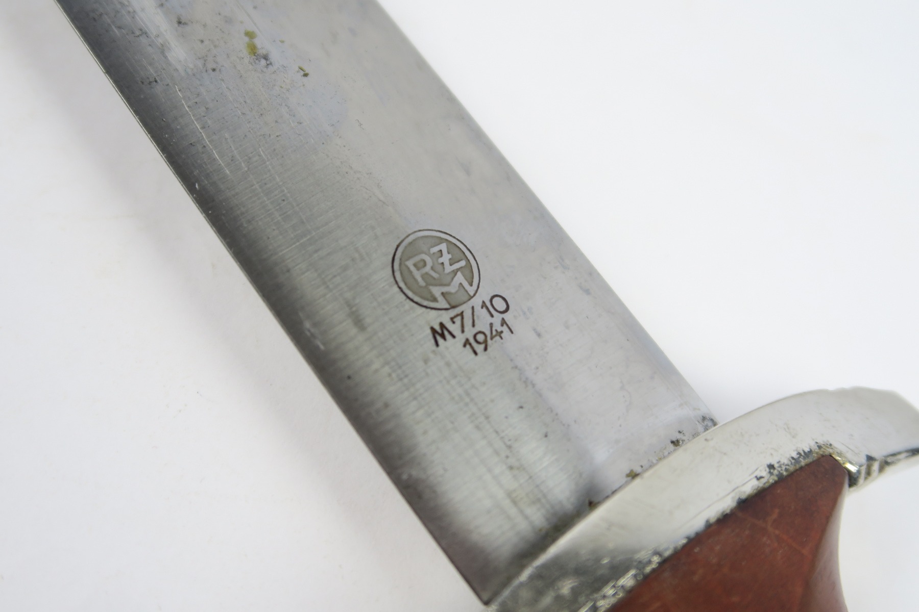 2/12/18 – This is an original WW2 production SA Dagger, complete with the original scabbard and hanger. The blade is maker stamped RZM M7/10 with a 1941 date. The blade has some light spotting, and a few areas of patina, but overall the blade is very nice with no signs of sharpening. The wood handle is excellent with no cracks or chips. The scabbard is in excellent condition and has a leather hanger with a light number stamp “34/41”. The leather is soft and has normal aging/use wear. The hanger is RZM M5/8 stamped. Overall a very nice collector’s SA dagger. The markings are all crisp and guaranteed original.