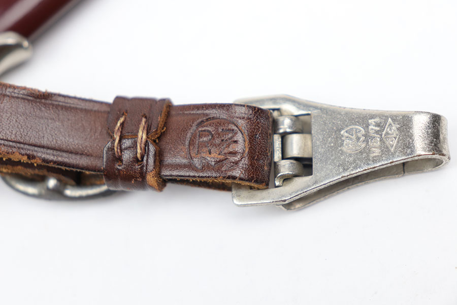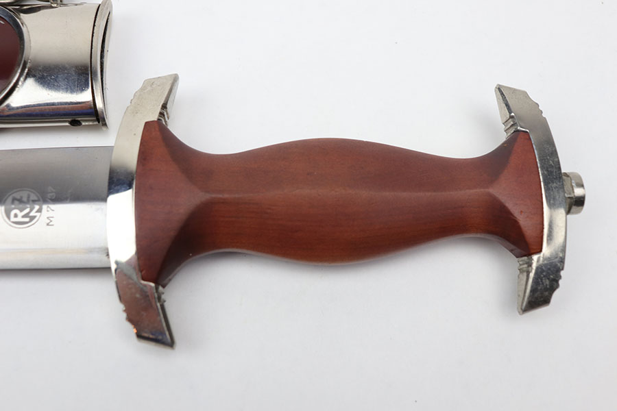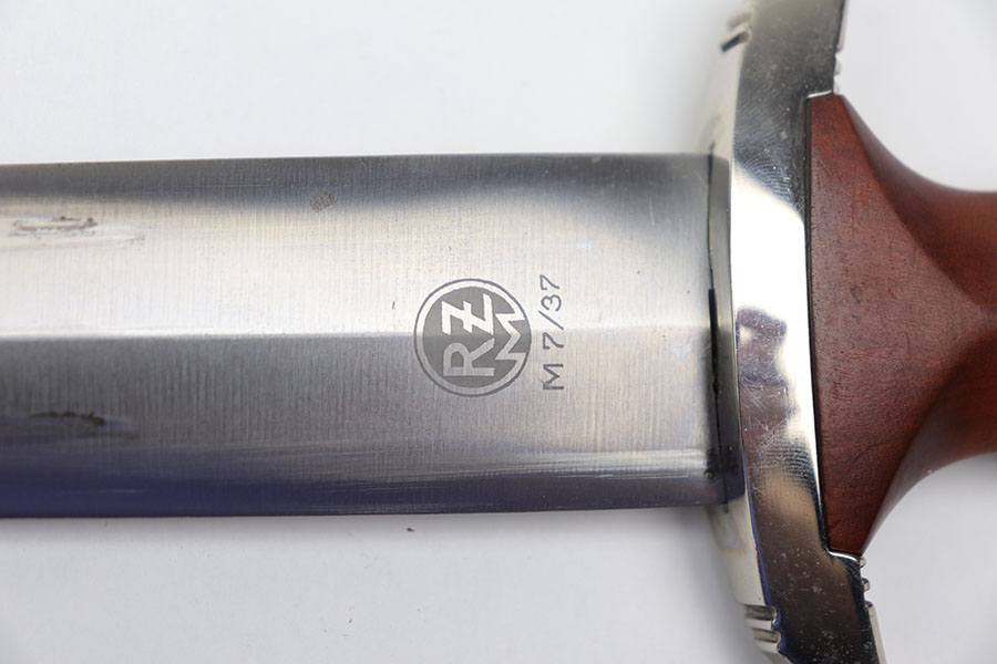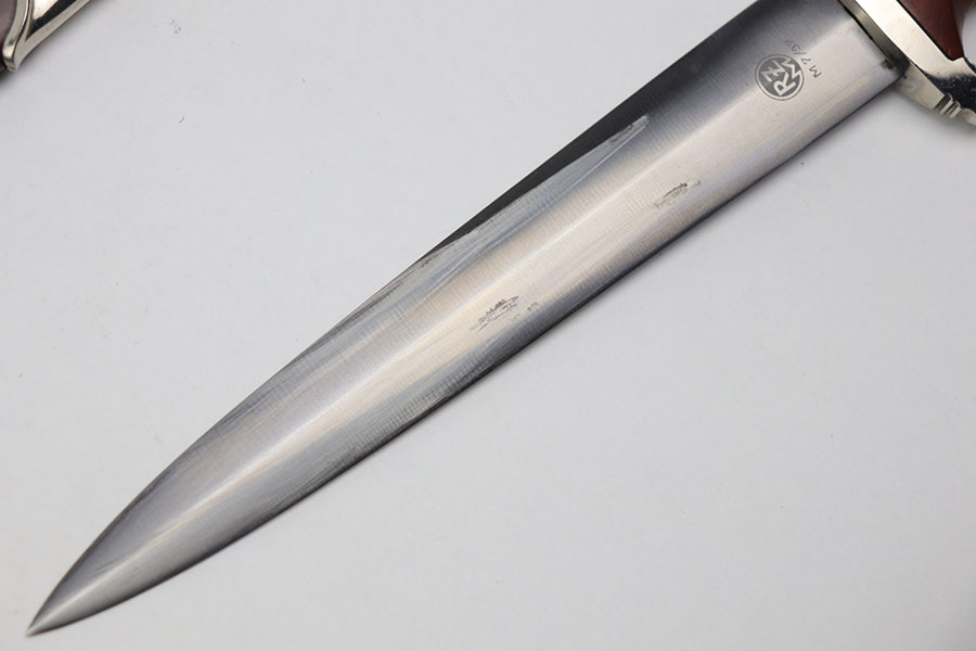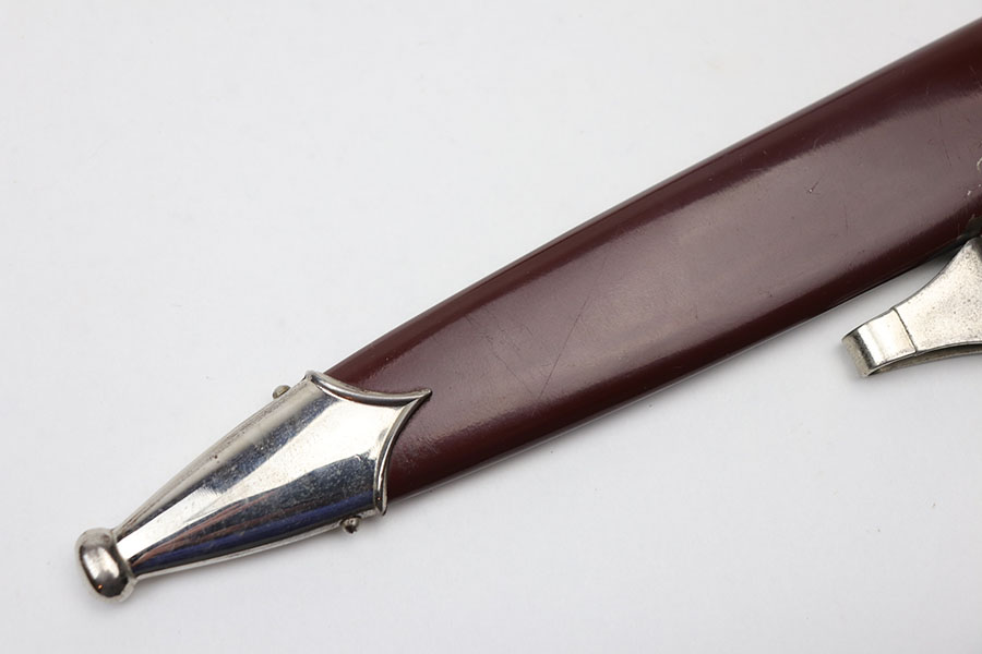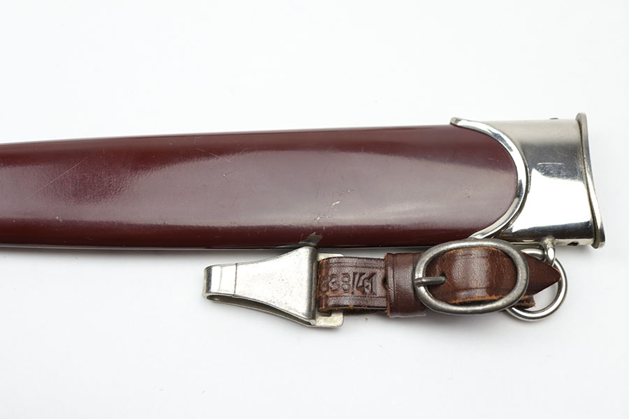 11/19/20 – This is an original SA dagger from WW2 with an original scabbard and belt hanger. The dagger has a clean blade with some light surface scratches from the scabbard. Excellent cross graining and RZM maker stamped. The wood handle is excellent with no cracks or chips. Excellent scabbard as well has almost all the original paint in tact. Two pins are missing from the top fixture of the scabbard (the two pins near the mouth of the scabbard, doesn’t affect functionality nor is it loose). The hanger is RZM maker marked on the leather as well as the metal attachment piece.