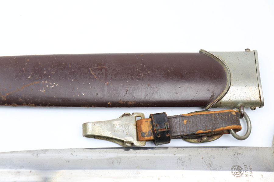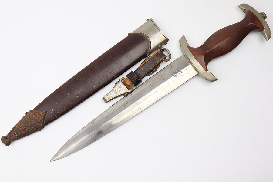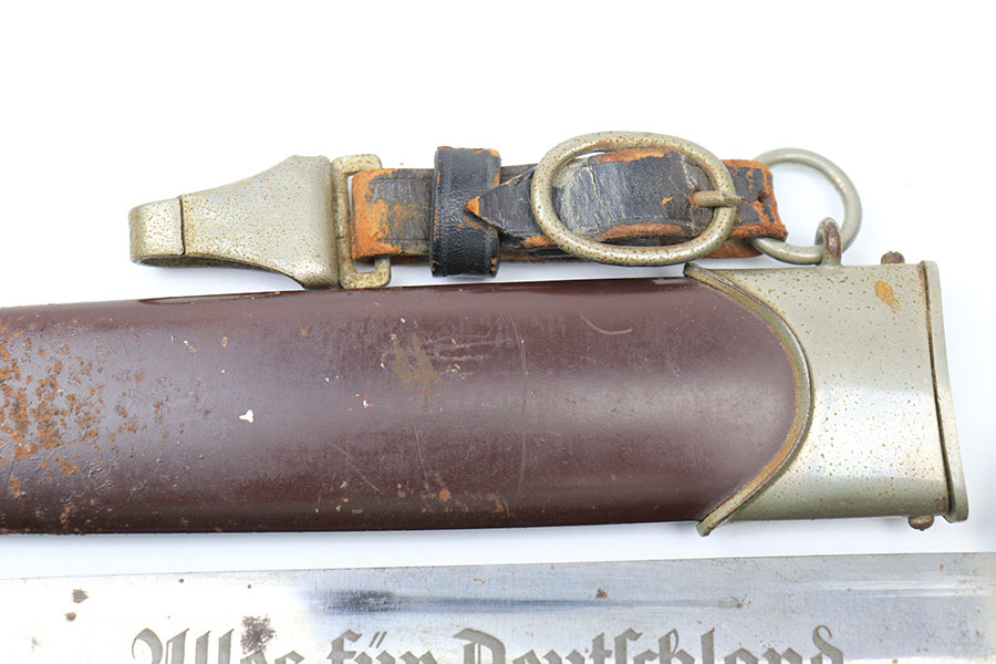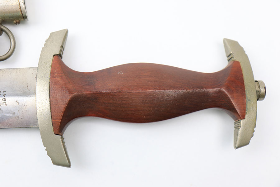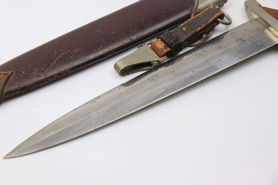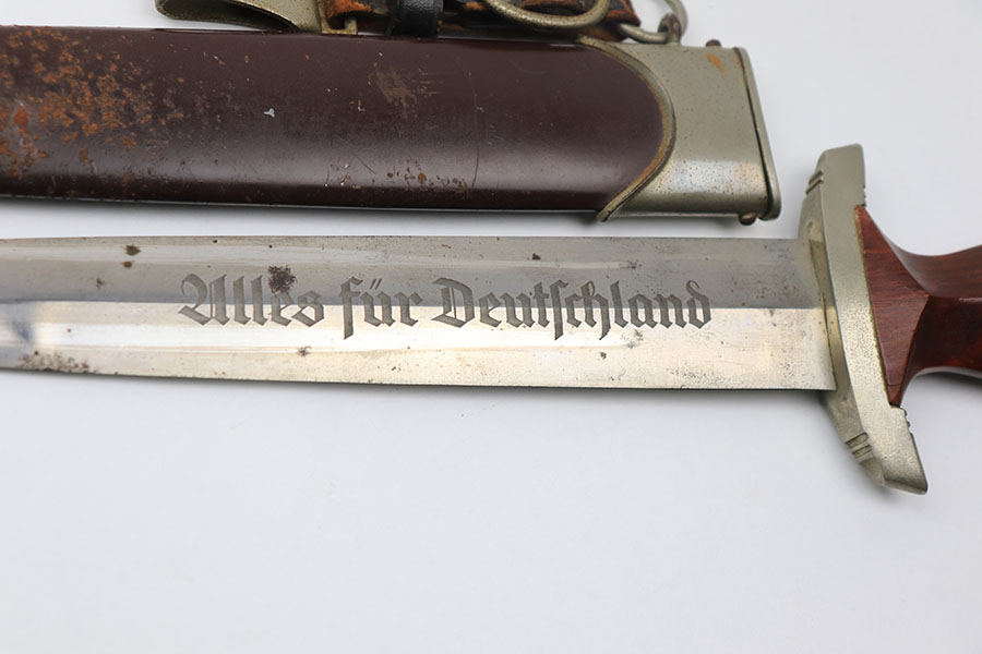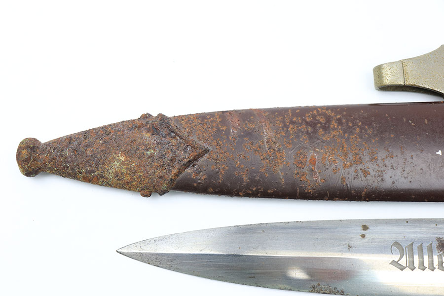 5/13/21 – This is an original SA Dagger with scabbard and hanger. The hanger has some surface cracking on the leather and mild patina throughout the metal fittings. The clasp is RZM marked and maker marked by Assmann. The dagger blade is unsharpened and in good overall condition but there is some surface discoloration in spots. Maker stamped RZM M7/33 for P.u.A. Duenzer and dated 1941. The wood handle has no cracks or chips. The biggest takeaway is the severe rust on the toe of the scabbard. No dents however.