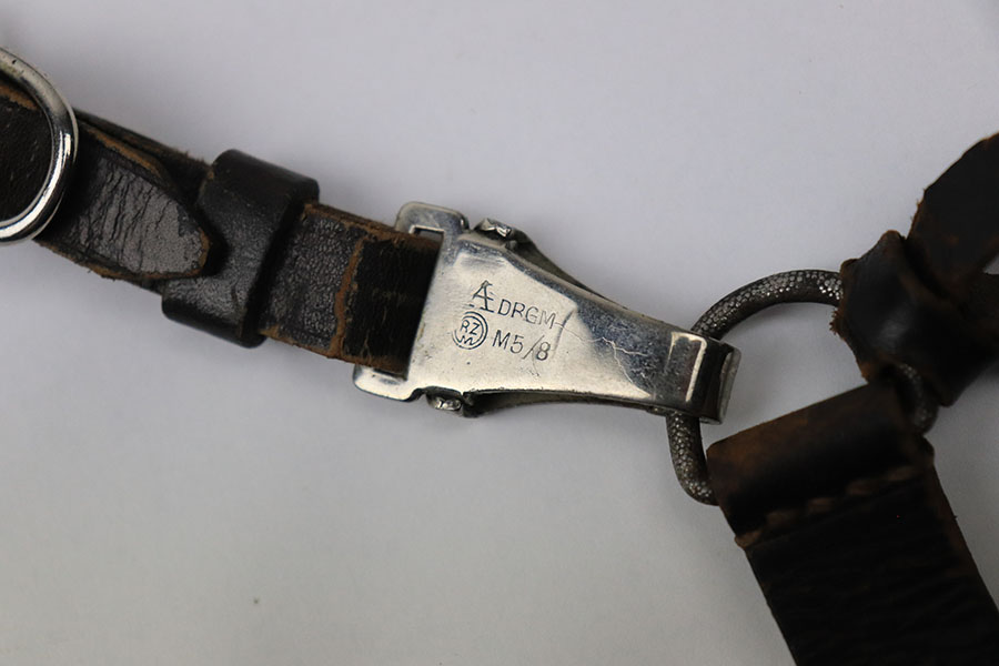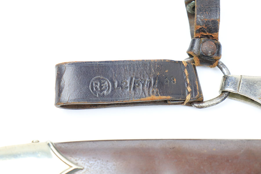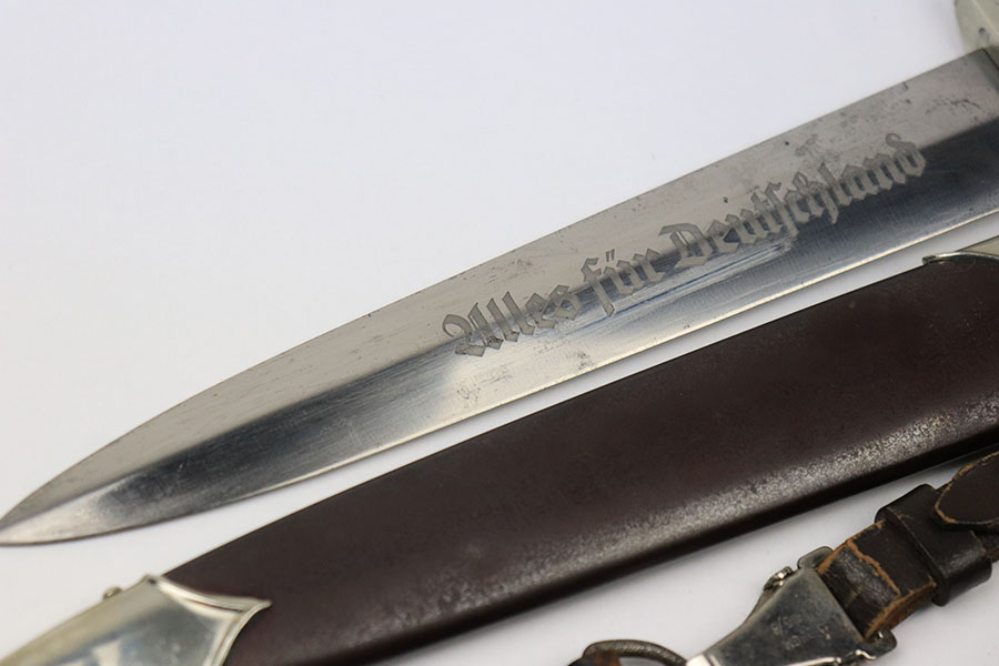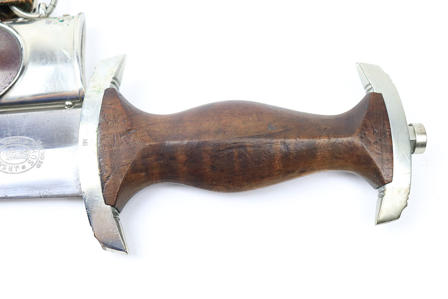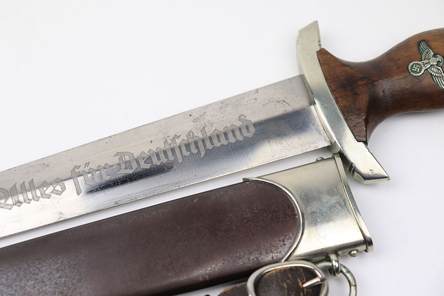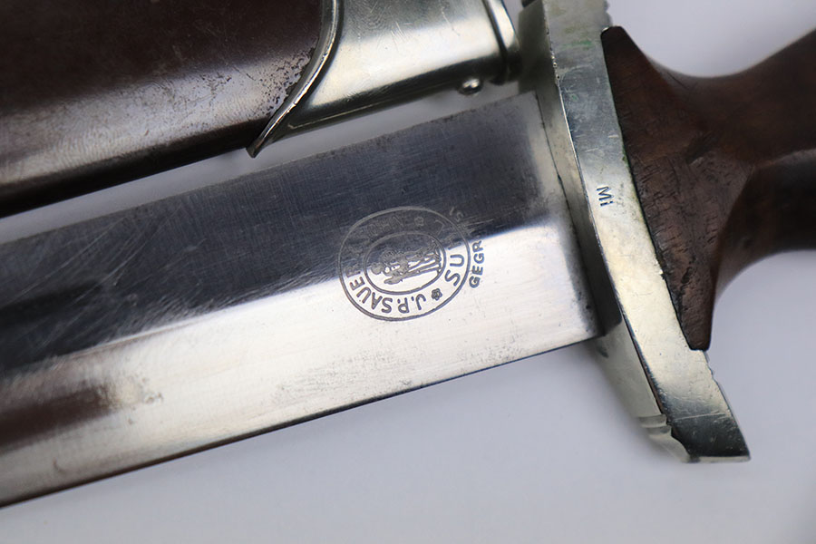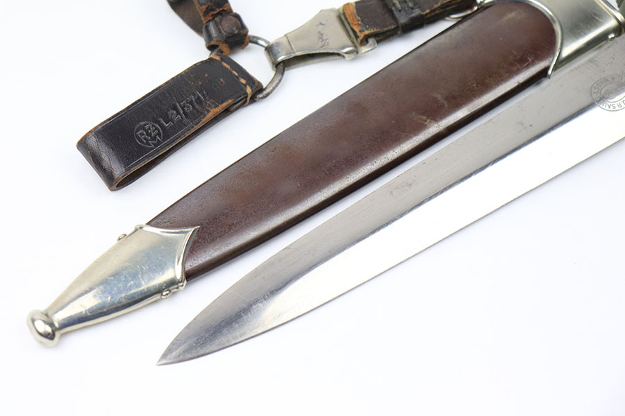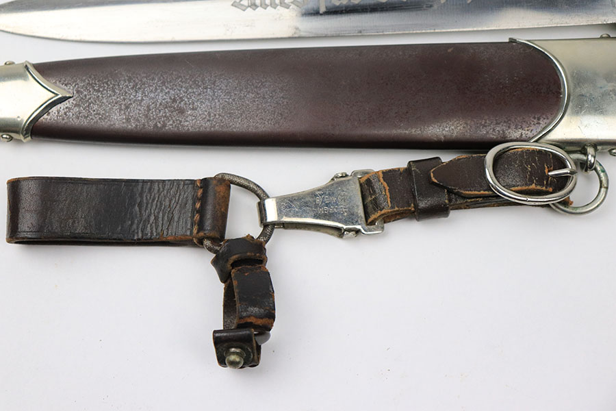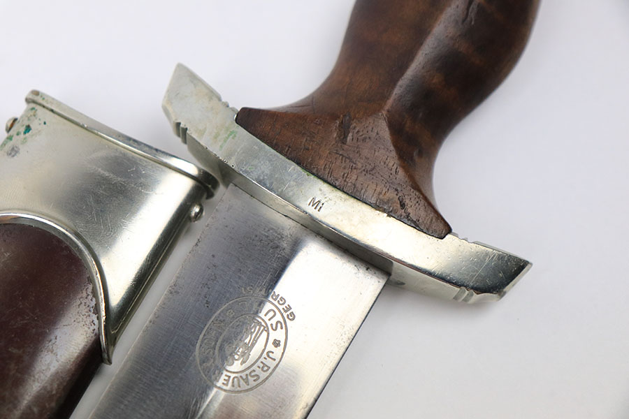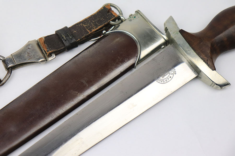 6/18/21 – This is an original SA Dagger made by JP Sauer. The dagger blade is in great condition with some mild oxidation and light surface scratches throughout. The wood handle has no cracks or chips. The hand guard is stamped “Mi” for SA Gruppe Mitte. The scabbard has a few small dents around the toe, and there is minor patina throughout the brown finish. Comes with a very nice leather hanger that is Assmann maker stamped and RZM stamped.