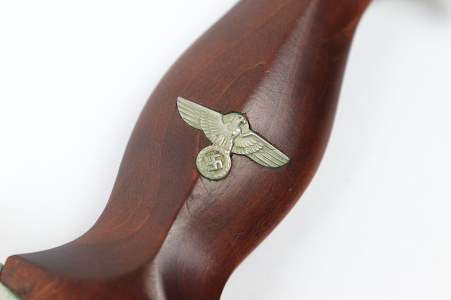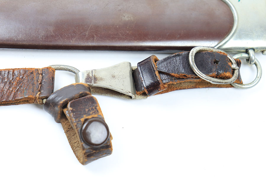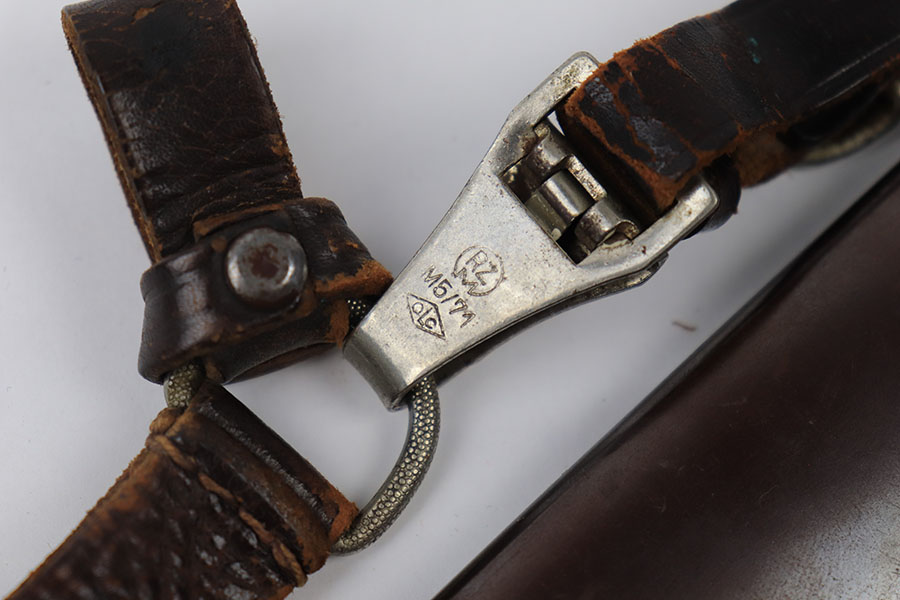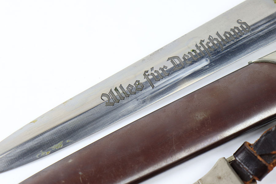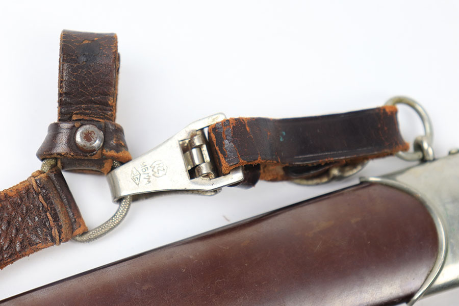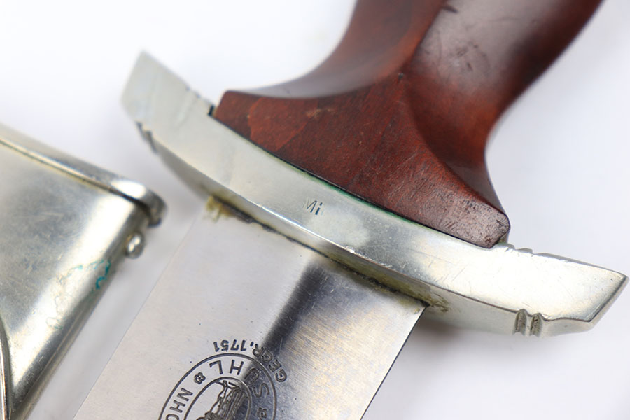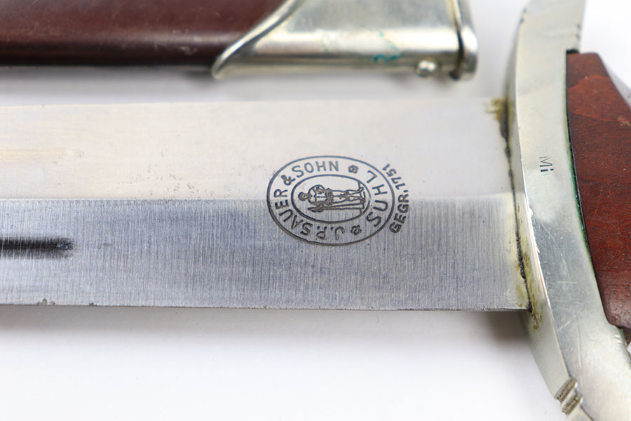 6/30/21 – This is an original JP Sauer & Sohn SA Dagger from WW2. The dagger is in great condition with an excellent blade that is clean and unsharpened. Inscribed on one side and maker marked on the reverse. The handle has no cracks or chips. The hand guard is “Mi” stamped for Gruppe Mitte. The scabbard has one mild dent on one side near the toe, but is in great overall condition. Comes with a hanger that’s RZM maker stamped by OLC.