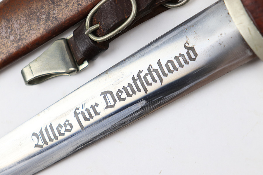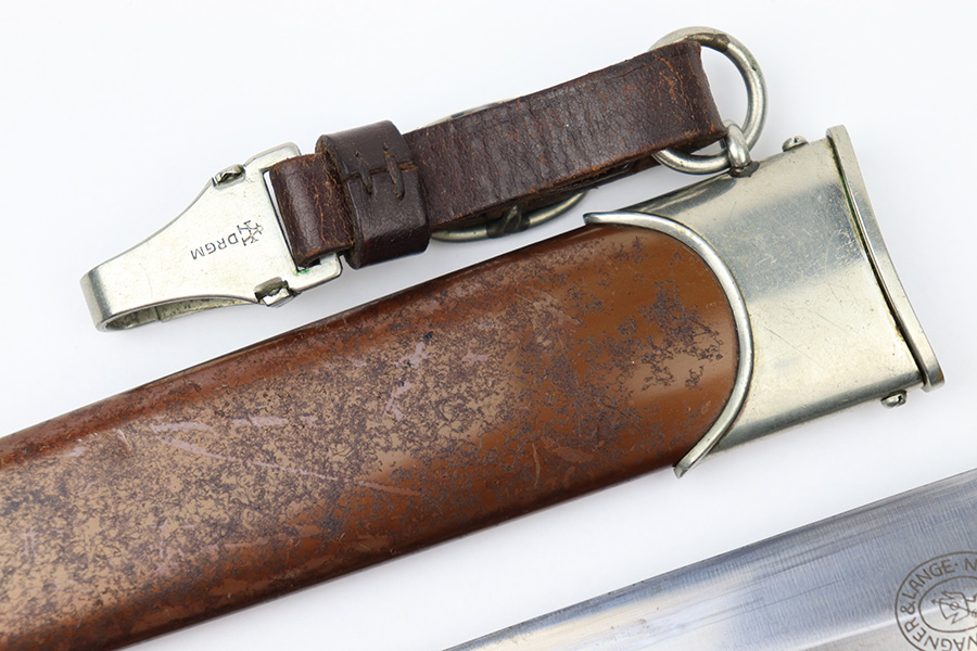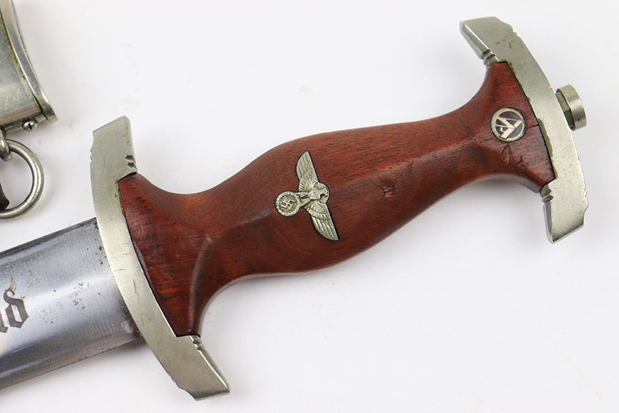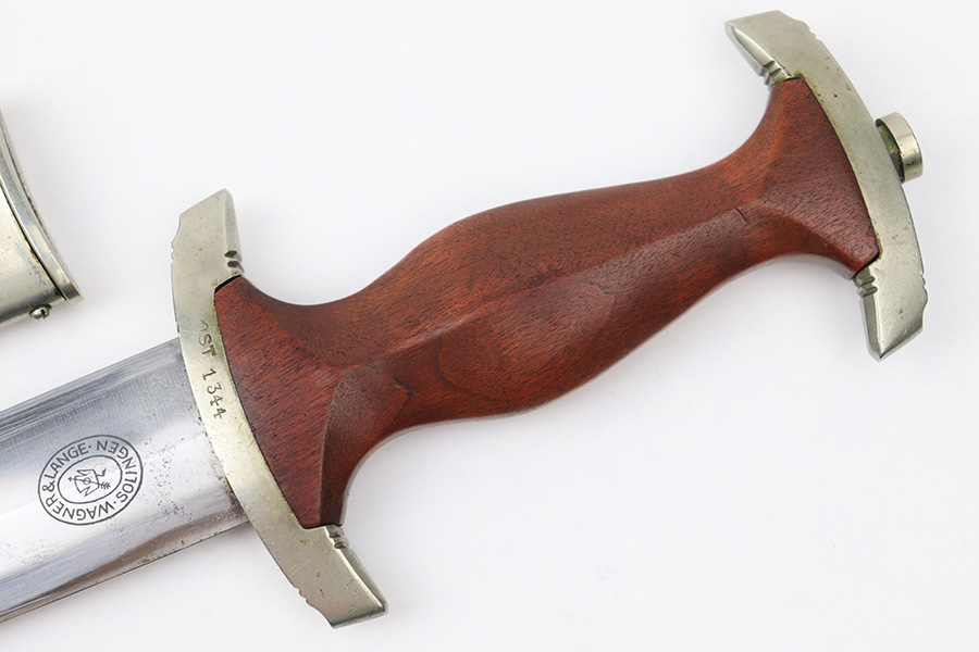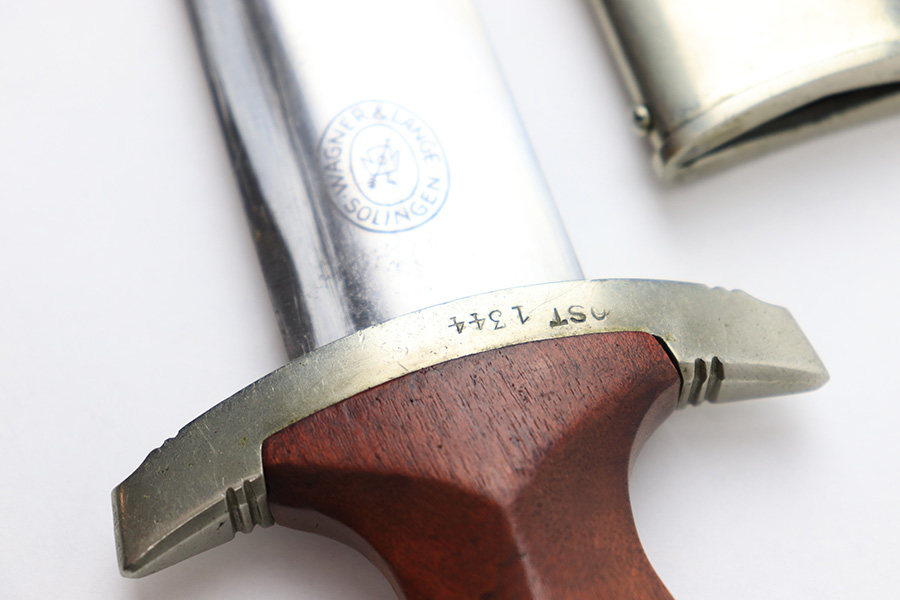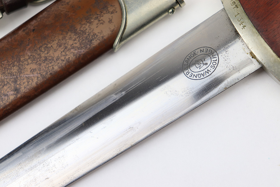 7/19/22 – This is an original WW2 SA Dagger with an original scabbard and hanger. The dagger is in great overall condition with a clean blade that’s maker marked by Wagner & Lange. The blade has some surface wear and discoloration on the tip of the maker’s side of the blade. Otherwise there’s general rub wear and mild surface scratches from the scabbard. Nice visible cross graining. The wood handle has a hairline crack near the “SA” emblem on the front. There’s also a few small indents in the wood, but these are minor. The hand guard is stamped “OST 1344” for a unit or SA group. The scabbard has surface wear throughout the brown anodized scabbard. No notable dents however. The hanger is in great condition and maker marked by Assmann.