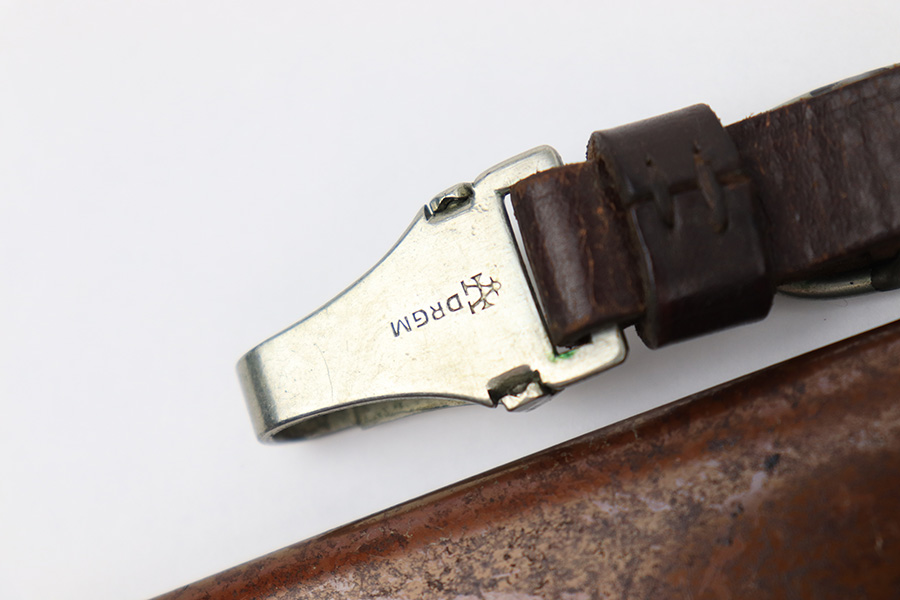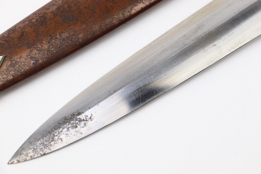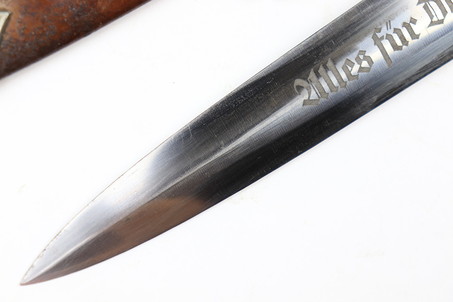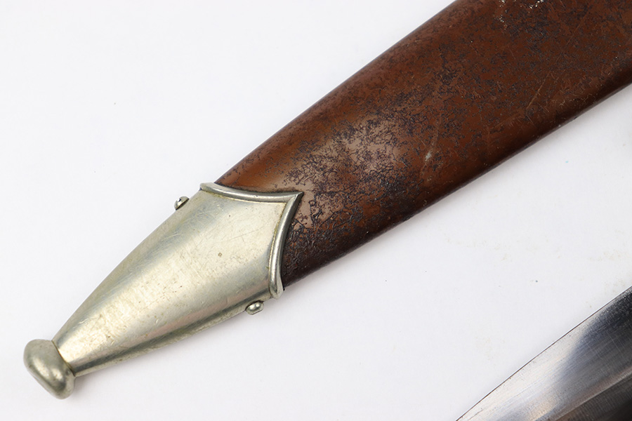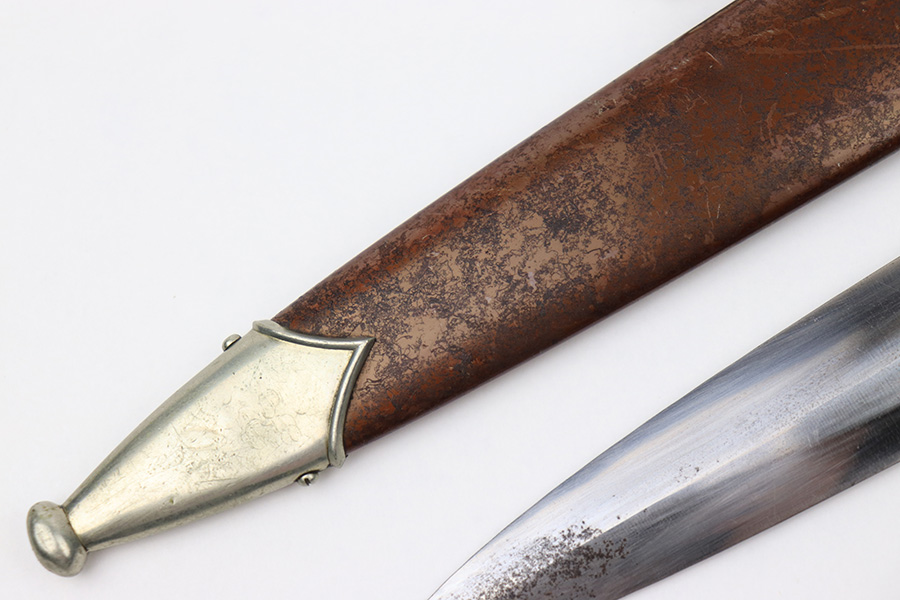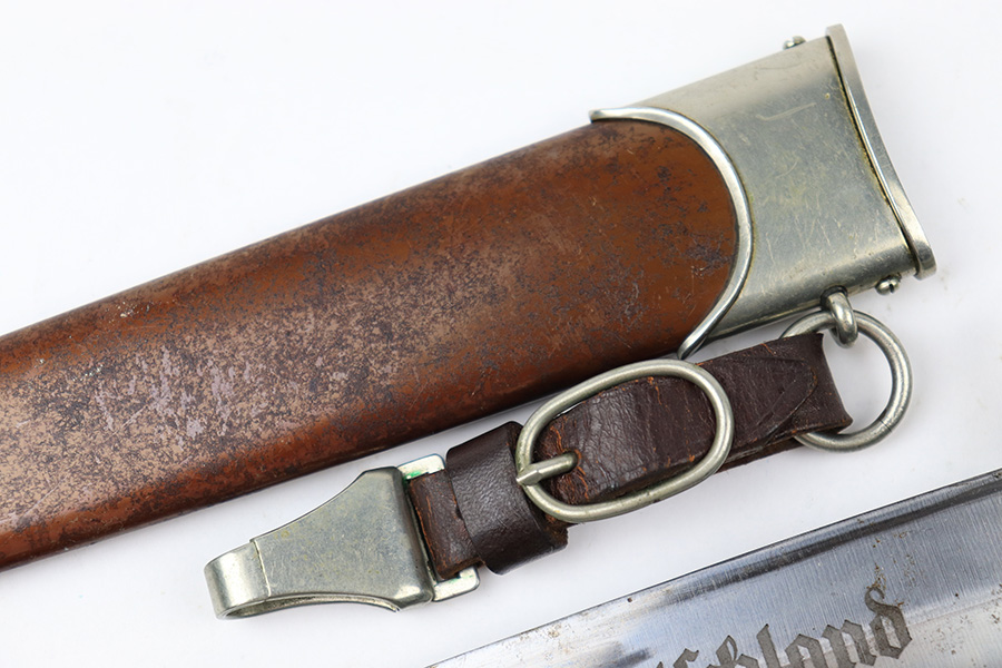 7/19/22 – This is an original WW2 SA Dagger with an original scabbard and hanger. The dagger is in great overall condition with a clean blade that’s maker marked by Wagner & Lange. The blade has some surface wear and discoloration on the tip of the maker’s side of the blade. Otherwise there’s general rub wear and mild surface scratches from the scabbard. Nice visible cross graining. The wood handle has a hairline crack near the “SA” emblem on the front. There’s also a few small indents in the wood, but these are minor. The hand guard is stamped “OST 1344” for a unit or SA group. The scabbard has surface wear throughout the brown anodized scabbard. No notable dents however. The hanger is in great condition and maker marked by Assmann.