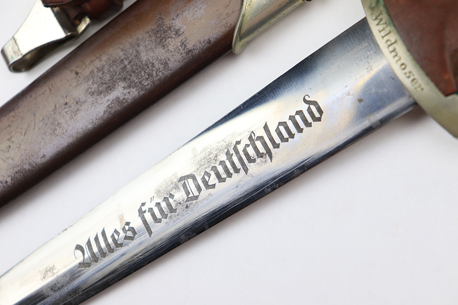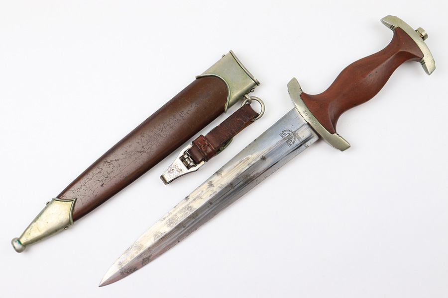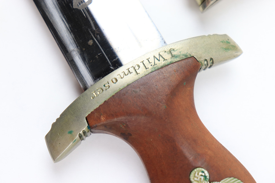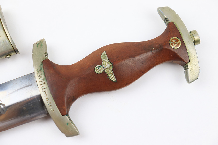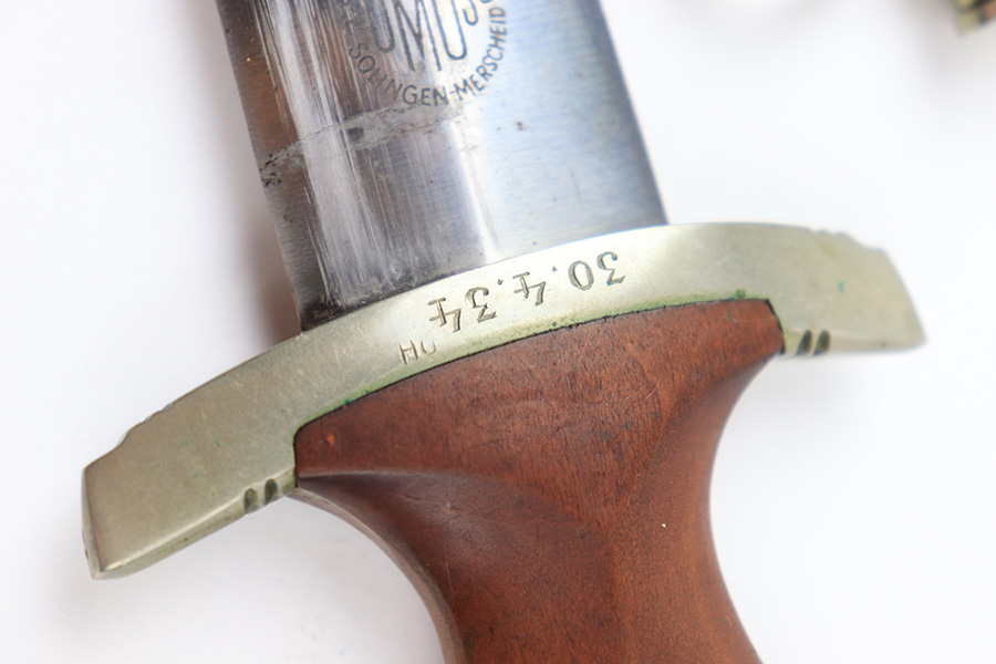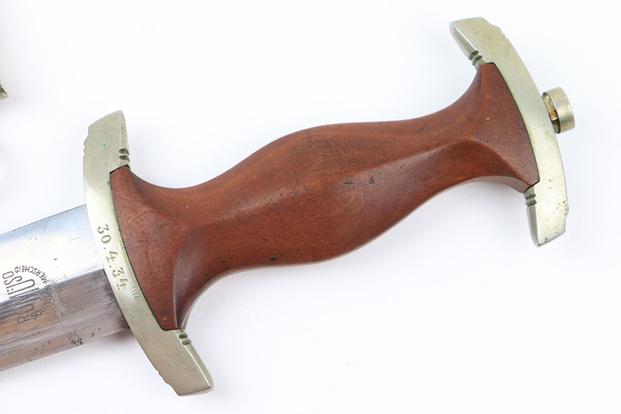 7/14/22 – This is an original, early SA dagger with an original scabbard and hanger. The hand guard of the dagger is dedicated to “J. Wildmoser” on one side, and dated “30.4.34” on the other. The date side also has a small factory “OH” gruppe stamp as well. The dedication on the hand guard appears professionally added and shows wear congruent with the rest of the piece, telling us that this is an original dedication from 1934. A very cool piece of history. The dagger blade has a few small chips along the upper edge, and there are spots of oxidation & surface wear throughout. The wood handle is in great condition with no cracks or chips. The scabbard is the early anodized metal style. There is some mild patina throughout and a small dent near the tip. The hanger is original and unmarked.