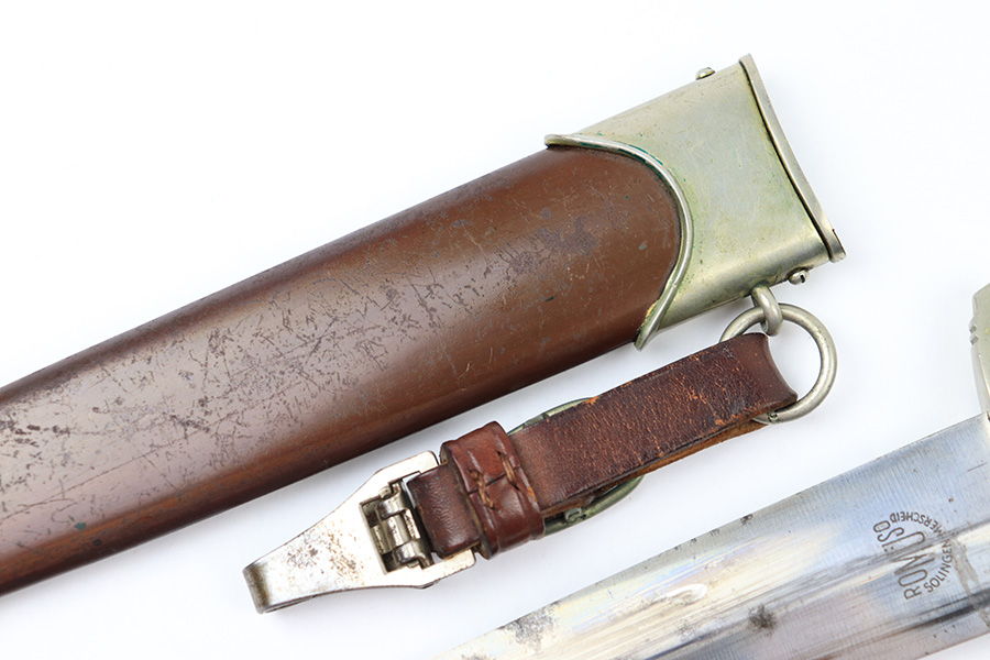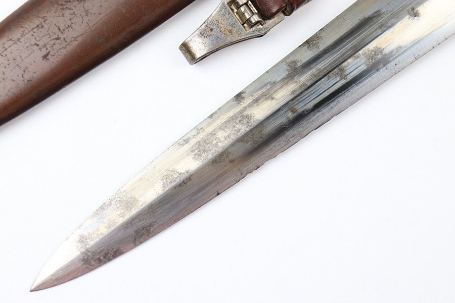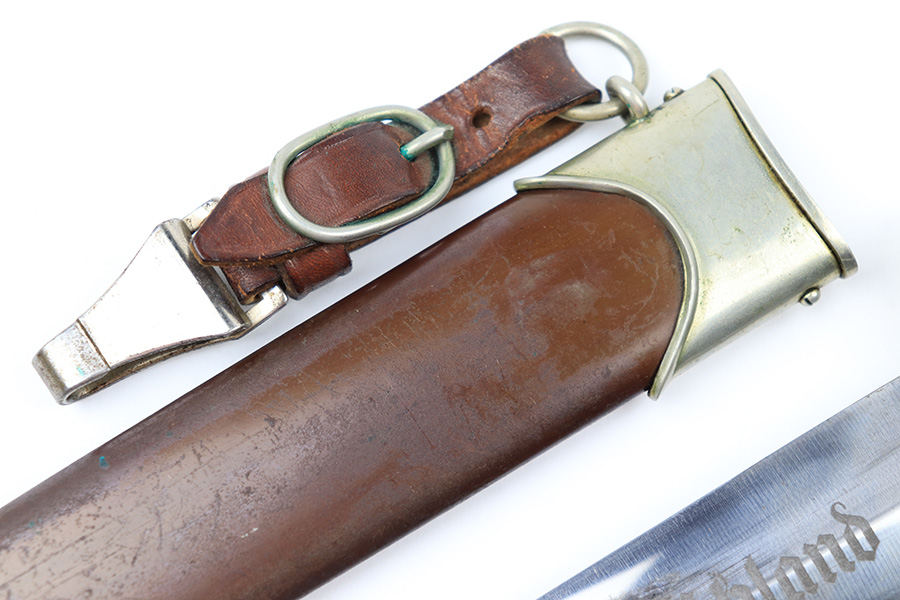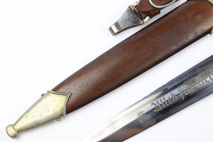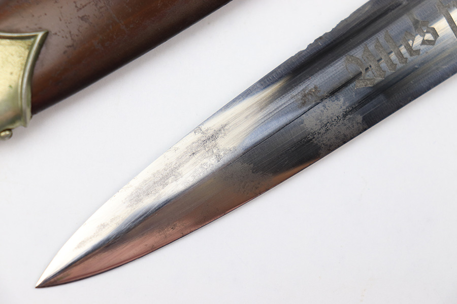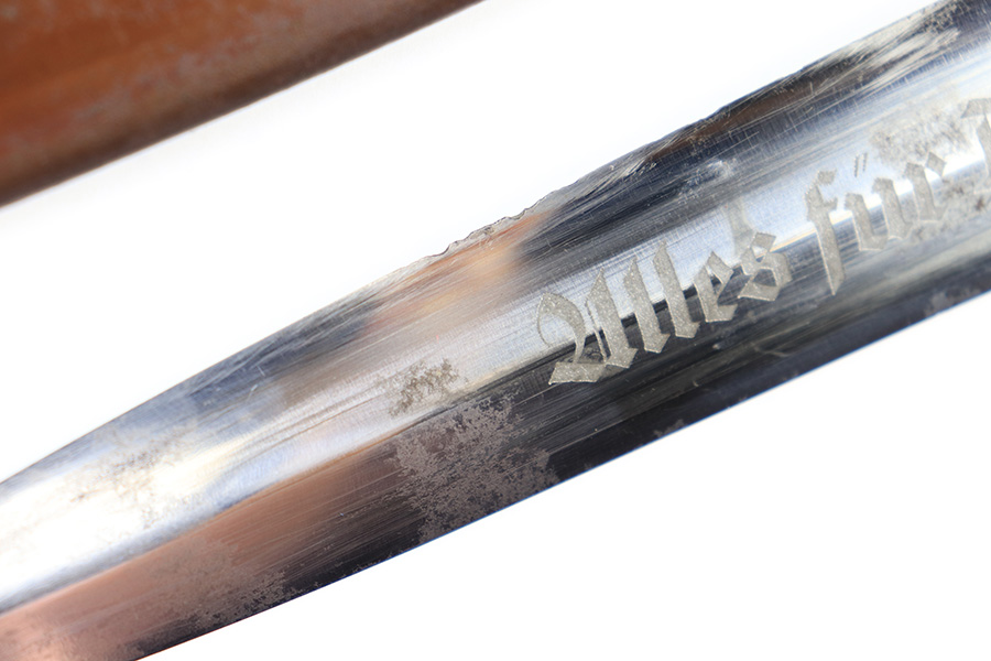 7/14/22 – This is an original, early SA dagger with an original scabbard and hanger. The hand guard of the dagger is dedicated to “J. Wildmoser” on one side, and dated “30.4.34” on the other. The date side also has a small factory “OH” gruppe stamp as well. The dedication on the hand guard appears professionally added and shows wear congruent with the rest of the piece, telling us that this is an original dedication from 1934. A very cool piece of history. The dagger blade has a few small chips along the upper edge, and there are spots of oxidation & surface wear throughout. The wood handle is in great condition with no cracks or chips. The scabbard is the early anodized metal style. There is some mild patina throughout and a small dent near the tip. The hanger is original and unmarked.