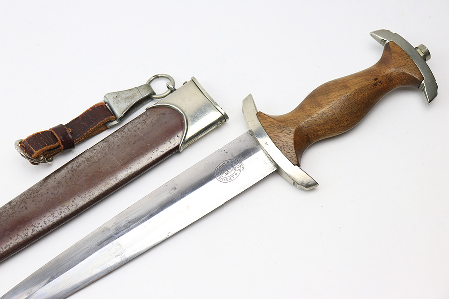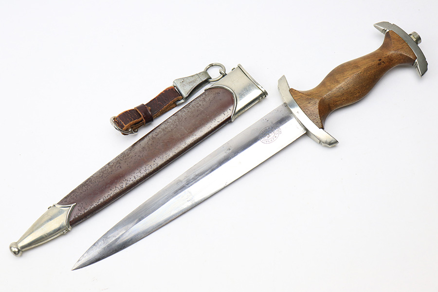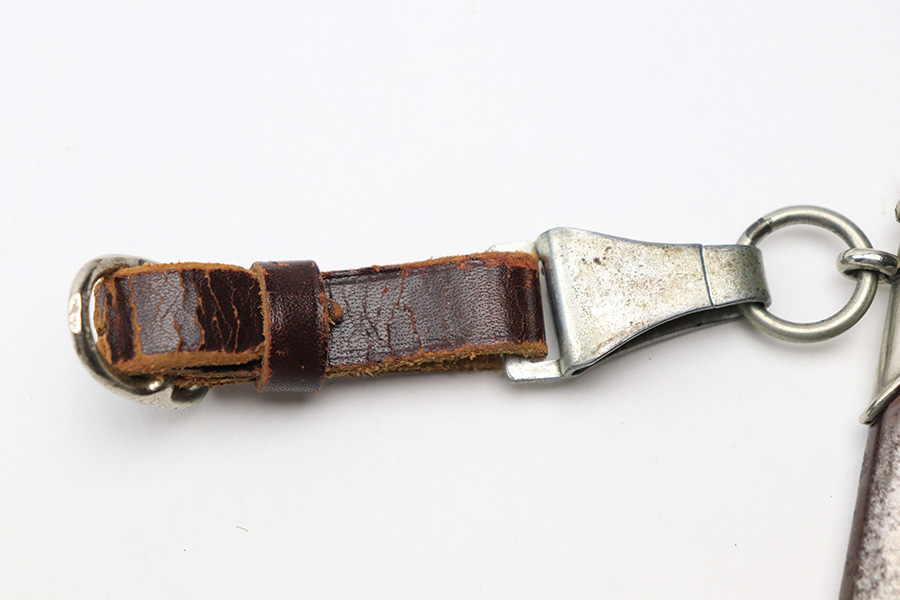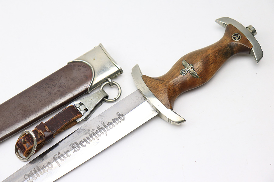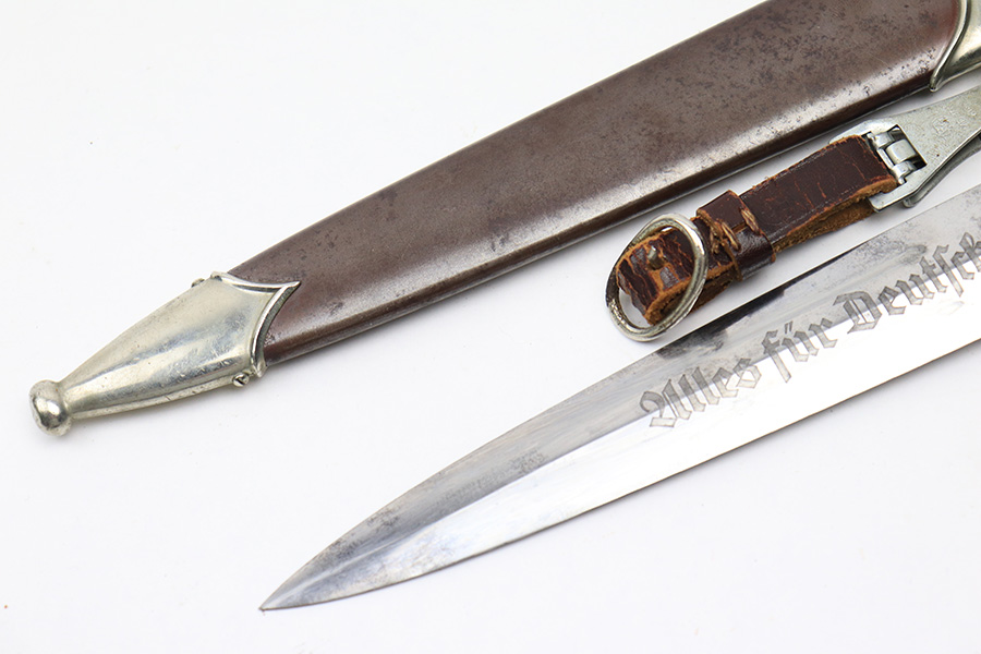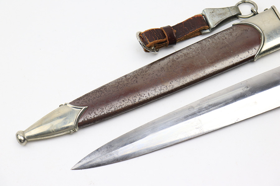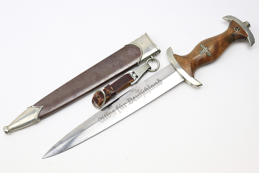 5/11/22 – This is an original SA dagger with original scabbard and leather hanger. The hanger is RZM stamped on the metal clip, and maker stamped by OLC. The metal fastening ring is also RZM M5/71 stamped on the edge of the ring. The dagger blade is in good condition with some mild oxidation, mostly around the tip. There’s some surface discoloration in the “Alles fur Deutschland” inscription as well as discoloration in various other small spots. The maker stamp is crisp and the cross graining is evident throughout the blade. The wood handle has no cracks or chips. The hand guard has a “M” group designation stamp. The scabbard is brown anodized metal with surface patina throughout but no dents or major issues.