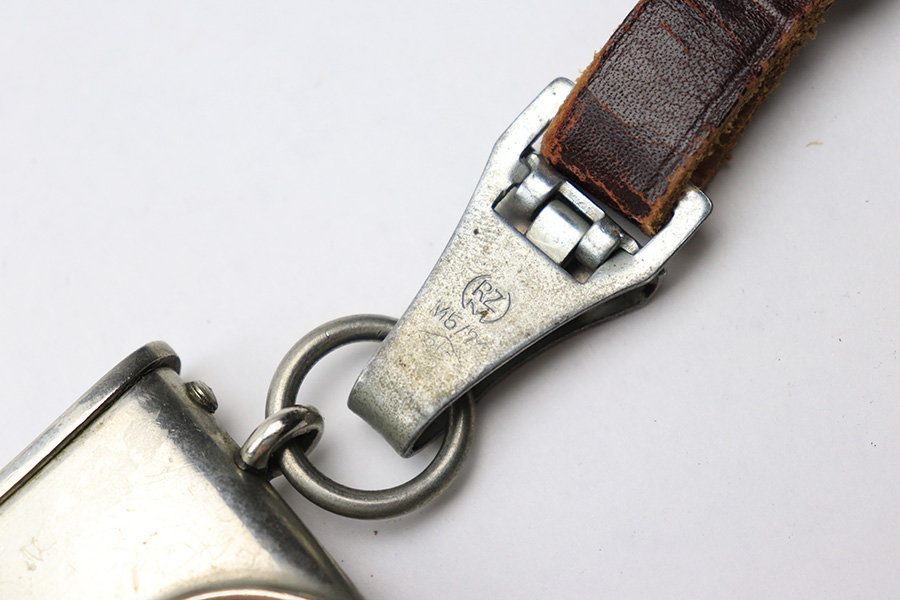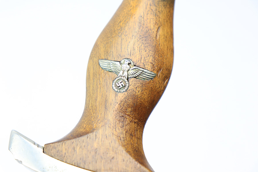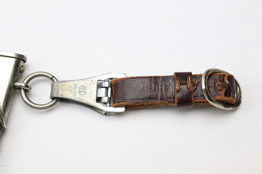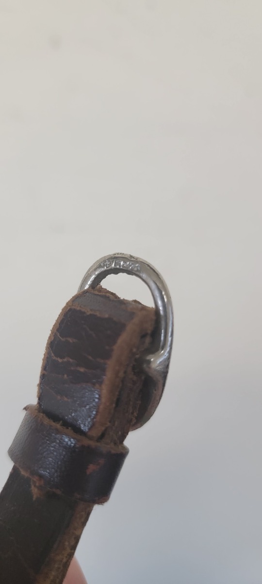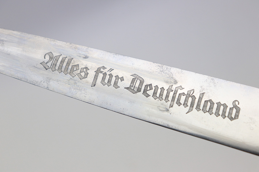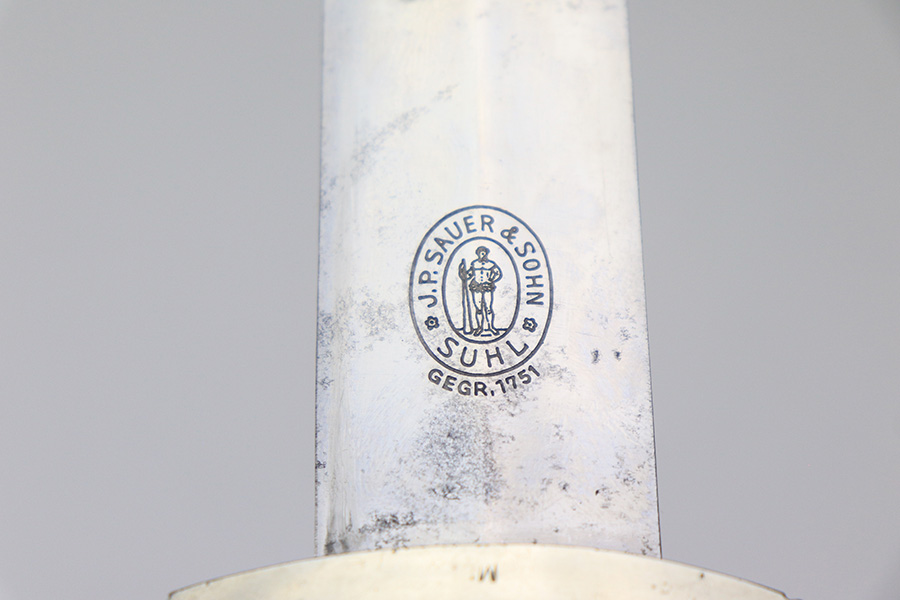 5/11/22 – This is an original SA dagger with original scabbard and leather hanger. The hanger is RZM stamped on the metal clip, and maker stamped by OLC. The metal fastening ring is also RZM M5/71 stamped on the edge of the ring. The dagger blade is in good condition with some mild oxidation, mostly around the tip. There’s some surface discoloration in the “Alles fur Deutschland” inscription as well as discoloration in various other small spots. The maker stamp is crisp and the cross graining is evident throughout the blade. The wood handle has no cracks or chips. The hand guard has a “M” group designation stamp. The scabbard is brown anodized metal with surface patina throughout but no dents or major issues.