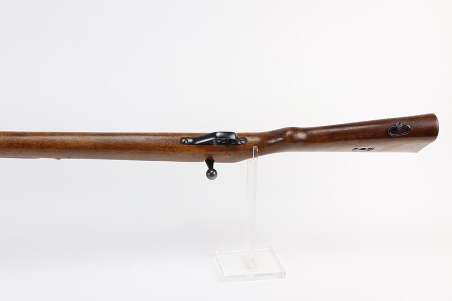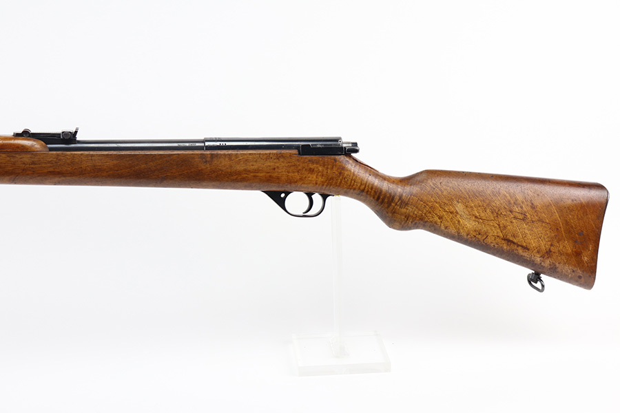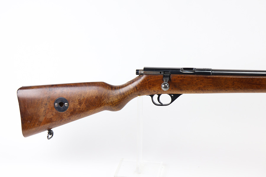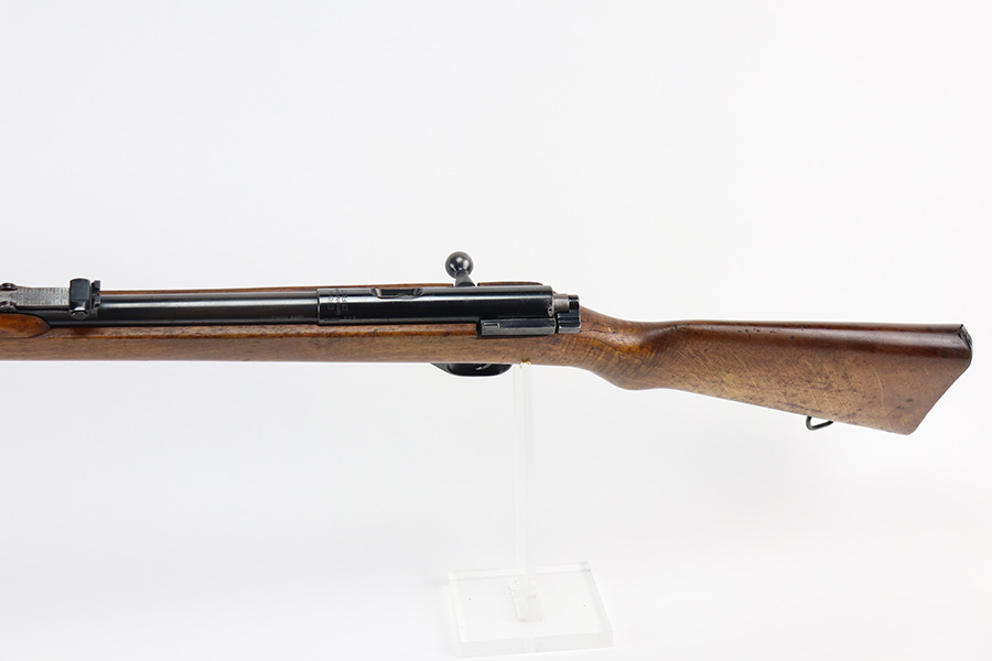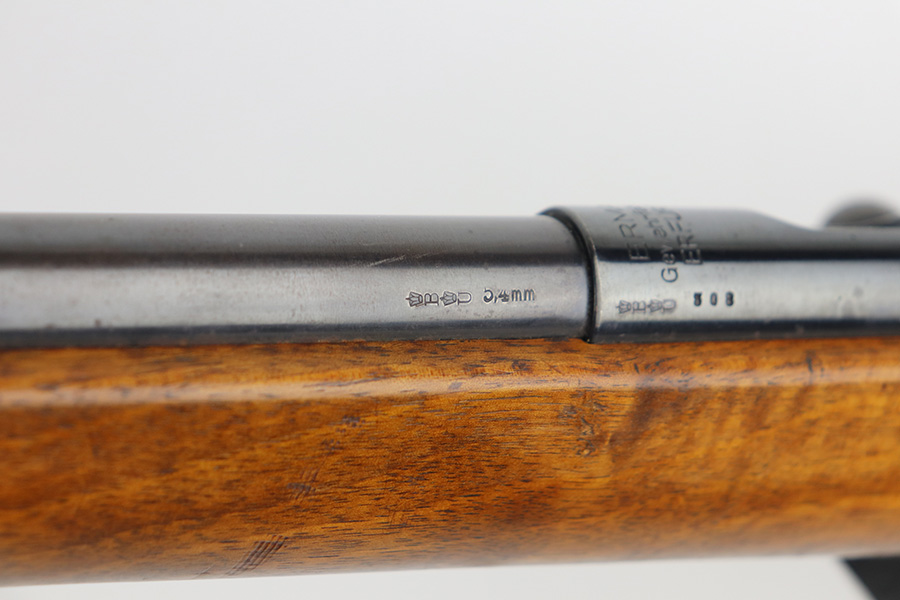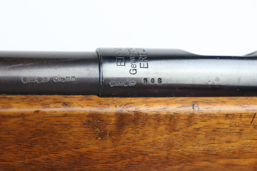 5/28/21 – This is an excellent example of a rare Erma Sportmodell training rifle, chambered .22 LR. This gun was designed for the Nazi military and paramilitary organizations but was not adopted. As a result, less than 1,000 were made. These guns are generally thought to have gone to the SA as many have been observed with SA markings. What makes the gun unique is the takedown button on the stock. This one is all matching and has “Crown B U” proofs. The gun is excellent. It has retained virtually all of its original high polish blue with minor handling marks here and there. The stock is excellent with minor dings and scratches throughout. There is a notable crack in the top of the stock just behind the action. The top layer of wood is separating there, though does not go all the way through. The bore is mint.