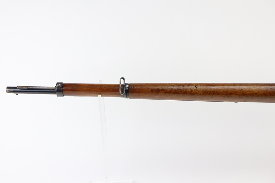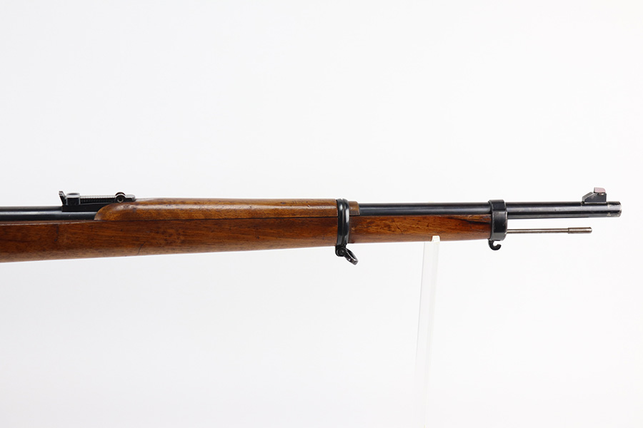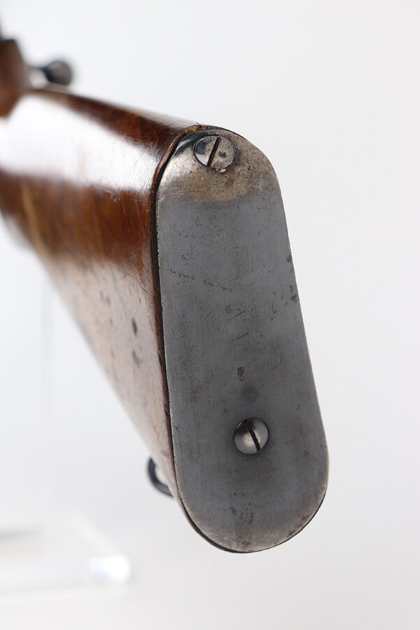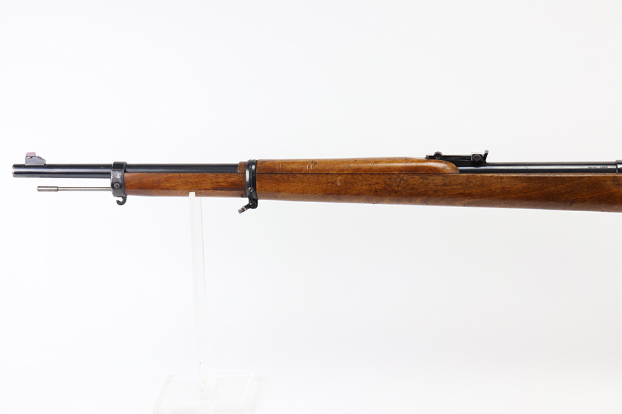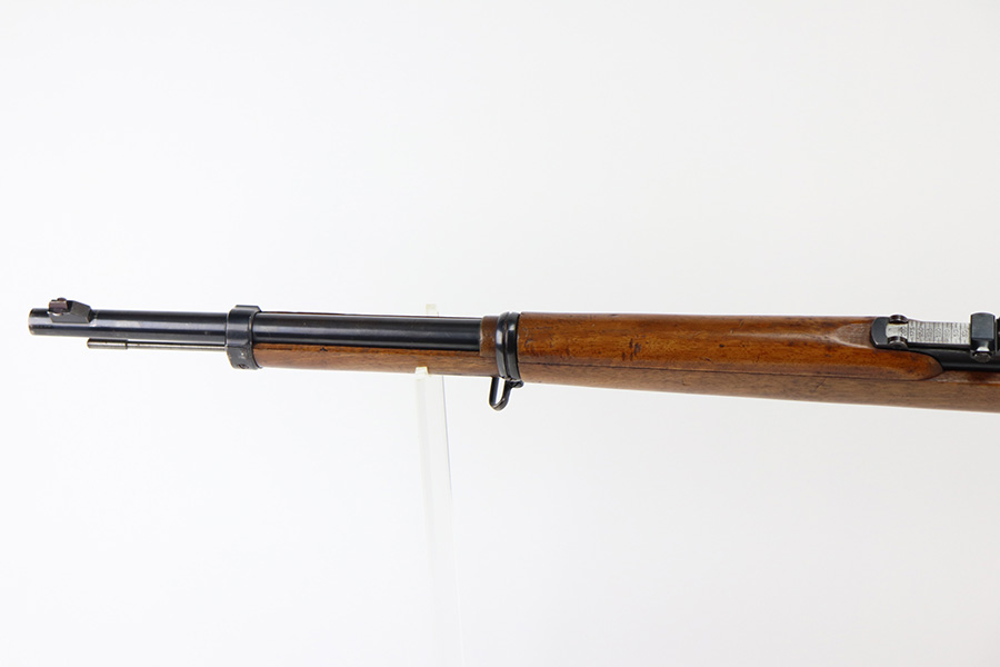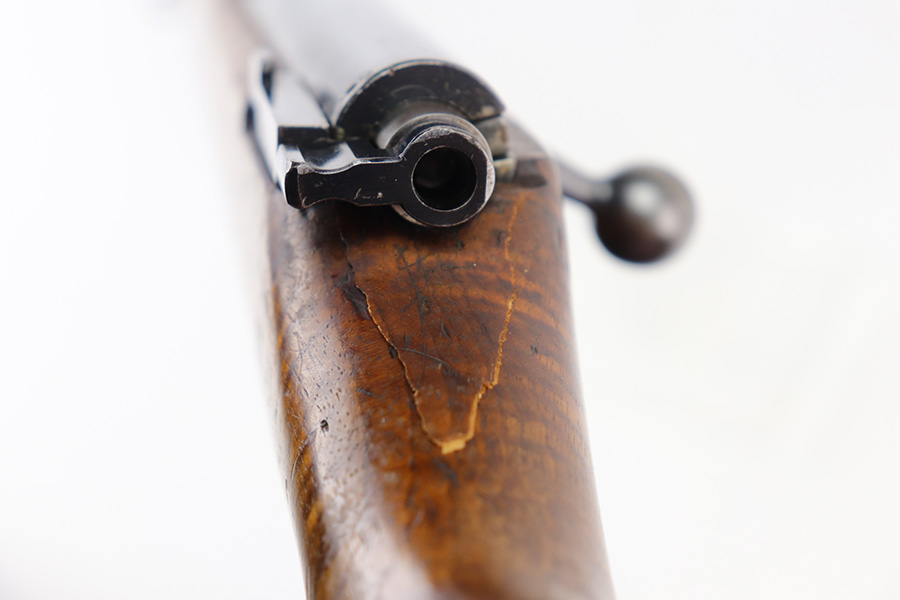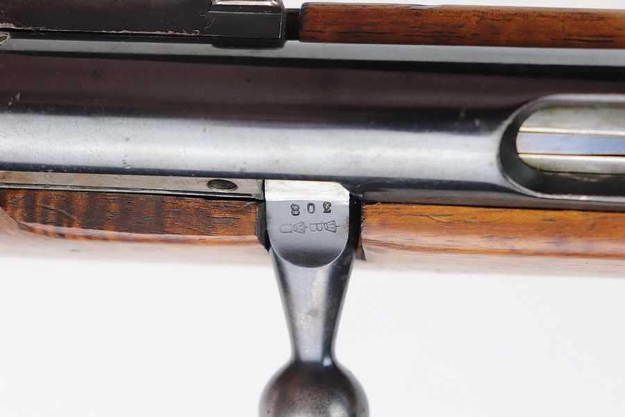 5/28/21 – This is an excellent example of a rare Erma Sportmodell training rifle, chambered .22 LR. This gun was designed for the Nazi military and paramilitary organizations but was not adopted. As a result, less than 1,000 were made. These guns are generally thought to have gone to the SA as many have been observed with SA markings. What makes the gun unique is the takedown button on the stock. This one is all matching and has “Crown B U” proofs. The gun is excellent. It has retained virtually all of its original high polish blue with minor handling marks here and there. The stock is excellent with minor dings and scratches throughout. There is a notable crack in the top of the stock just behind the action. The top layer of wood is separating there, though does not go all the way through. The bore is mint.