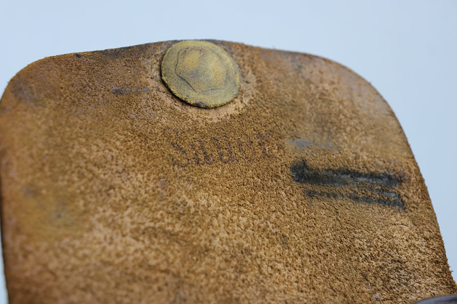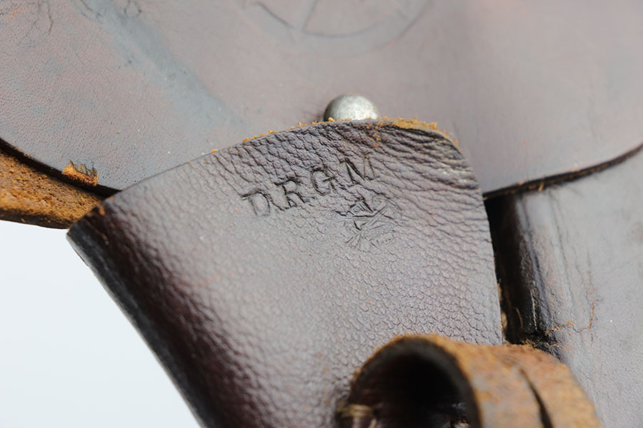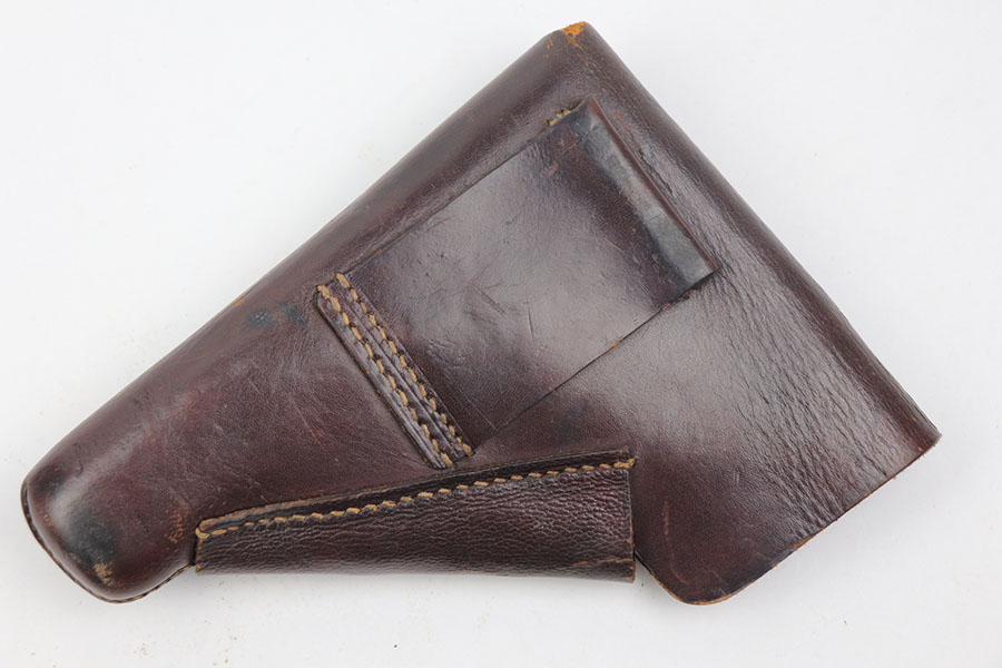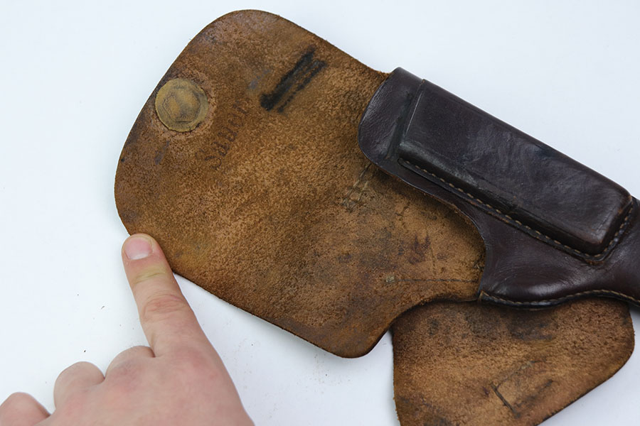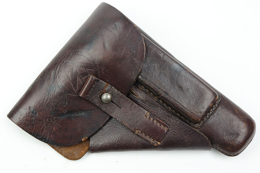 3/14/23 – This is an extremely scarce SA holster for a Sauer 38h. The holster has the SA logo on the front leather and is AKAH maker stamped under the closure strap. The leather shows normal signs of use and is pliable, but completely in tact. The initials “R.L.” are lightly scratched into the front leather near the SA logo. The top leather has mild surface scuffs and wrinkling but no deep wear or damage. There’s similar surface wear on the edges of the mag pouch and toe of the holster. The stitching is excellent and all original. The interior leather still has the original SAUER ink stamp. Also the shape of this holster is different from most SA holster examples, as most were made for the Walther PP, and there are far less SA Sauer 38h pistols. A beautiful and scarce piece of history. Priced to sell.