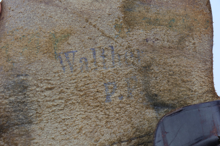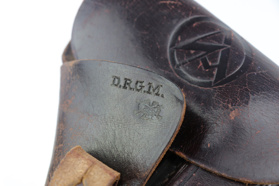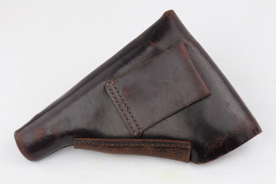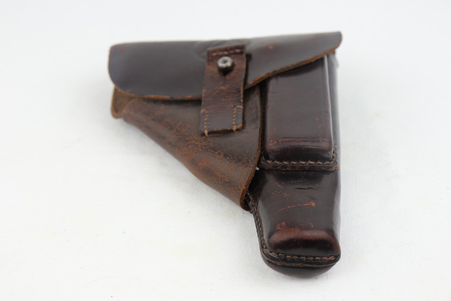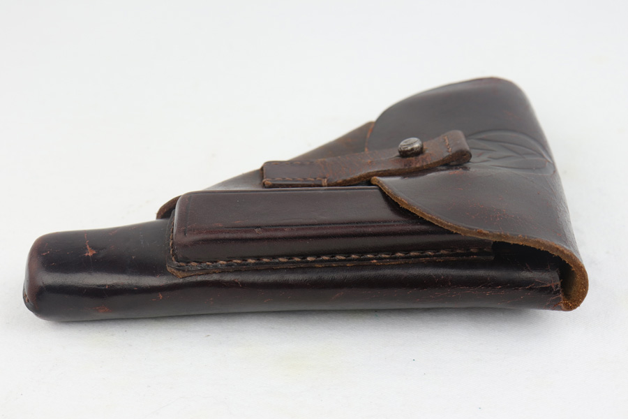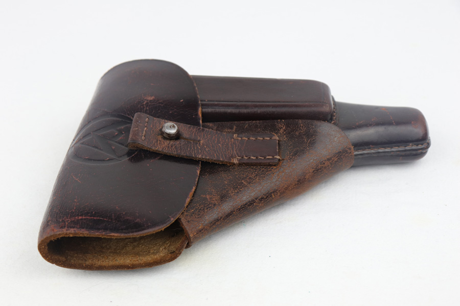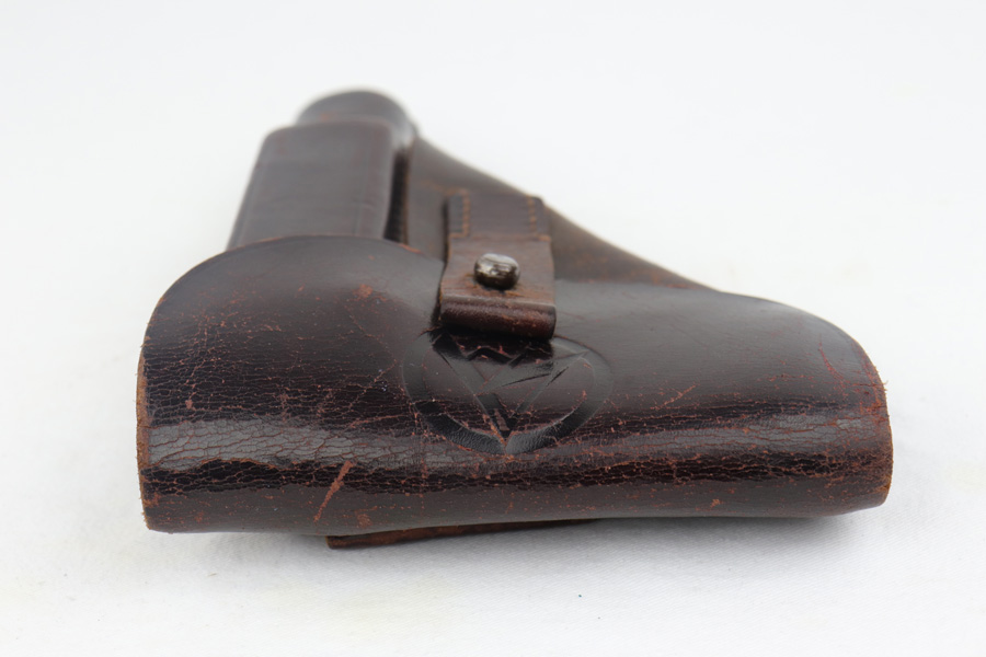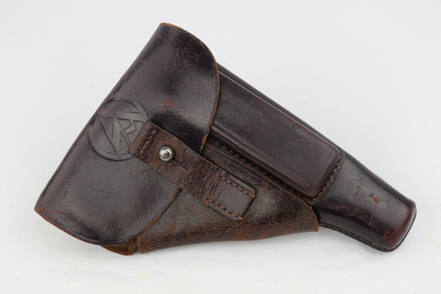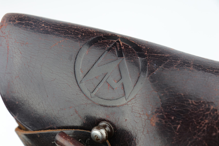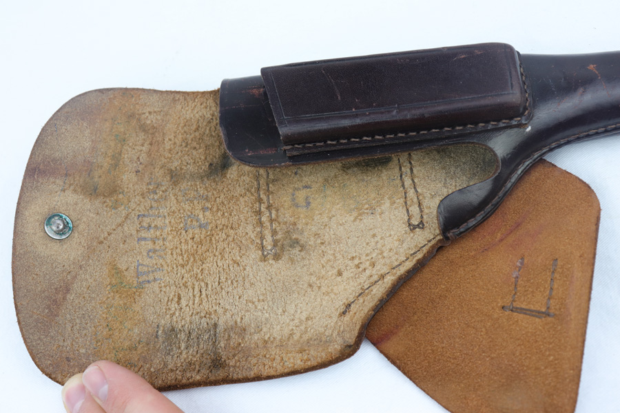 4/17/19 – This is an original SA Walther PP holster made by AKAH. There is a maker stamp under the closure strap, and an original SA proof stamp on the front leather. The stamp is strong and clearly visible. There is some light wrinkling / surface wear on the exterior leather. All of the stitching is original and in tact. There’s a faint remnant of the original ink stamp on the interior leather. All original!