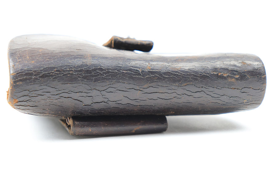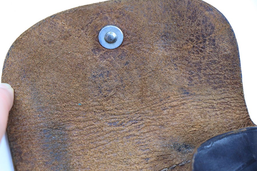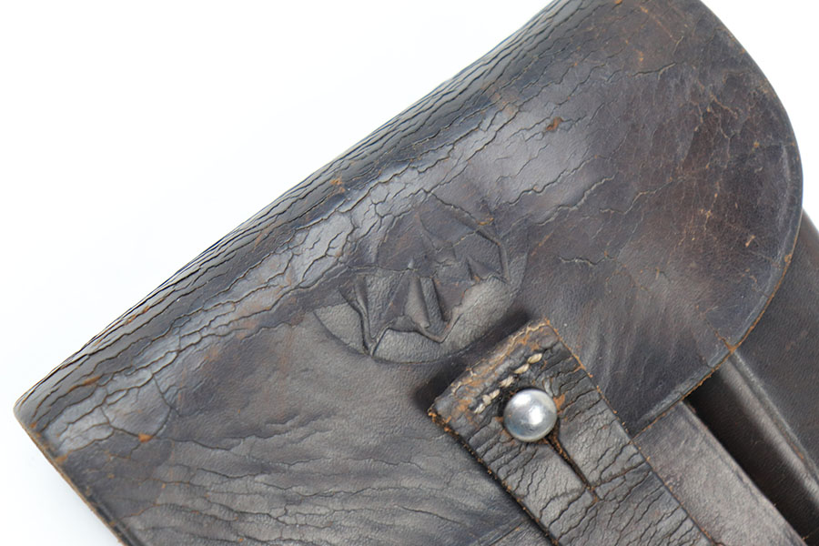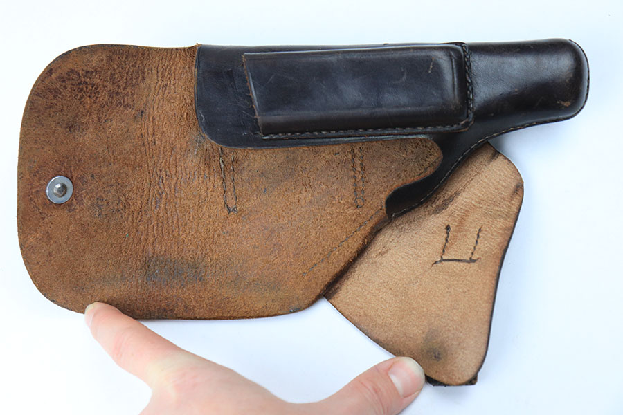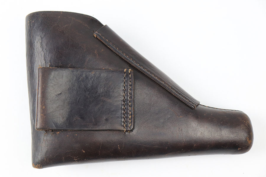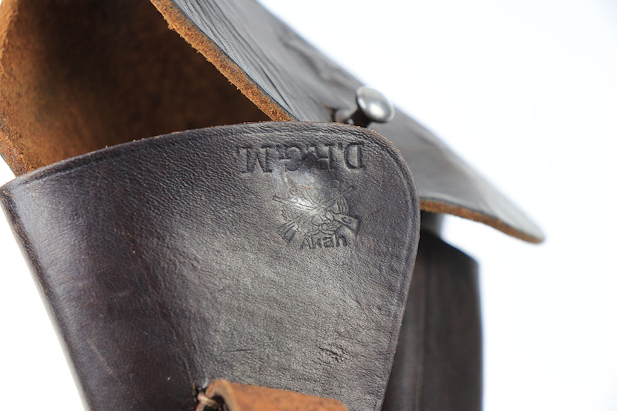 8/18/21 – This is an original rare variation SA Walther PP holster. The holster is in good overall condition despite some surface cracking on the top leather. This cracking doesn’t go very deep into the leather. The front leather is SA stamped and there’s an AKAH maker stamp under the closure strap. The chocolate brown leather has a fairly clean interior and shows a faint remnant of the Walther PP ink stamp. No stitching issues.