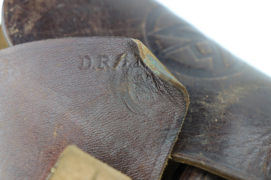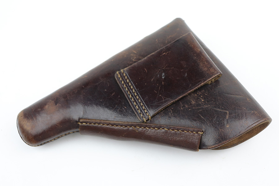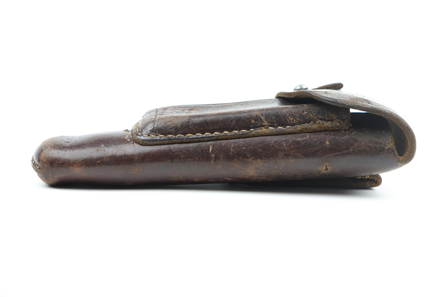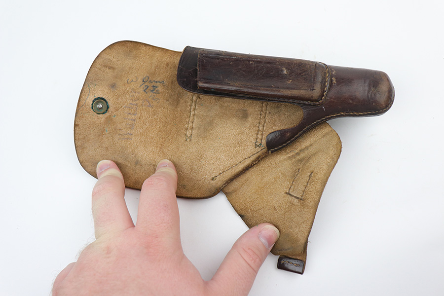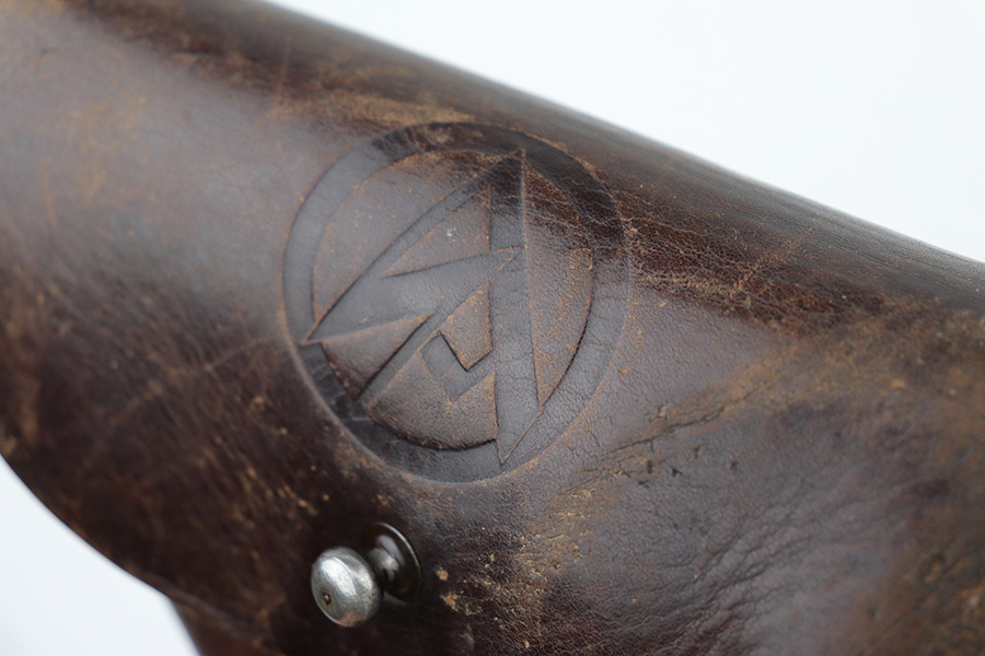 8/30/21 – This is an original SA Walther PP holster made by AKAH. The holster has a distinct SA stamp on the front leather. The stamp is crisp and clear. There’s an AKAH maker stamp under the closure strap. The interior leather shows a faint Walther PP ink stamp. The leather has some mild fading and shows signs of previous use but has no major flaws. There’s no notable stitching issues.