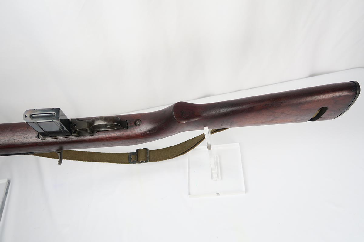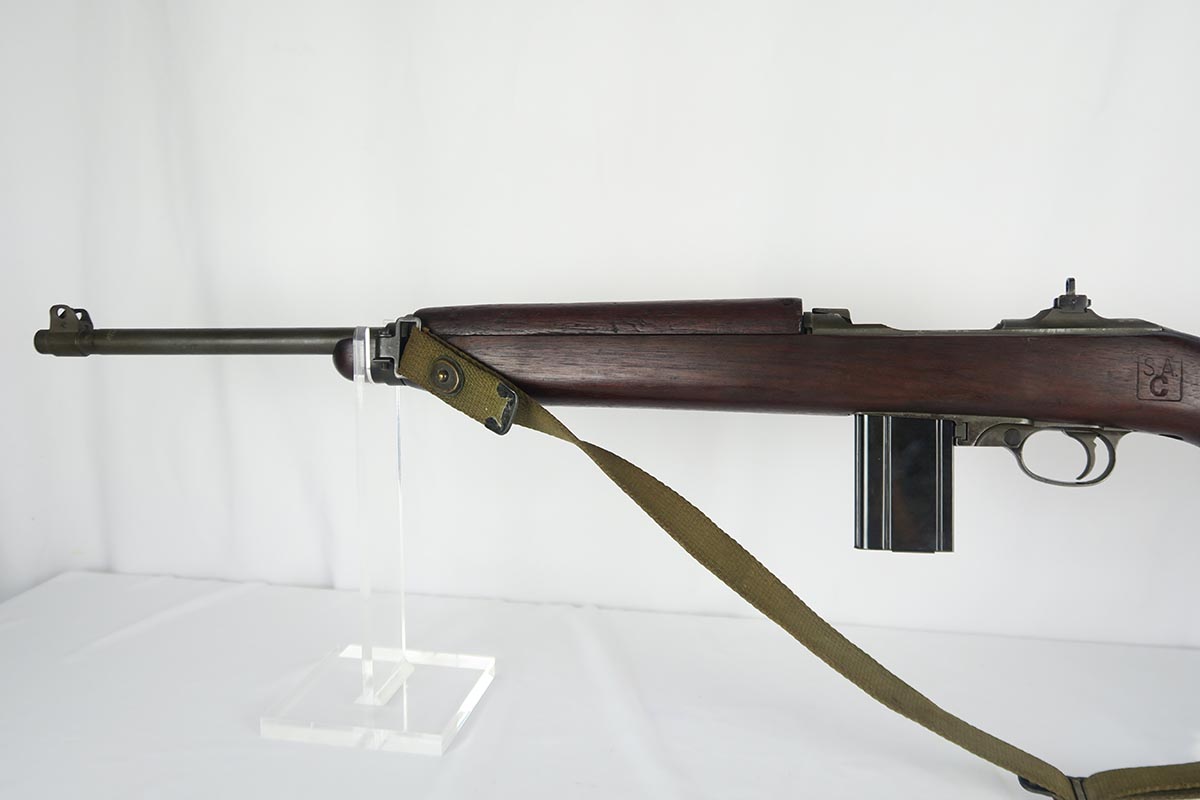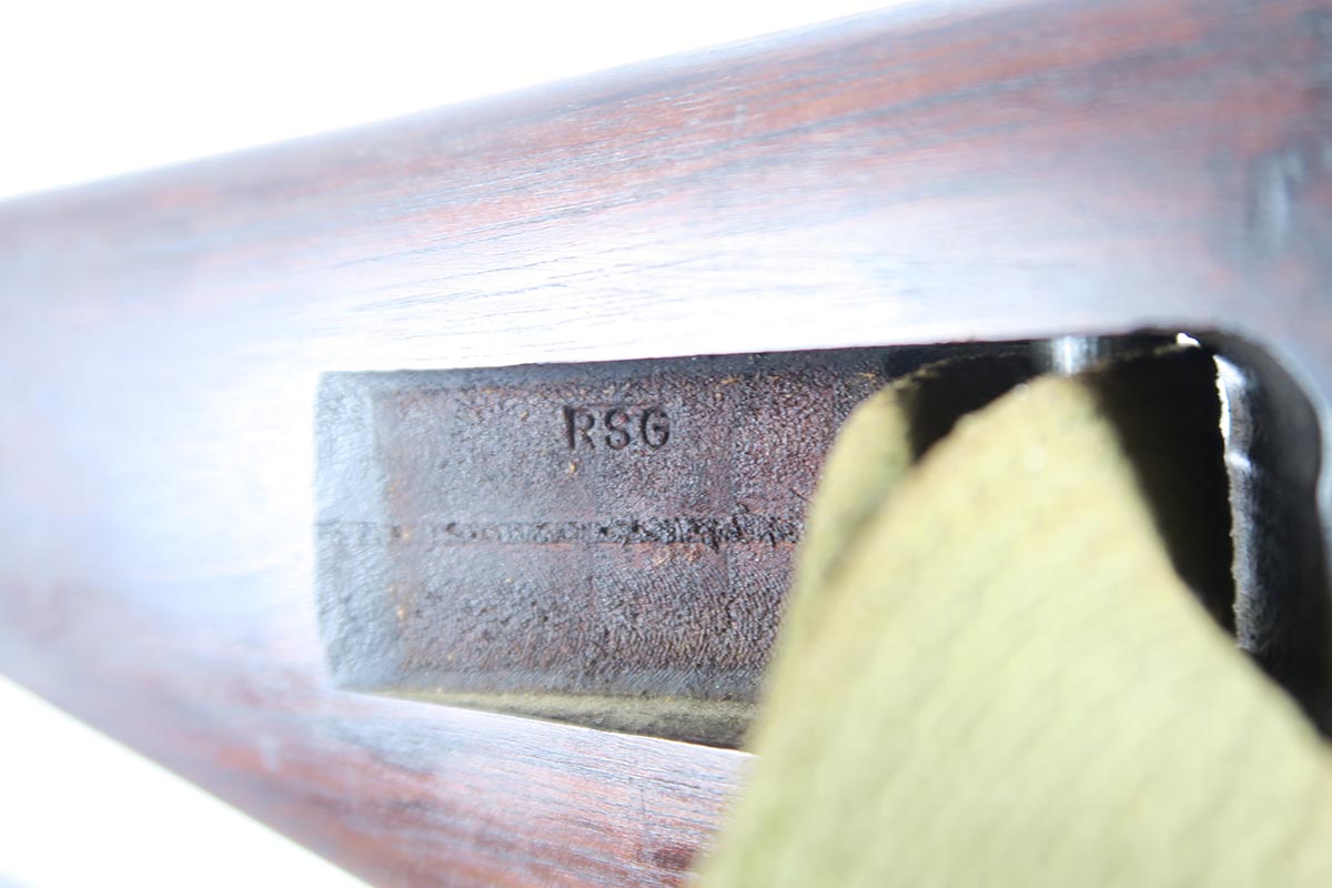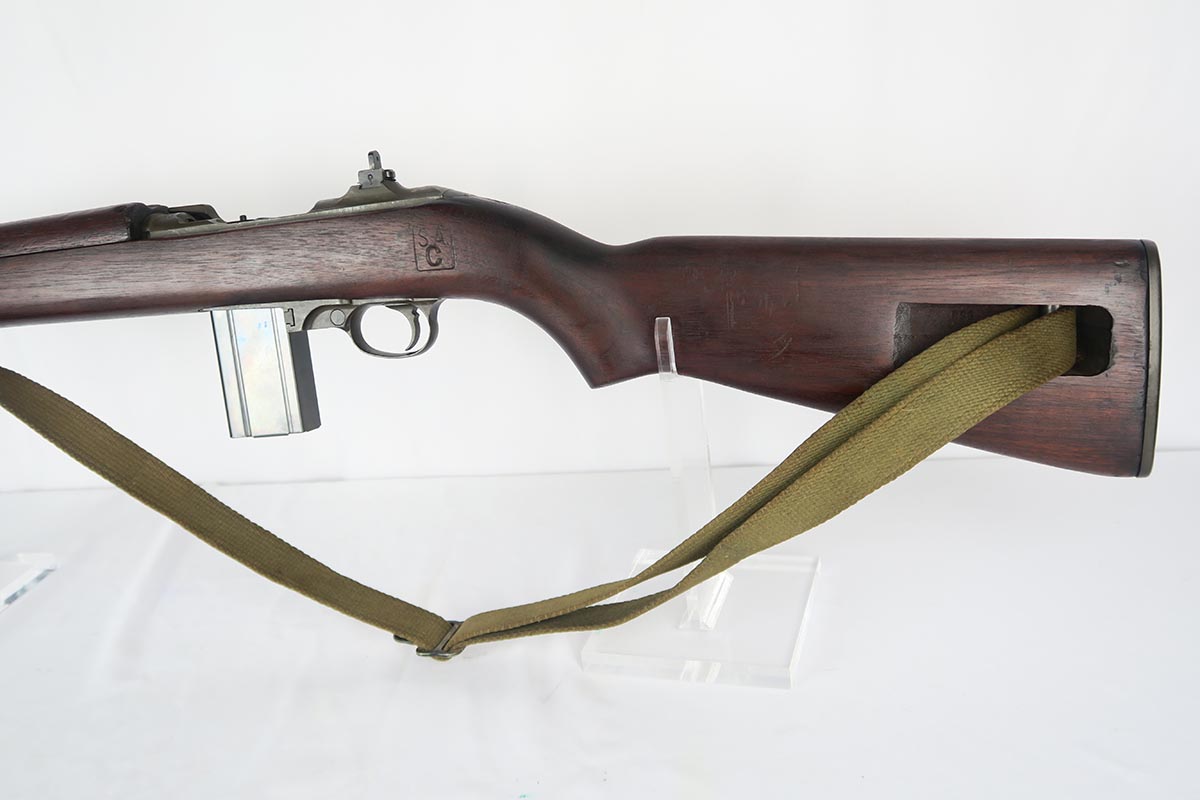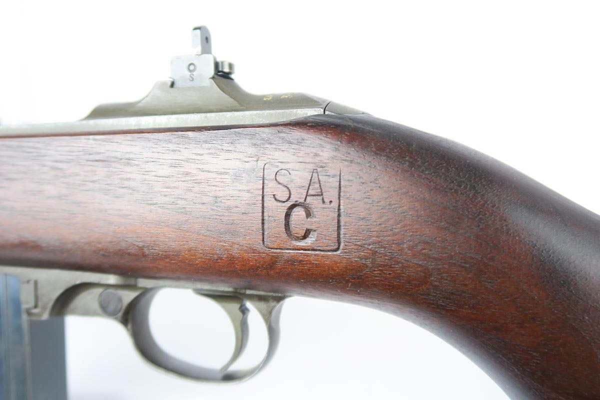2/7/18 – This is a nice and original example of an M1 Carbine produced by Saginaw Gear in Grand Rapids, Michigan. The serial dates it to 1943, and it is in good condition with no major flaws to the stock and common patina in the metal. Sling cut is marked RSG and right side stock has an SG cartouche. Bottom of the wrist shows the proper P proof in circle. Left side stock is proofed SA over C. World War II original sling. Bore is excellent and shiny with a spot of minor corrosion near the muzzle. No import marks.
