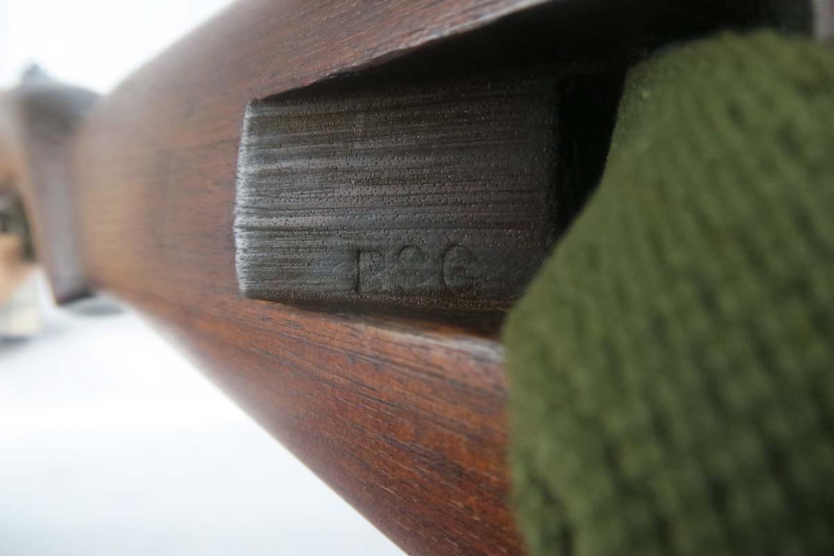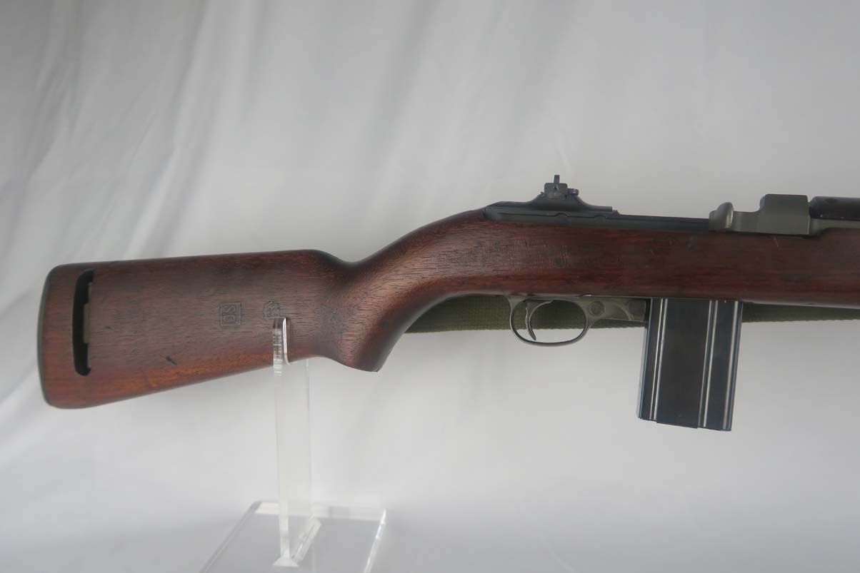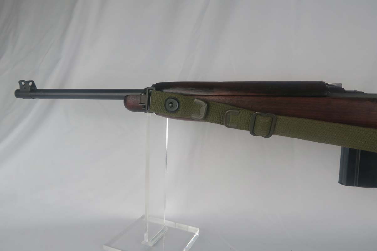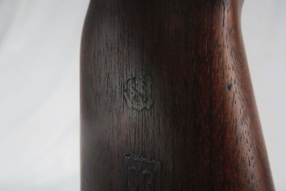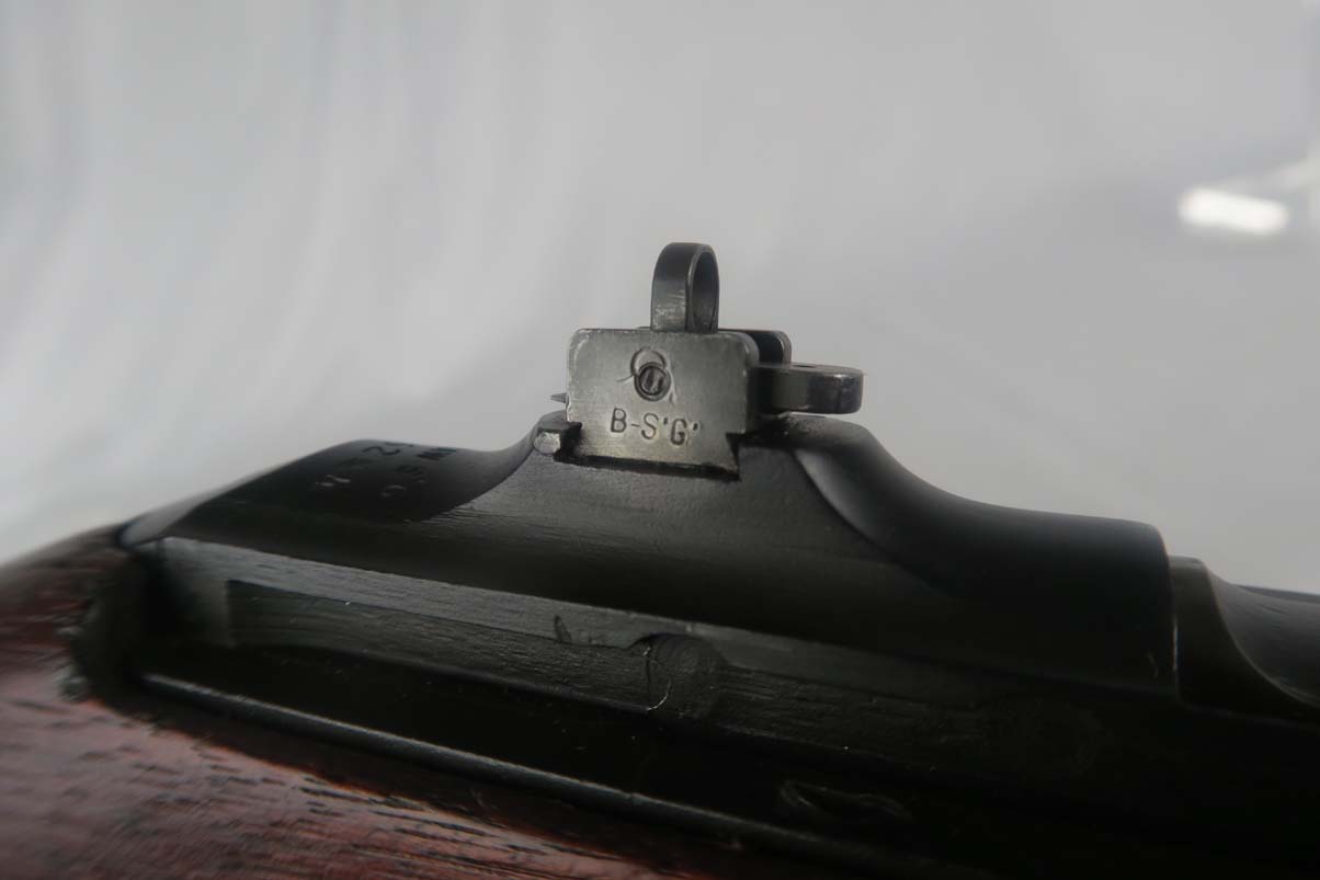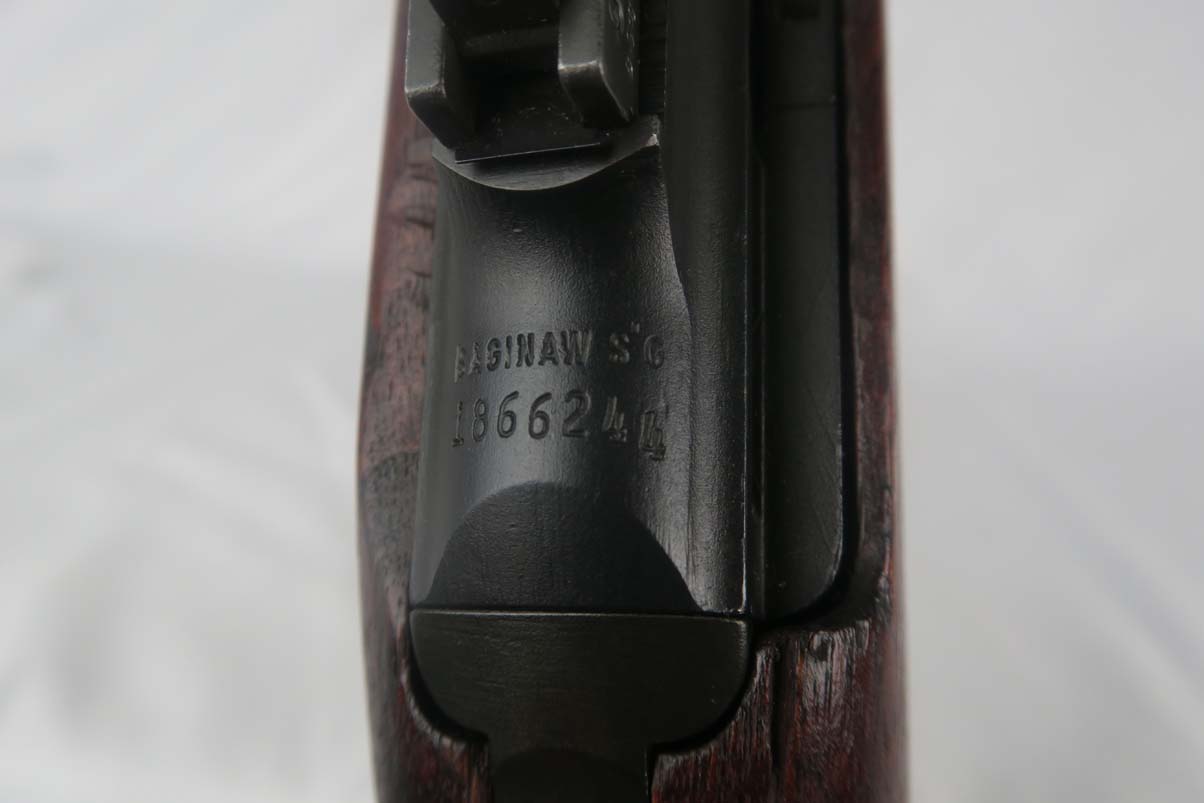 6/8/17 –  This is an early Saginaw S’G M1 carbine, produced in the first block of Saginaw’s carbine production.  It is in excellent condition, but we suspect the receiver has been refinished.  All parts appear to be correct and WW2 original.  The barrel is manufactured by Buffalo Arms with a date of 7-1943.  The stock cut is marked PSG.  The magazine marked O SG.  Safety marked IP-W.  The stock has a crossed cannons cartouche and SG proof, but I am also not positive they are correct.  Rear sight is marked B-S’G’.  Period correct oiler and strap.  Minty bore.