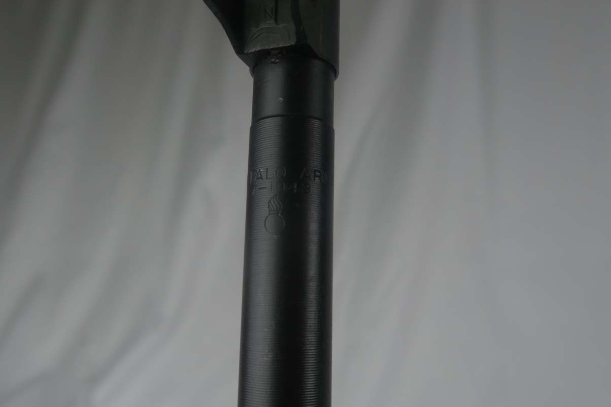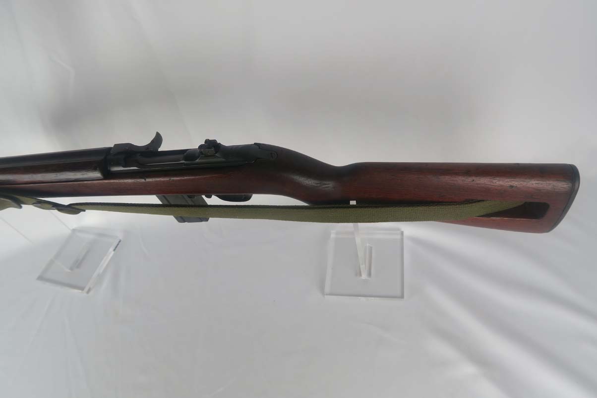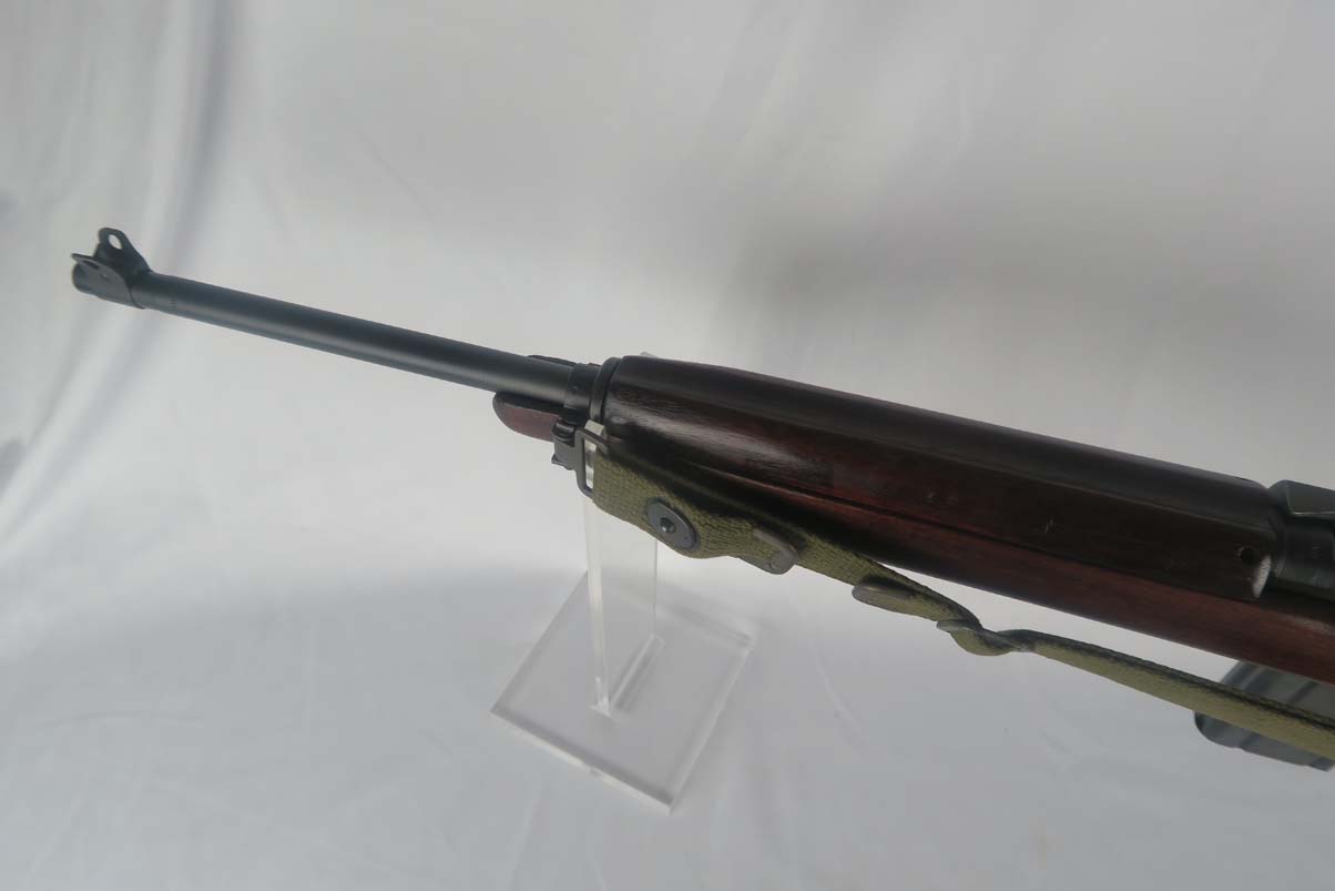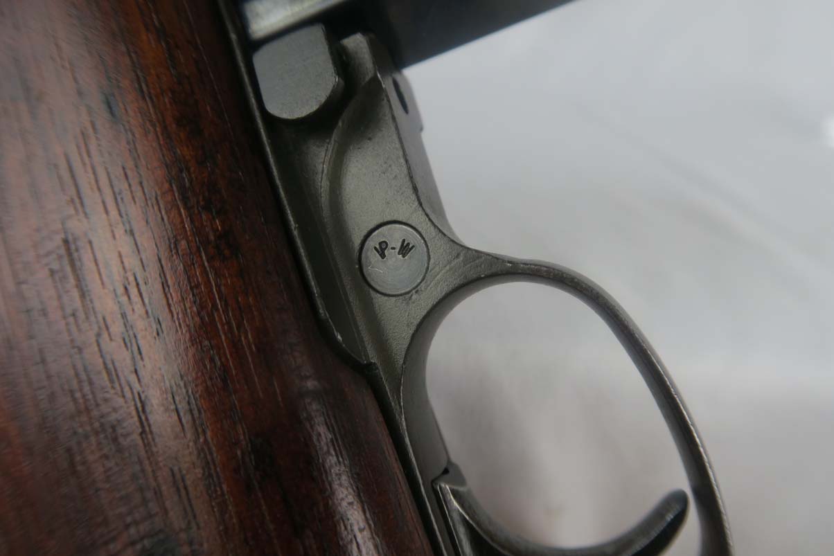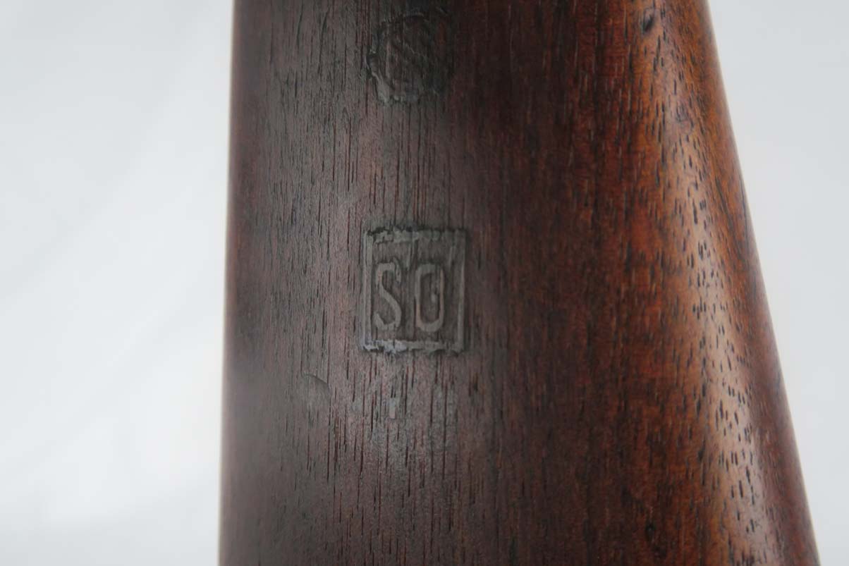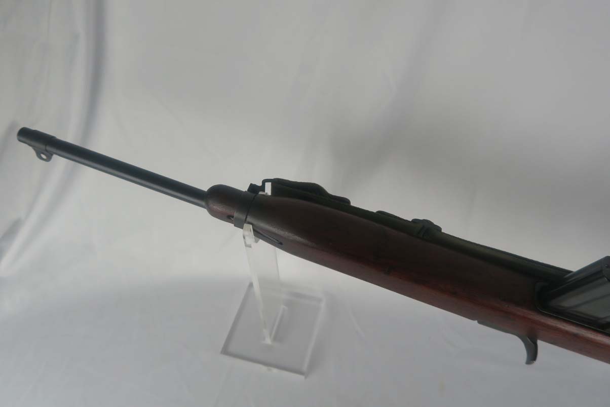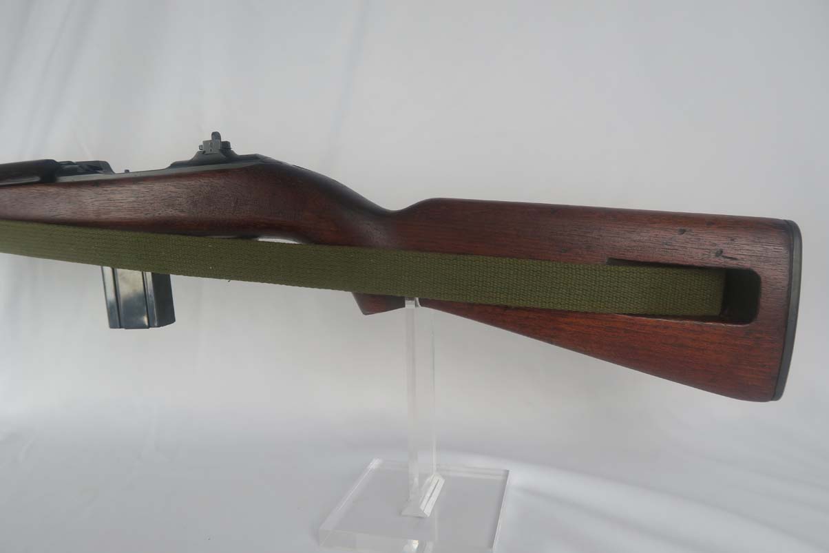 6/8/17 –  This is an early Saginaw S’G M1 carbine, produced in the first block of Saginaw’s carbine production.  It is in excellent condition, but we suspect the receiver has been refinished.  All parts appear to be correct and WW2 original.  The barrel is manufactured by Buffalo Arms with a date of 7-1943.  The stock cut is marked PSG.  The magazine marked O SG.  Safety marked IP-W.  The stock has a crossed cannons cartouche and SG proof, but I am also not positive they are correct.  Rear sight is marked B-S’G’.  Period correct oiler and strap.  Minty bore.