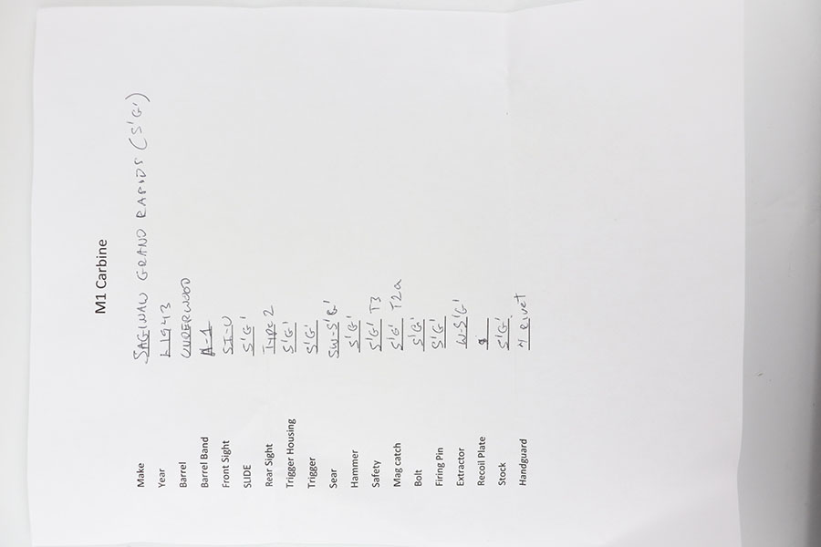 7/10/20 – This is a rare Saginaw Gear (S’G’ or S-Prime, G-Prime) M1 Carbine from early 1944. It’s tough to narrow exact production numbers as many S’G’ primes were also used in the Irwin-Pedersen assembly, but no more than roughly 2.5% of total WW2 M1 Carbine production was done at the Grand Rapids plant of Saginaw Gear. This one is in fantastic condition and appears almost entirely correct. As compared to Canfield’s book on carbines, only the front sight and front barrel band appear to be incorrect ‘by the book’. Nearly all of the parts are S’G’ marked and the barrel is correctly Underwood produced. The stock is SG marked but does also have a C-SAA stamp, indicating it went back to an arsenal at some point. Believe it indicates Camp Stanley in San Antonio. Excellent bore. No import marks. Full parts guide is included in the photos.