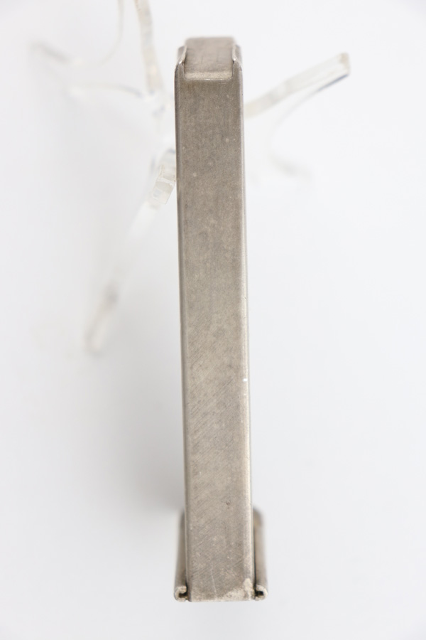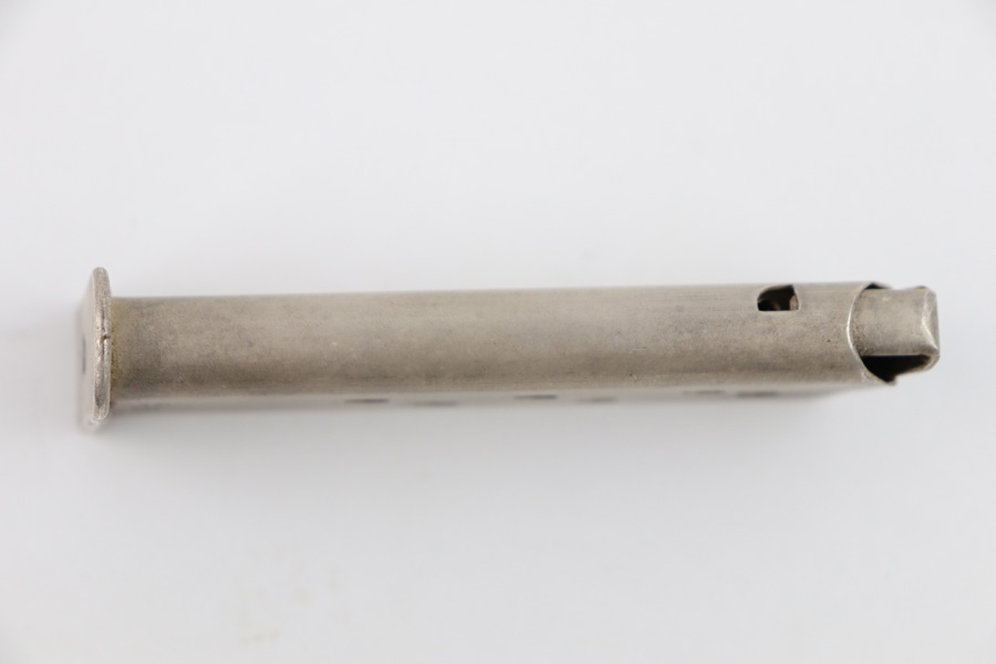 7/31/19 – This is a very rare verchromt Walther PPK magazine. Verchromt refers to the satin nickel finish of the magazine, a feature Walther provided as an upgraded look in the commercial market. These are very scarce and desirable, and often faked. We guarantee this one to be original, with a strong fully functional spring. Overall excellent condition.