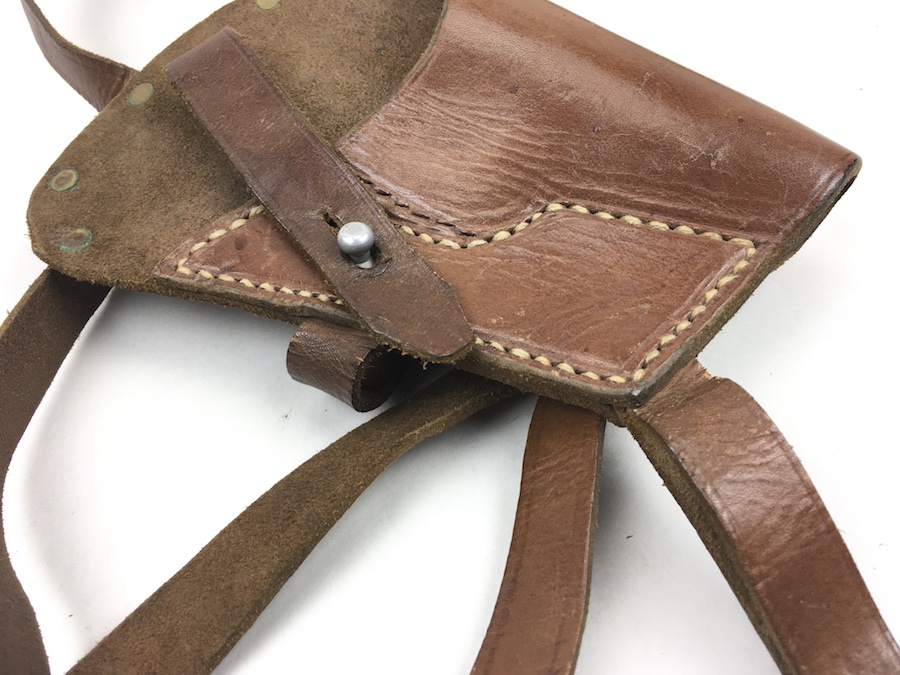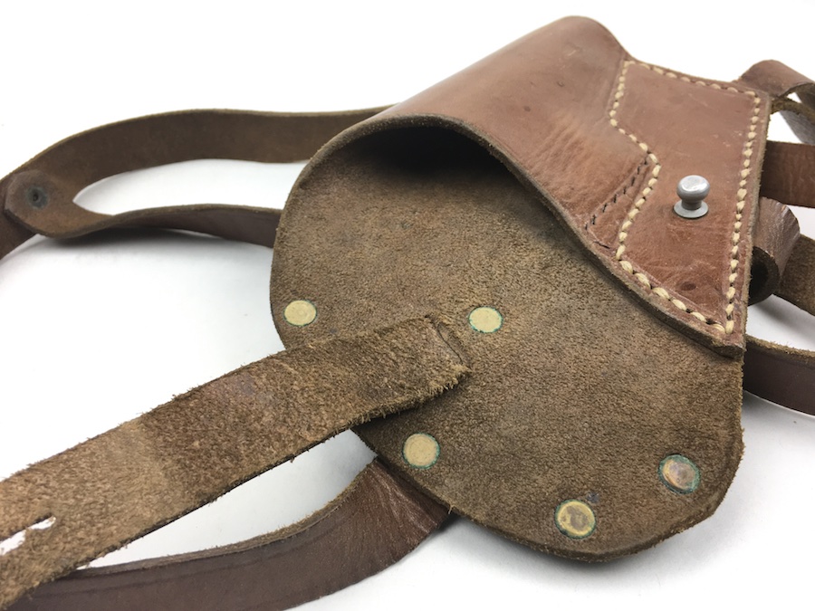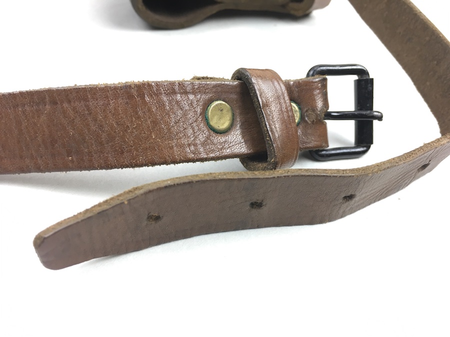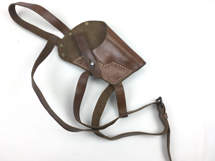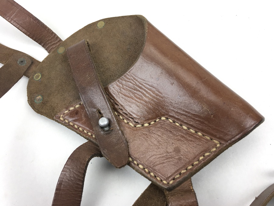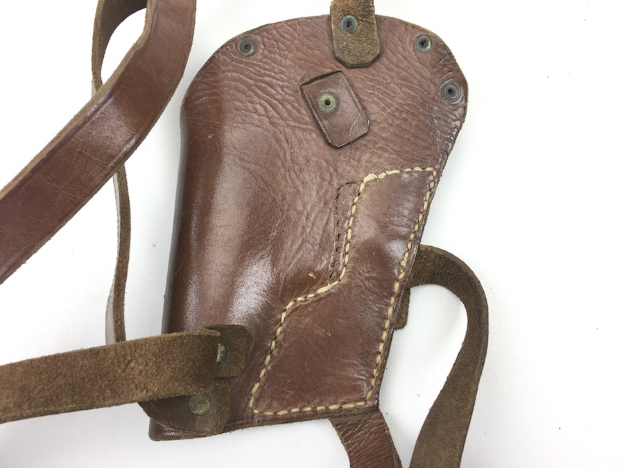 8/13/19 – This is an unmarked and undated leather shoulder holster. A Sauer 38H appears to fit well. (A PPK is somewhat snug) It can be used for other similar sized pistols.  Strong leather with minimal wear. Tight rivets and stitching. Possible late WWII or immediately post war. Stitching is intact. Buckle and straps are secure. The straps are small. Total length with buckle is 36″