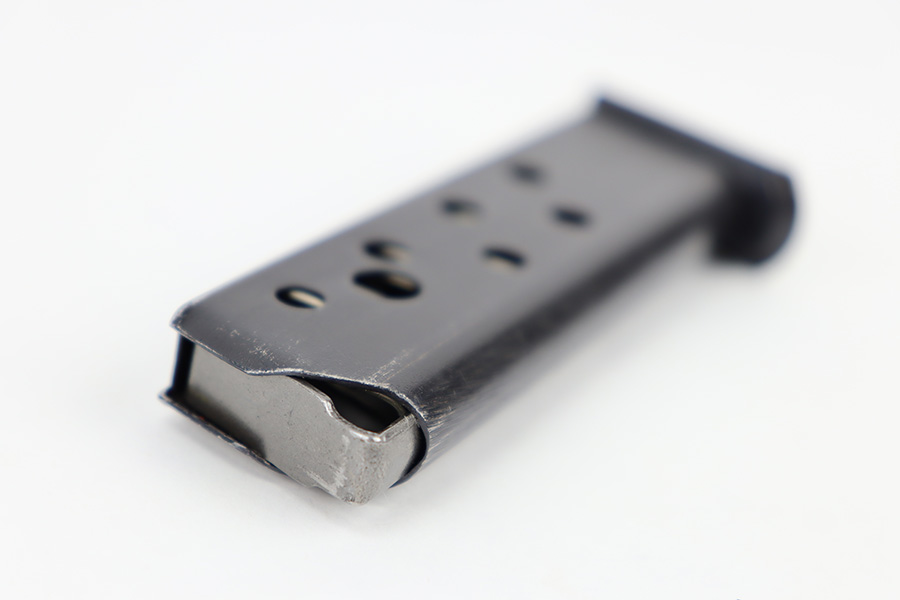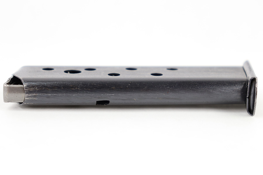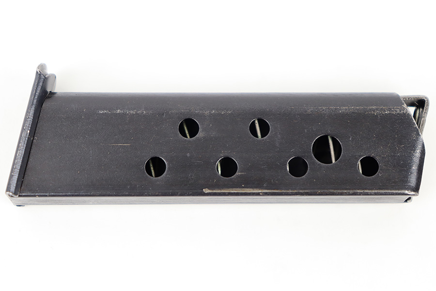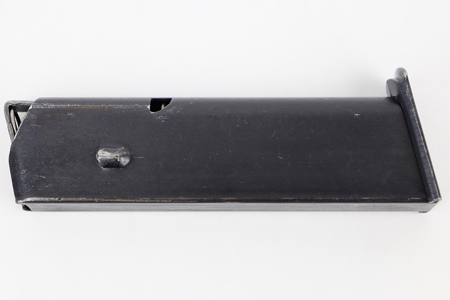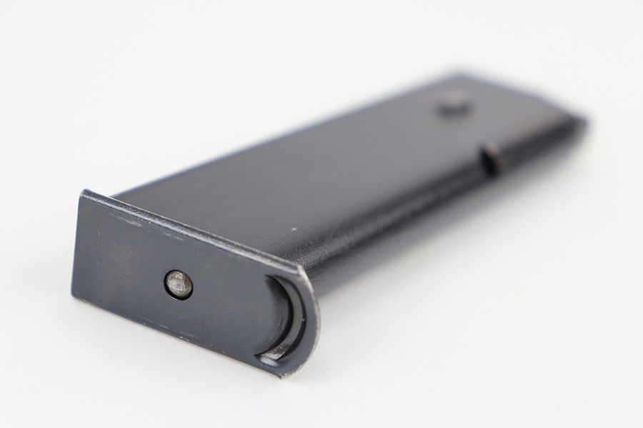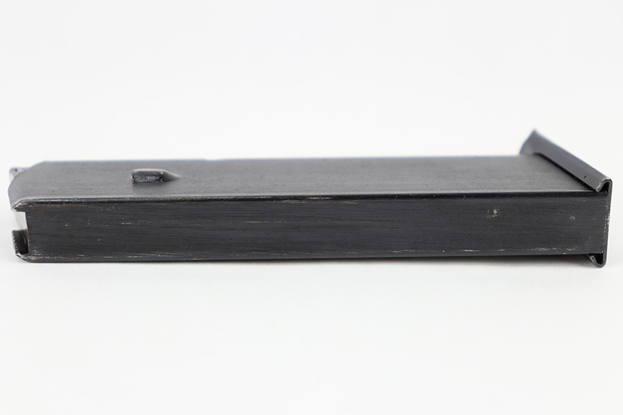 9/6/23 – This is an original WW2 wartime production Sauer 38h magazine. The magazine has a near-excellent blued finish with some mild finish loss and a spot of surface wear on the tube. The base is stamped with a half moon indent, which is indicative of wartime production. Strong, functional spring.