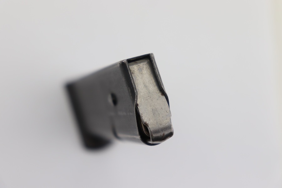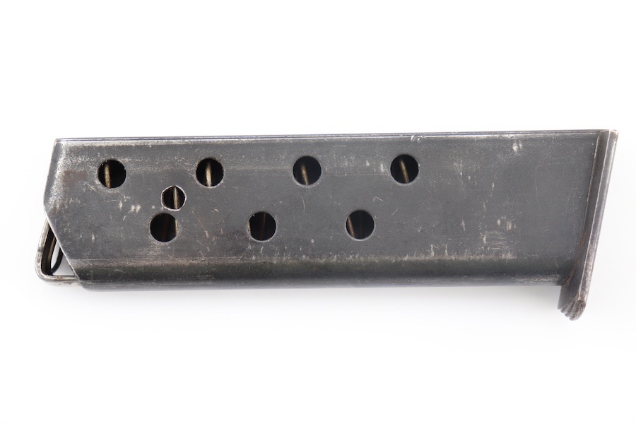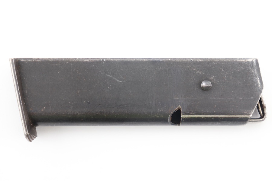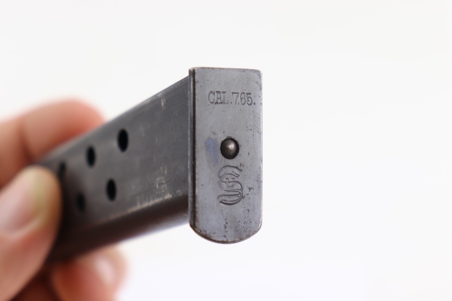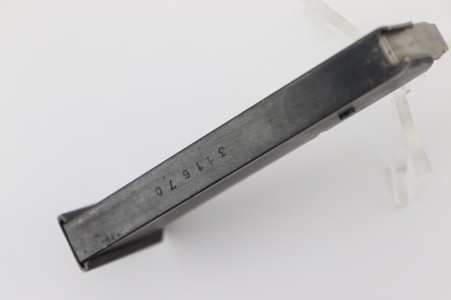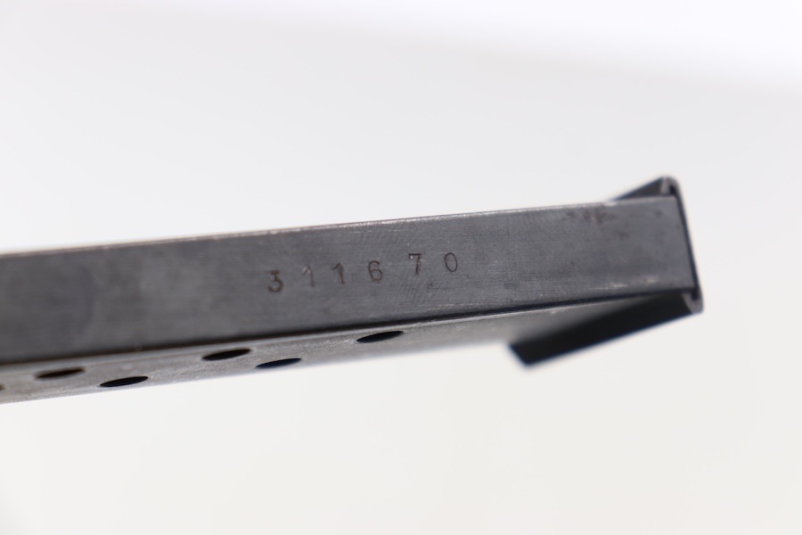 2/28/24 – This is an original Sauer 38h pistol magazine from WW2. The base has a high polish blued finish with “Cal 7.65.” on the top and S over top another S on the bottom. The tube has some finish loss, mostly edge wear and light dings with no rust or pitting. The spine has a serial number that reads 311670, most likely added post war. Strong, functional spring.