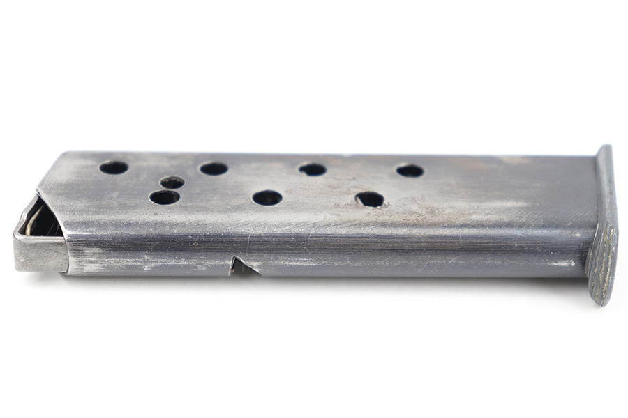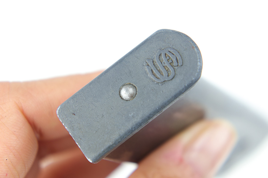 3/22/23 – This is an original WW2 production Sauer 38h magazine. The magazine is in good overall condition with a blued tube and zinc base. The zinc base was a later wartime production change as materials ran low for the Germans. The base is double-S stamped with the Sauer logo and there are no other markings. There’s finish loss on each side of the tube and some mild surface pitting on the right side as shown. The spring is strong and fully functional.