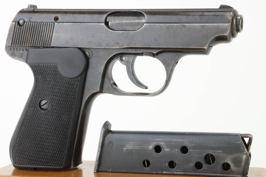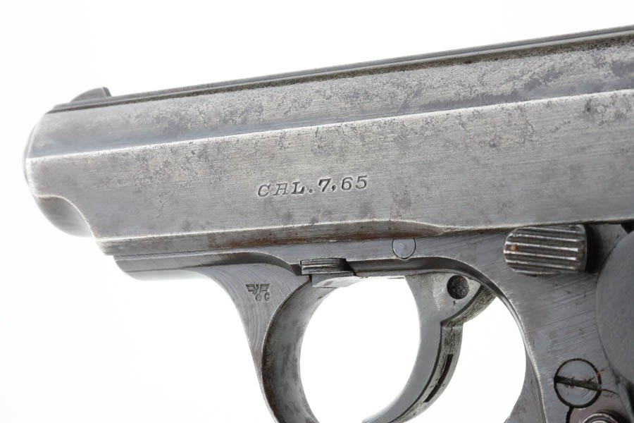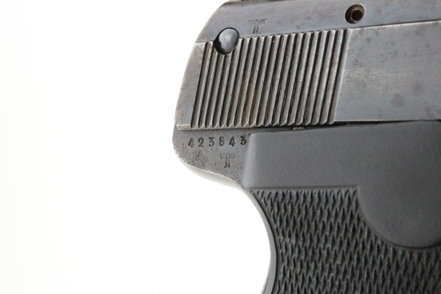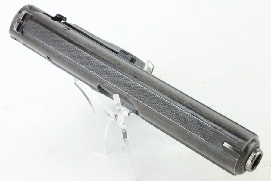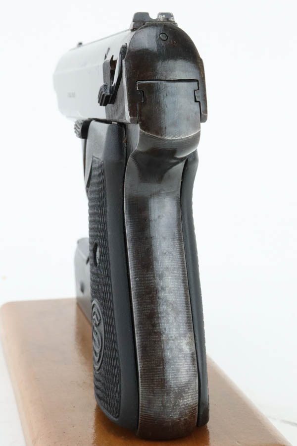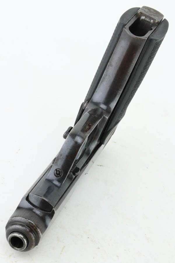 7/10/24 – This is a nice example of a Sauer 38h issued to the Nazi police during WW2. It is all matching and has a police “Eagle C” proof on the left side of the trigger guard. The gun has retained about 93% of its original finish. General high edge and muzzle wear. Thinning and minor pitting along the left side of the slide. Spotty oxidation throughout. Fitted with reproduction black plastic grips and comes with one proper magazine. Minty bore.