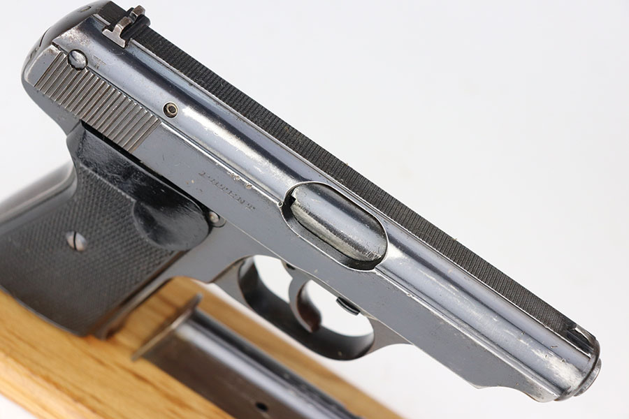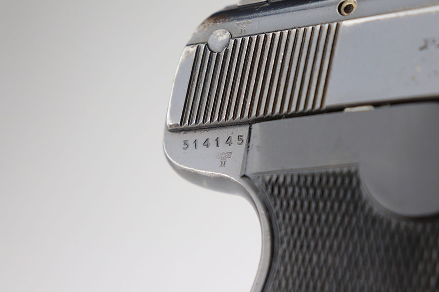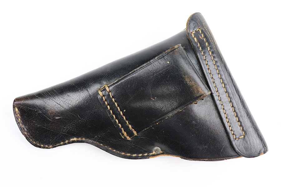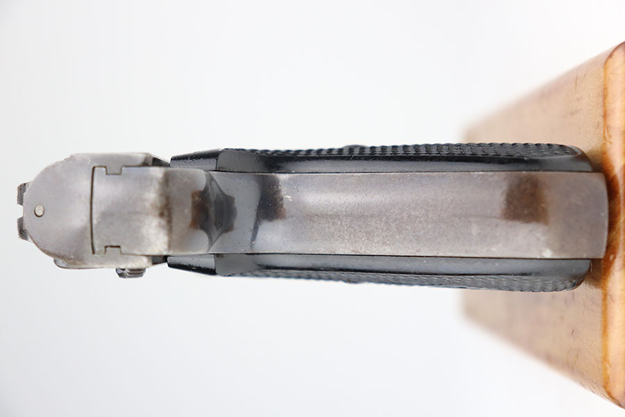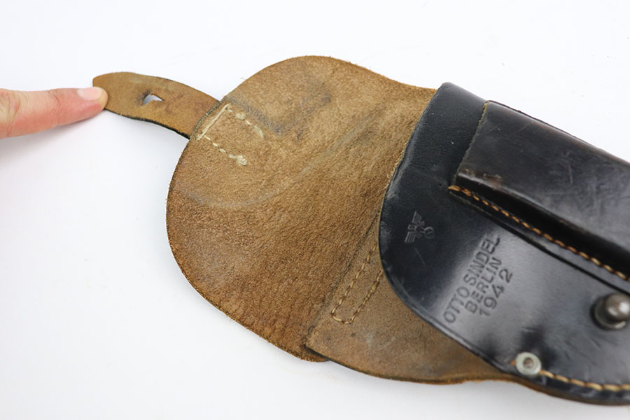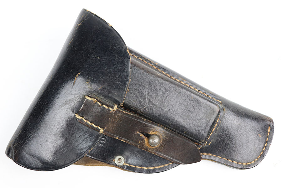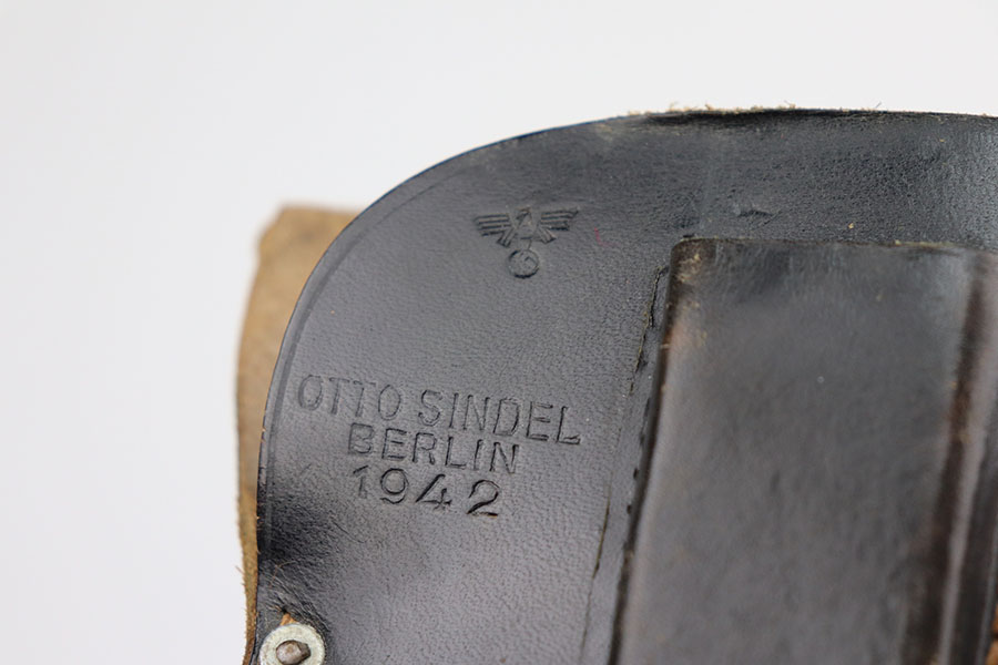 2/8/21 – This is a very nice example of Sauer 38h rig issued to the Nazi police force during WW2. The gun also comes with a nice 1942-dated police holster. The gun is all matching and has a police “Eagle C” marking. It has retained about 92% of its bluing. There is wear around the muzzle and high edges of the slide. There are a few small dings along the slide. Thinning and spotty oxidation on the straps. Significant area of discoloration on the left side of the slide. It comes with excellent grips and one magazine. The bore is very nice – shiny with good rifling. The safety lever is a little loose.