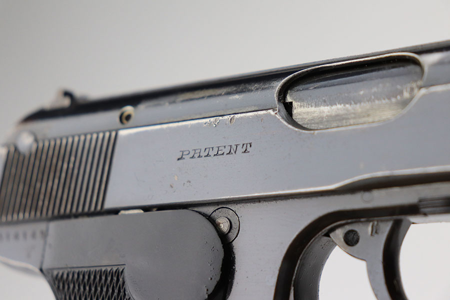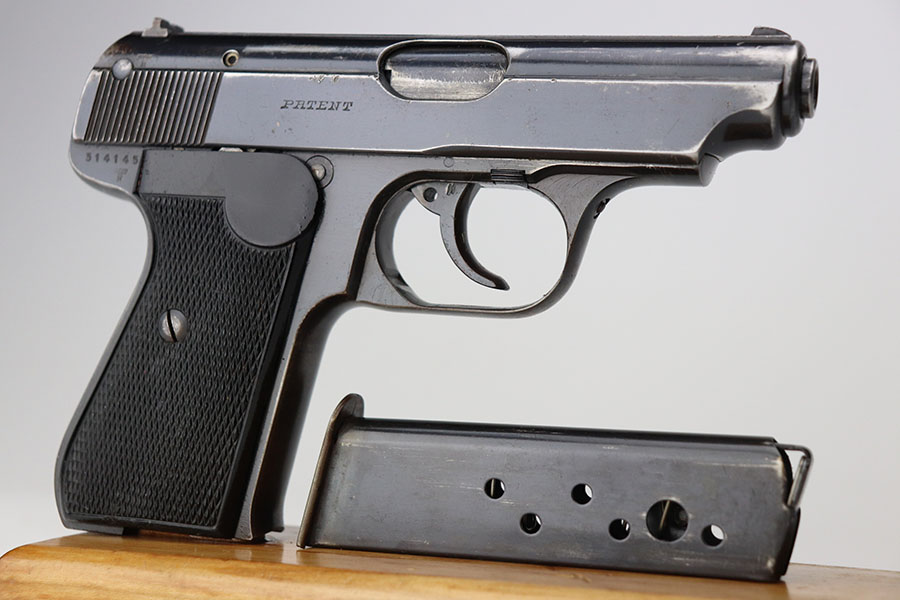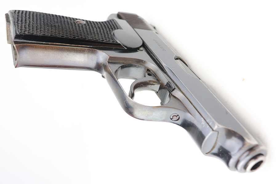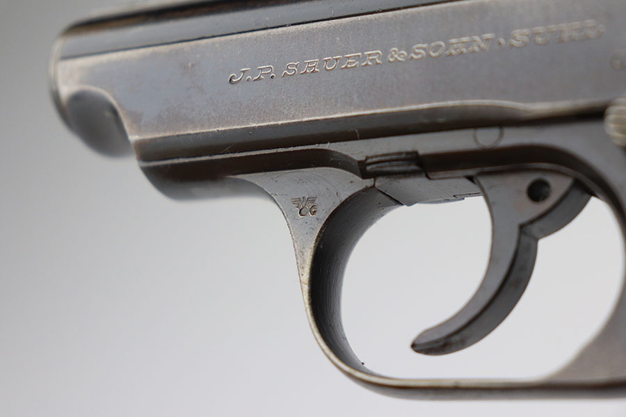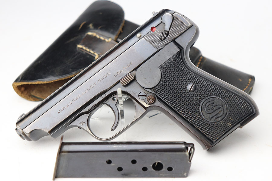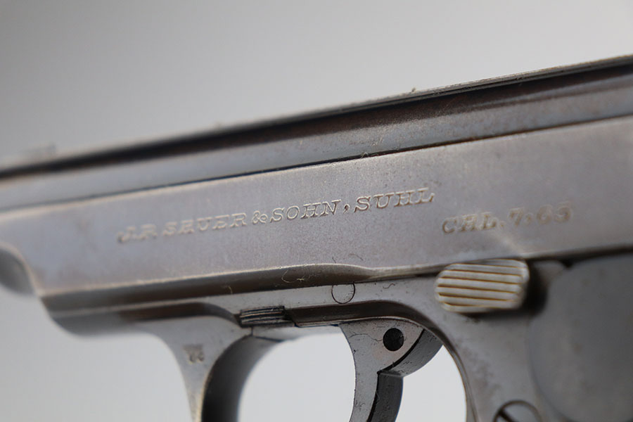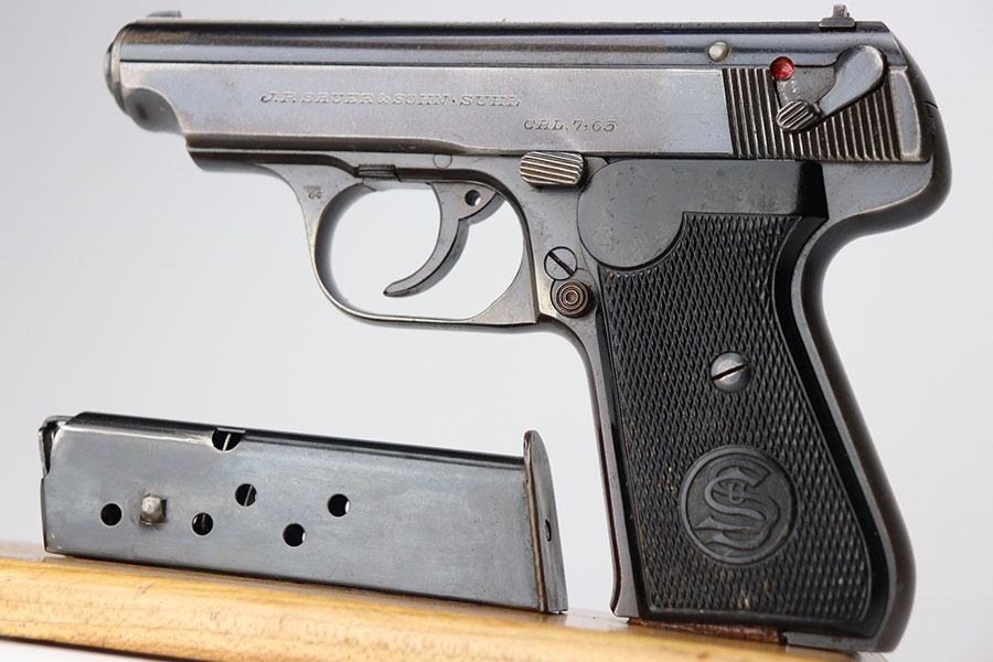 2/8/21 – This is a very nice example of Sauer 38h rig issued to the Nazi police force during WW2. The gun also comes with a nice 1942-dated police holster. The gun is all matching and has a police “Eagle C” marking. It has retained about 92% of its bluing. There is wear around the muzzle and high edges of the slide. There are a few small dings along the slide. Thinning and spotty oxidation on the straps. Significant area of discoloration on the left side of the slide. It comes with excellent grips and one magazine. The bore is very nice – shiny with good rifling. The safety lever is a little loose.