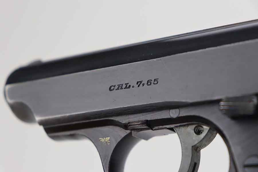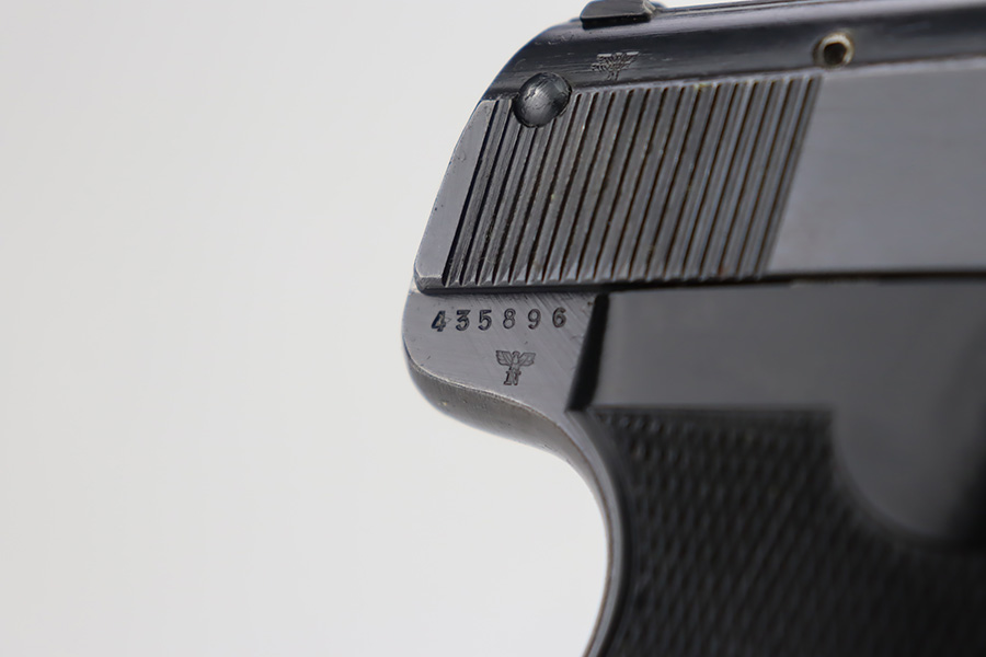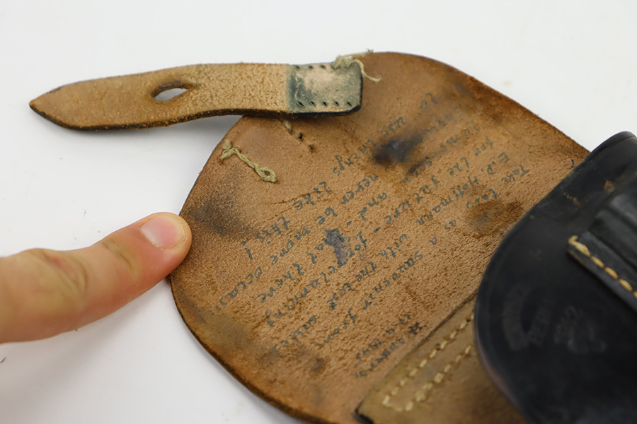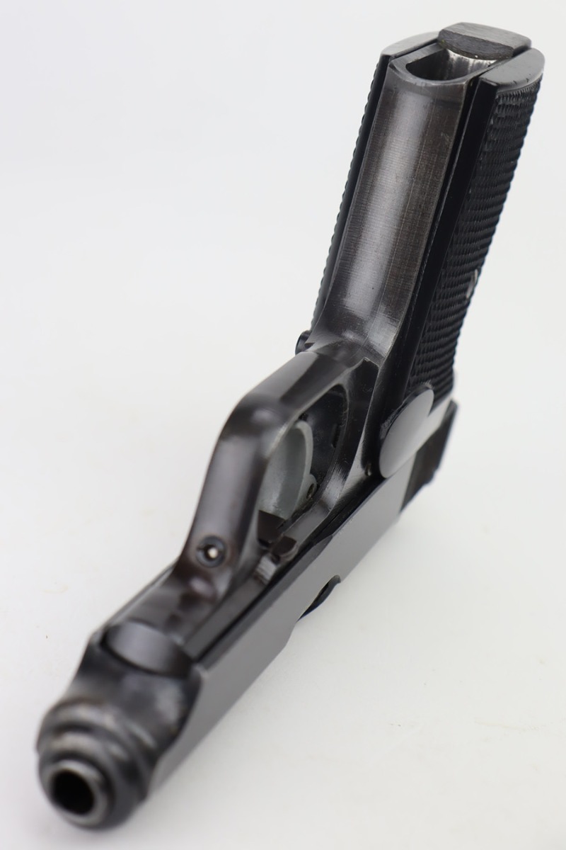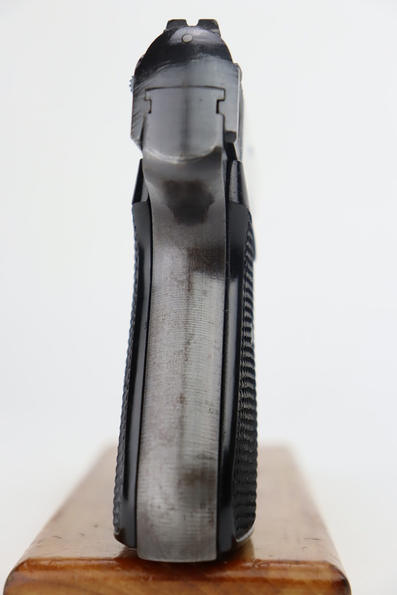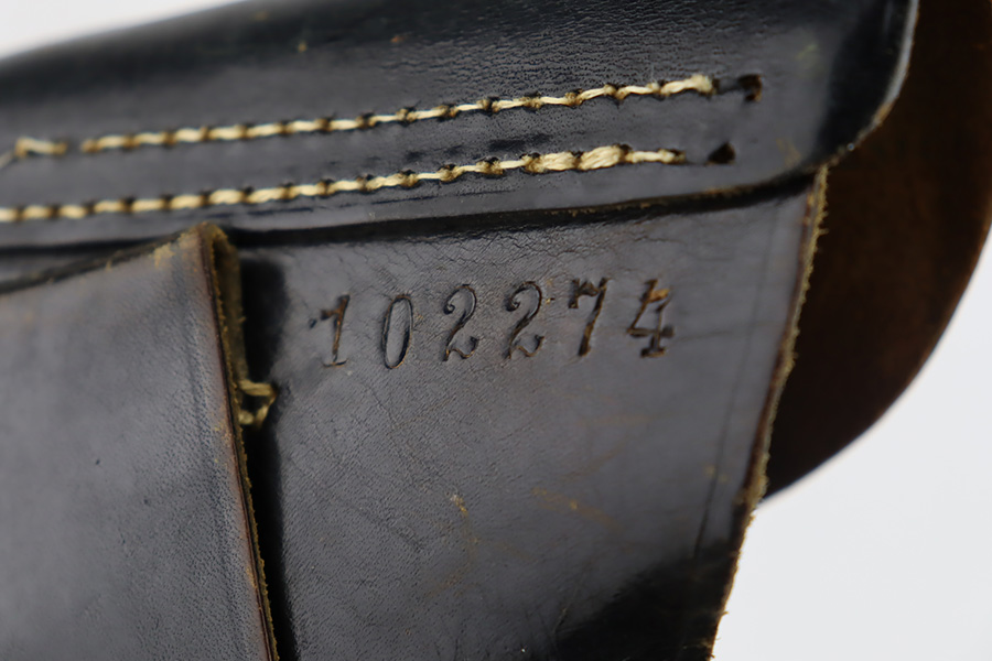 9/25/23 – This is a very nice example of a Sauer 38h issued to the Nazi police force during WW2. It is all matching and has the proper “Eagle C” police proof on the left side of the trigger guard. It comes as a rig with a 1942-dated police holster and one proper magazine. The holster is numbered but not matching to the gun. The closure strap has torn off but is included. There is a message handwritten on the inside of the top flap – some of the words are obscured, so we can’t get the full message. The gun itself has retained roughly 85% of its original finish. Nearly all of the finish loss is on the grip straps, so the profile views are minty. Fitted with excellent black bakelite grips. Mint bore.