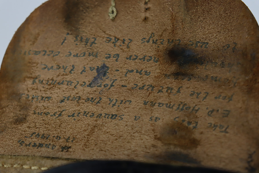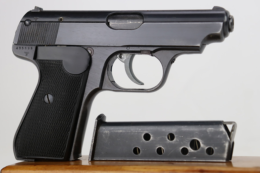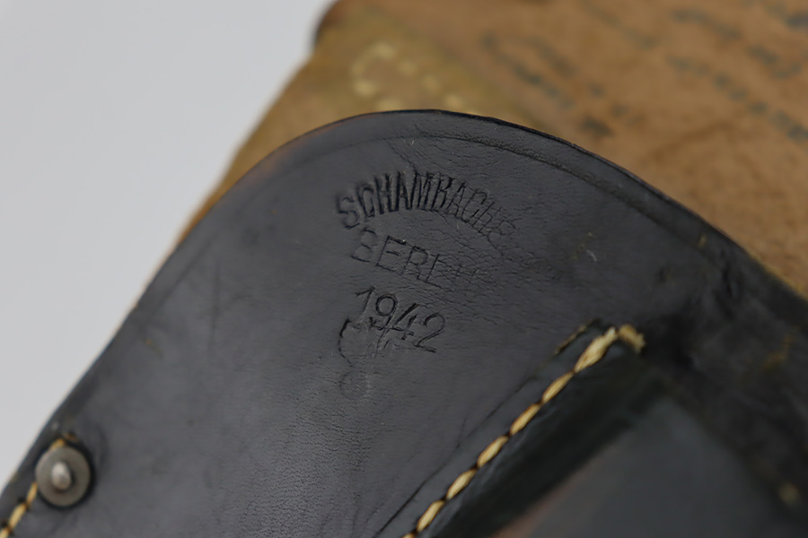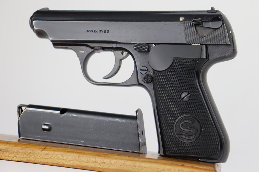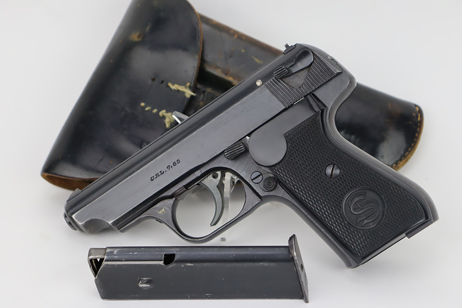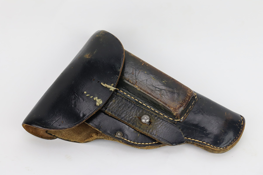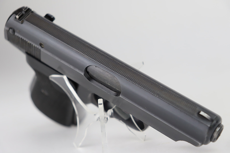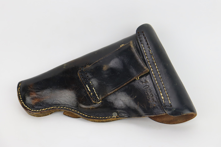 9/25/23 – This is a very nice example of a Sauer 38h issued to the Nazi police force during WW2. It is all matching and has the proper “Eagle C” police proof on the left side of the trigger guard. It comes as a rig with a 1942-dated police holster and one proper magazine. The holster is numbered but not matching to the gun. The closure strap has torn off but is included. There is a message handwritten on the inside of the top flap – some of the words are obscured, so we can’t get the full message. The gun itself has retained roughly 85% of its original finish. Nearly all of the finish loss is on the grip straps, so the profile views are minty. Fitted with excellent black bakelite grips. Mint bore.