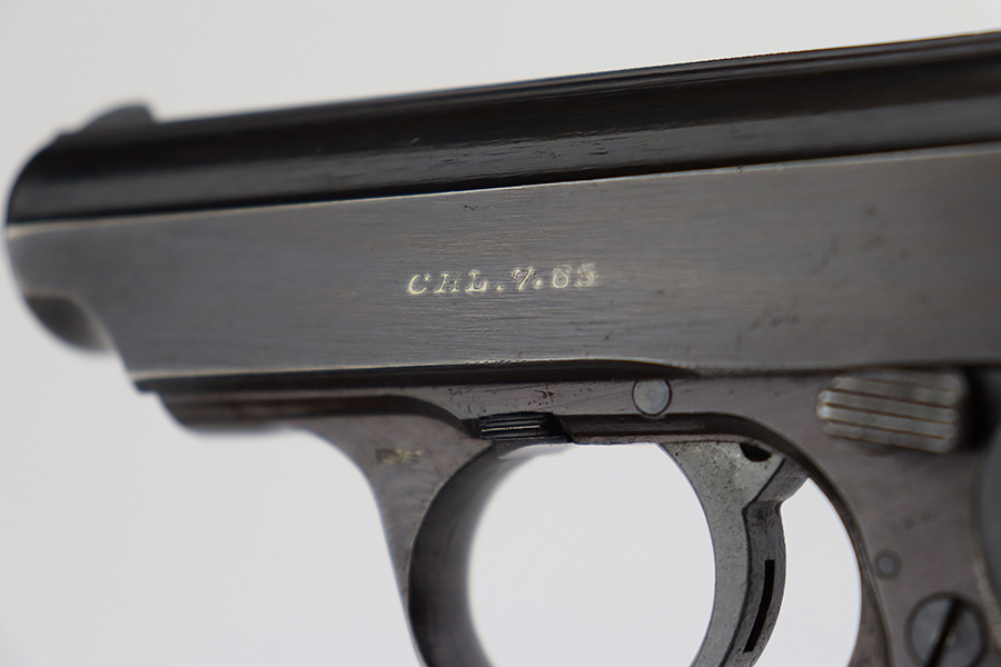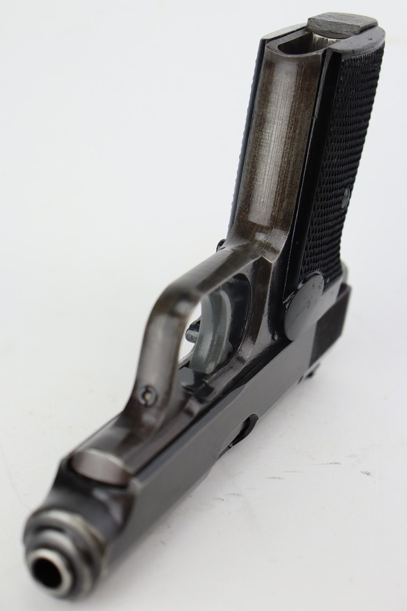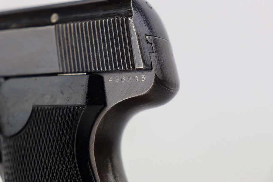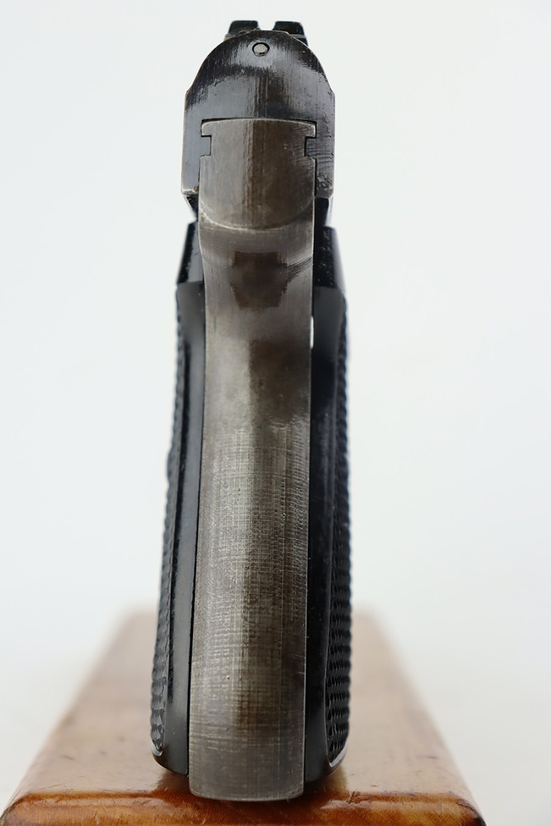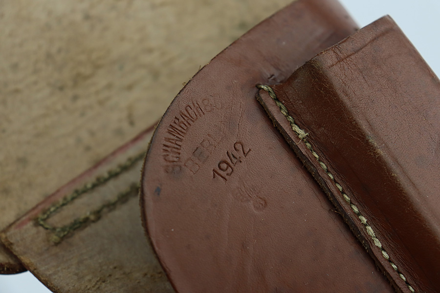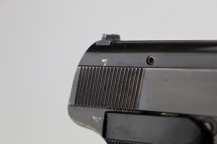 8/18/23 – This is a very nice example of a Sauer 38h issued to the Nazi police force during WW2. It is all matching and has a proper police “Eagle F” marking on the left side of the trigger guard. It comes as a rig with an un-issued 1942-dated police holster and two proper half-moon magazines. The gun itself has retained roughly 80% of its original finish. There is very minor wear around the high edges, some minor discoloration on both sides of the slide, but most of the finish loss comes in the form of thinning on the grip straps. Fitted with excellent black bakelite grips. Mint bore.