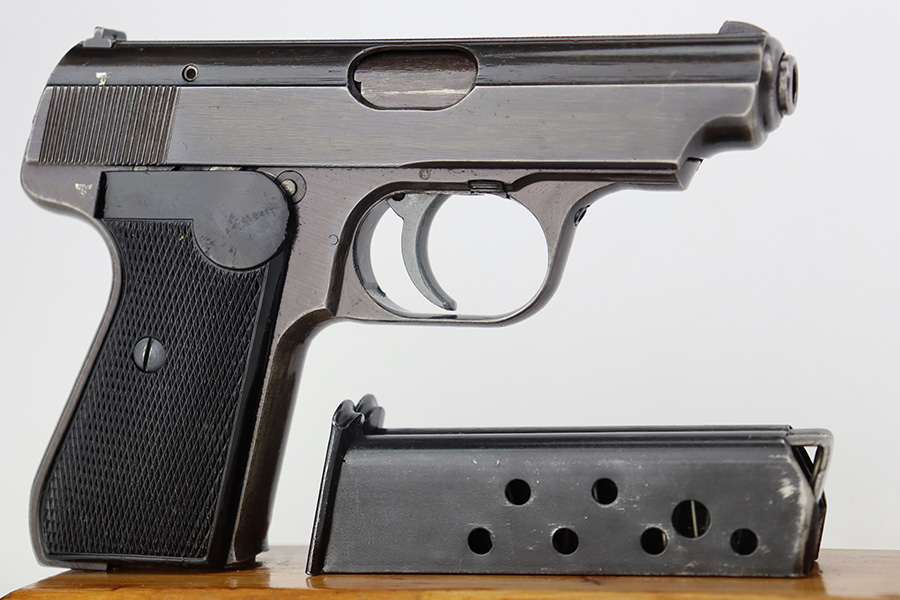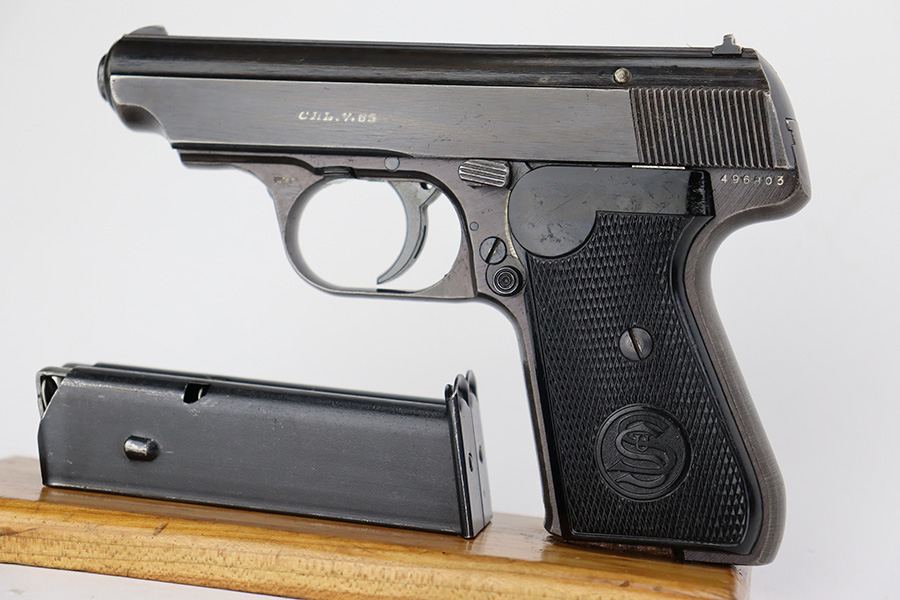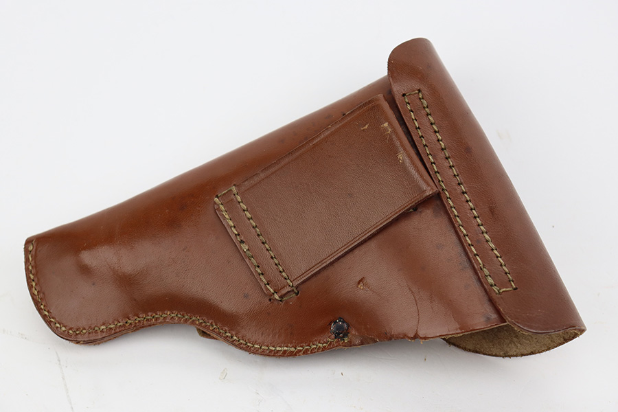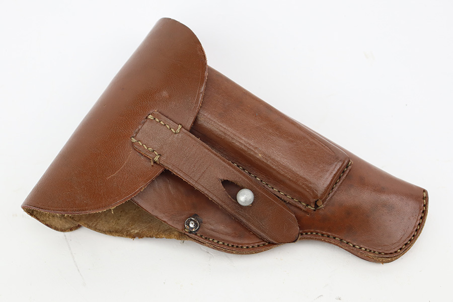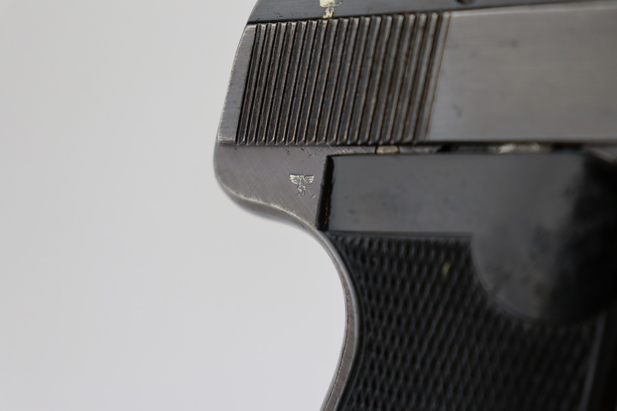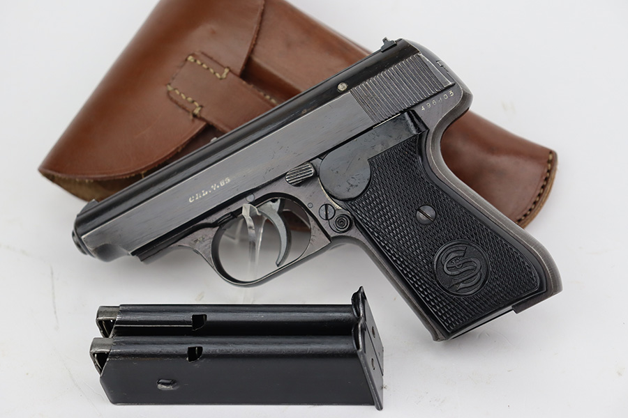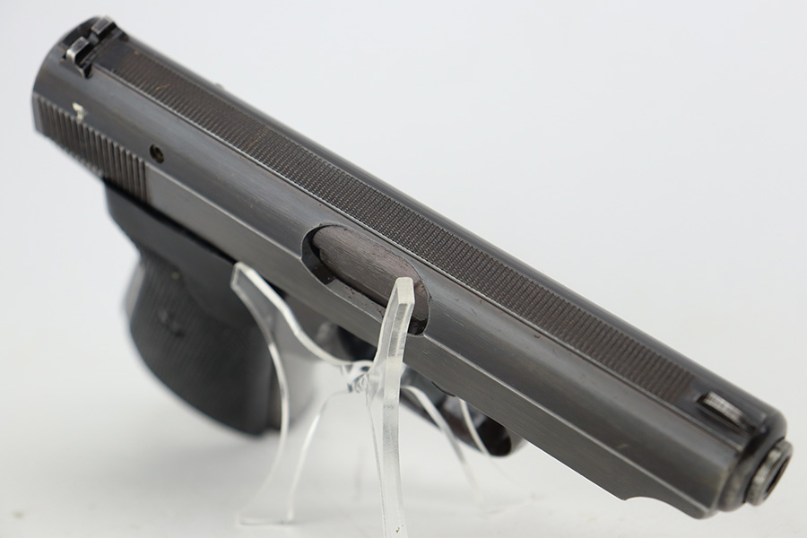 8/18/23 – This is a very nice example of a Sauer 38h issued to the Nazi police force during WW2. It is all matching and has a proper police “Eagle F” marking on the left side of the trigger guard. It comes as a rig with an un-issued 1942-dated police holster and two proper half-moon magazines. The gun itself has retained roughly 80% of its original finish. There is very minor wear around the high edges, some minor discoloration on both sides of the slide, but most of the finish loss comes in the form of thinning on the grip straps. Fitted with excellent black bakelite grips. Mint bore.