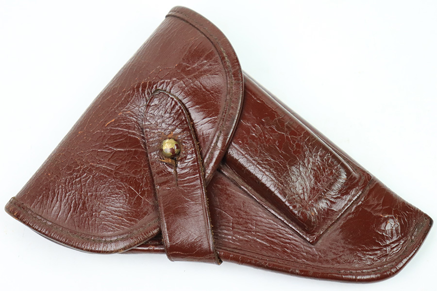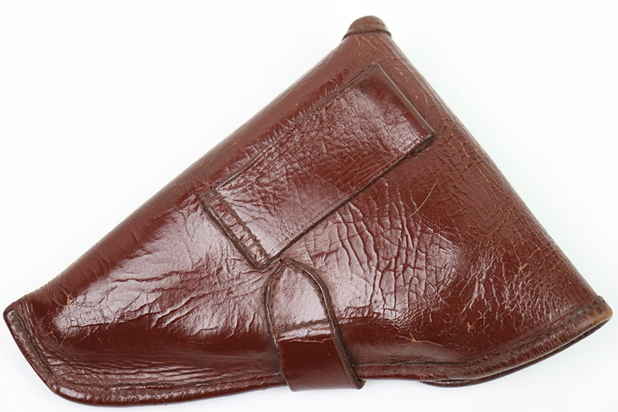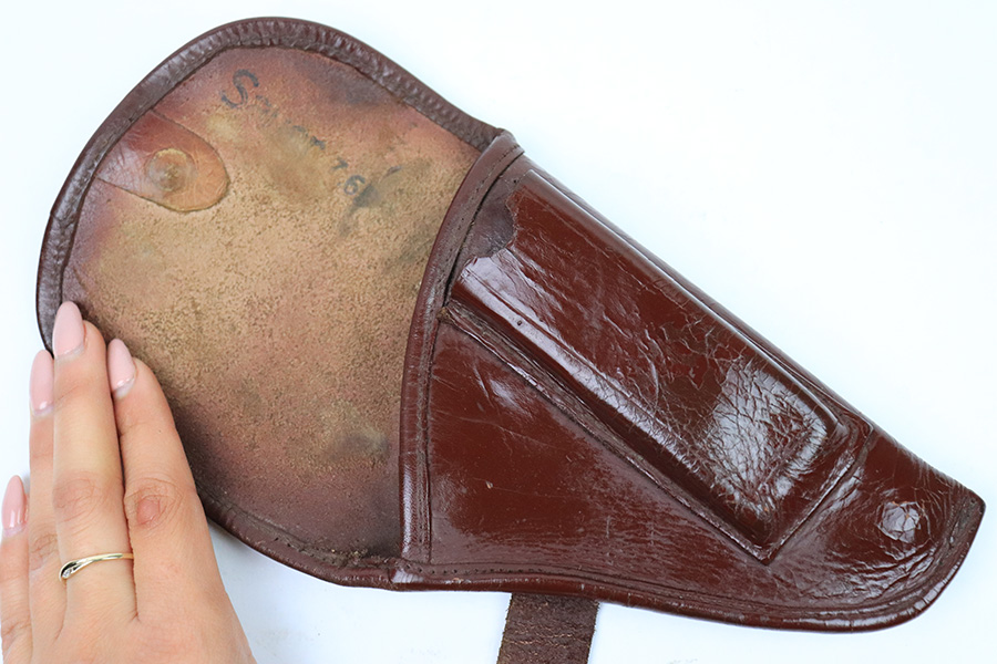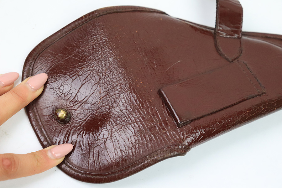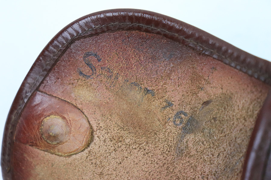 12/13/22 – This is an interested example of a 7.65mm Sauer pocket pistol holster. The holster is fairly small, measuring about 6 inches long and 5.5 inches wide when closed (at the longest and widest points). The reddish brown leather has some surface wrinkling and mild cracking but no deep issues with the leather. Normal pliability and some mild signs of use. The interior leather has a “Sauer 7,65” ink stamp and there are no other markings. A fairly uncommon find as we don’t recall seeing very many holsters in this style stamped in this way. The stitching is all original except for the belt loop stitching, which appears replacement.
