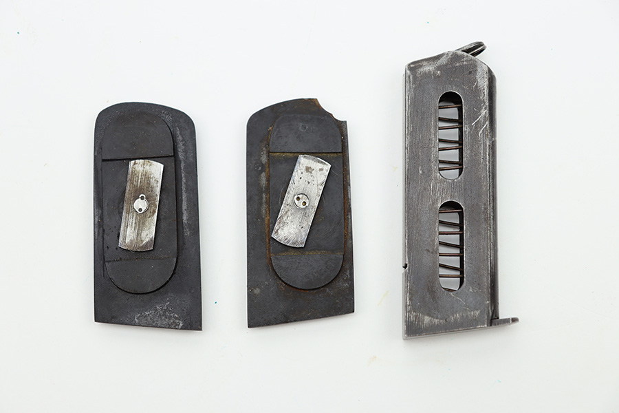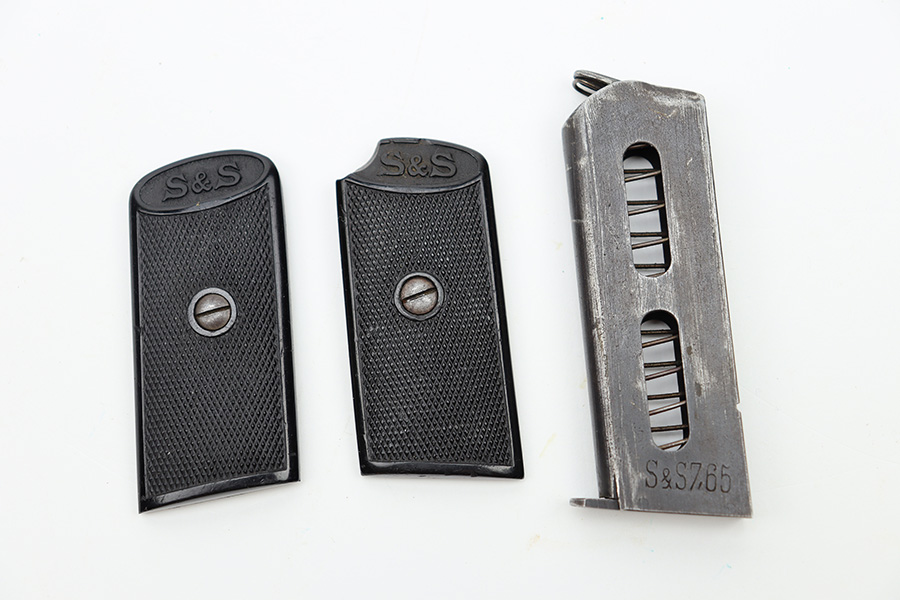 11/10/23 – This is a nice set of period-correct black bakelite grips for a Sauer Model 1913 pistol. Also comes with one correct magazine. Both the grips and magazine have the “S&S” Sauer & Sohns logo. Magazine is labeled “7.65”. The grips are very nice, but there are a couple of tiny chips on the top edge of the left panel. The magazine shows the typical signs of wear and use. Good spring.
