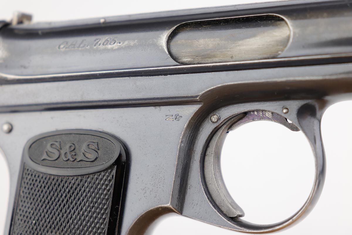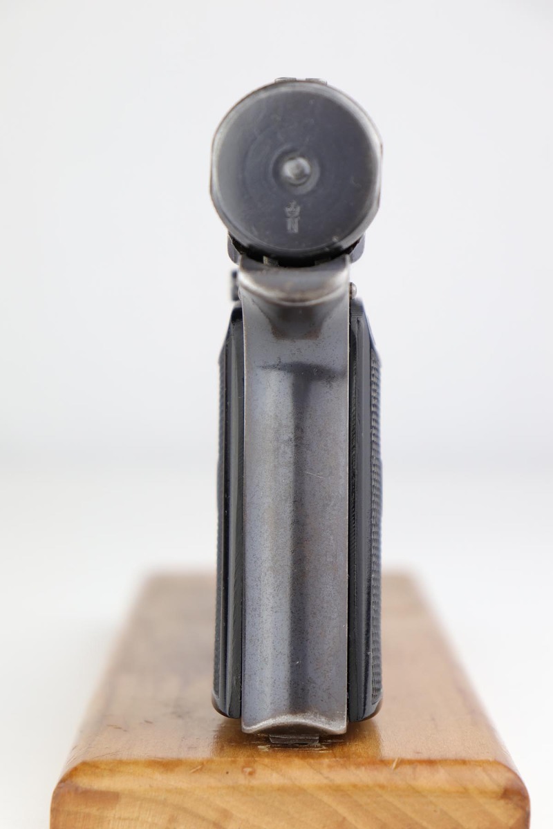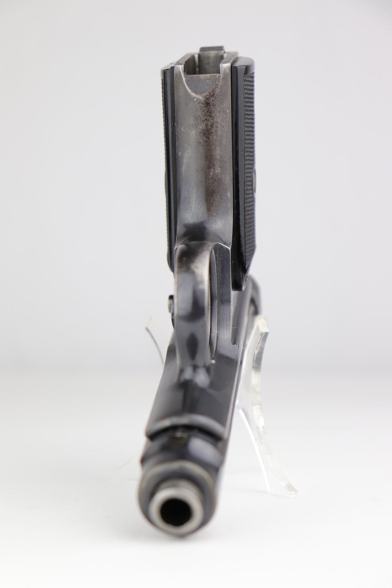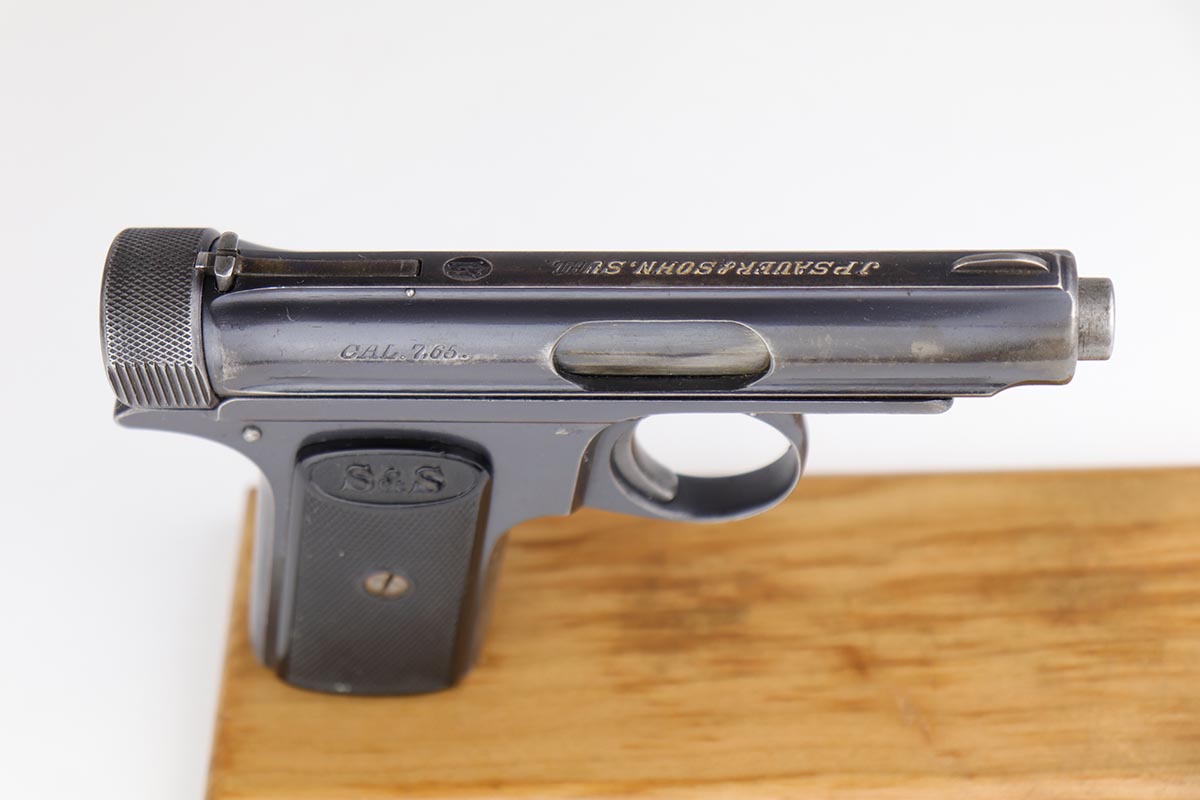 6/21/19 – This is an original Sauer model 1913 that was made during the Great War. Serial dates it to about 1916. The original blue rates at 85-90% with most of the finish loss on the front strap, and some oxidation/patina on the back strap. Nice, original grips. Bore is shiny with good rifling but minor freckling throughout.