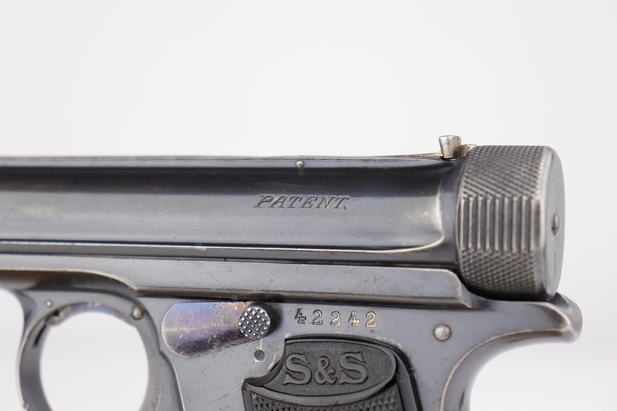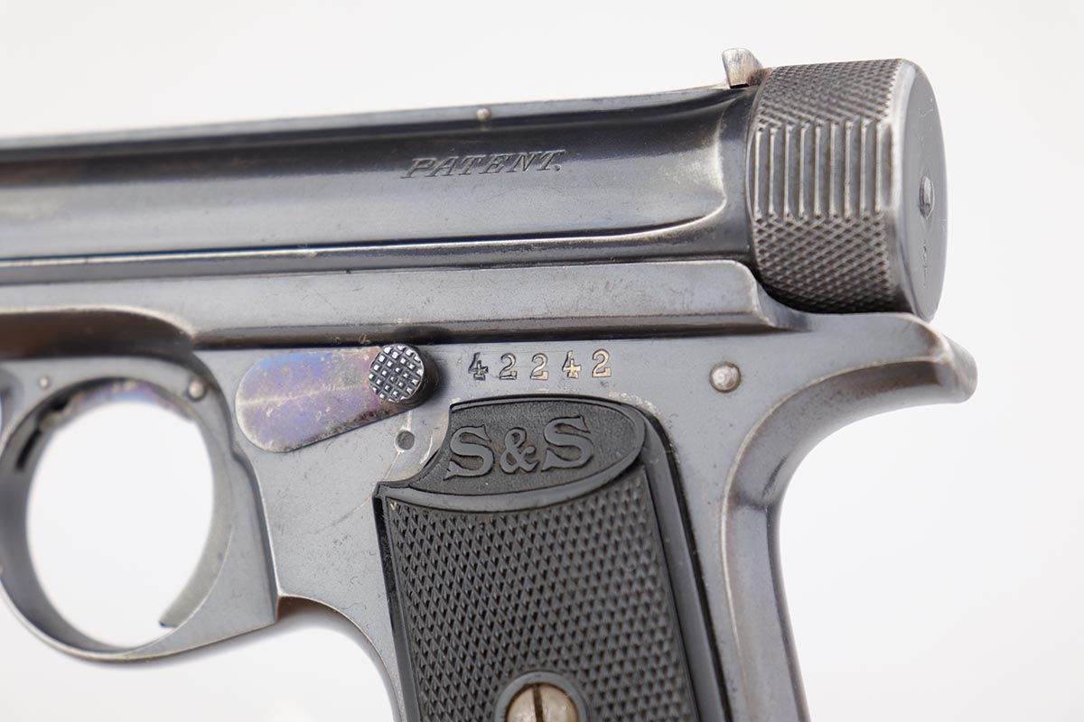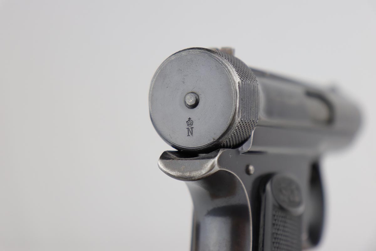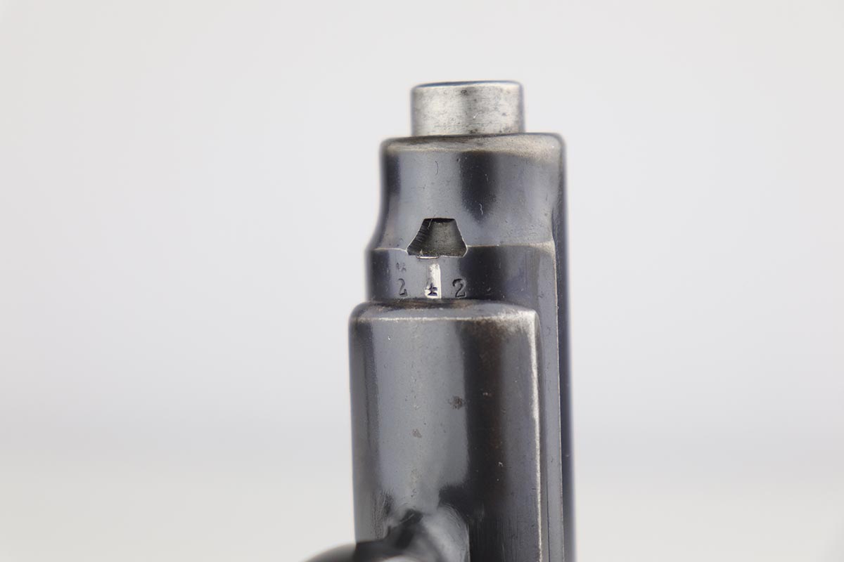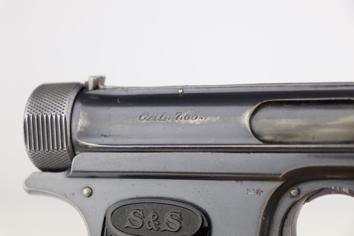 6/21/19 – This is an original Sauer model 1913 that was made during the Great War. Serial dates it to about 1916. The original blue rates at 85-90% with most of the finish loss on the front strap, and some oxidation/patina on the back strap. Nice, original grips. Bore is shiny with good rifling but minor freckling throughout.