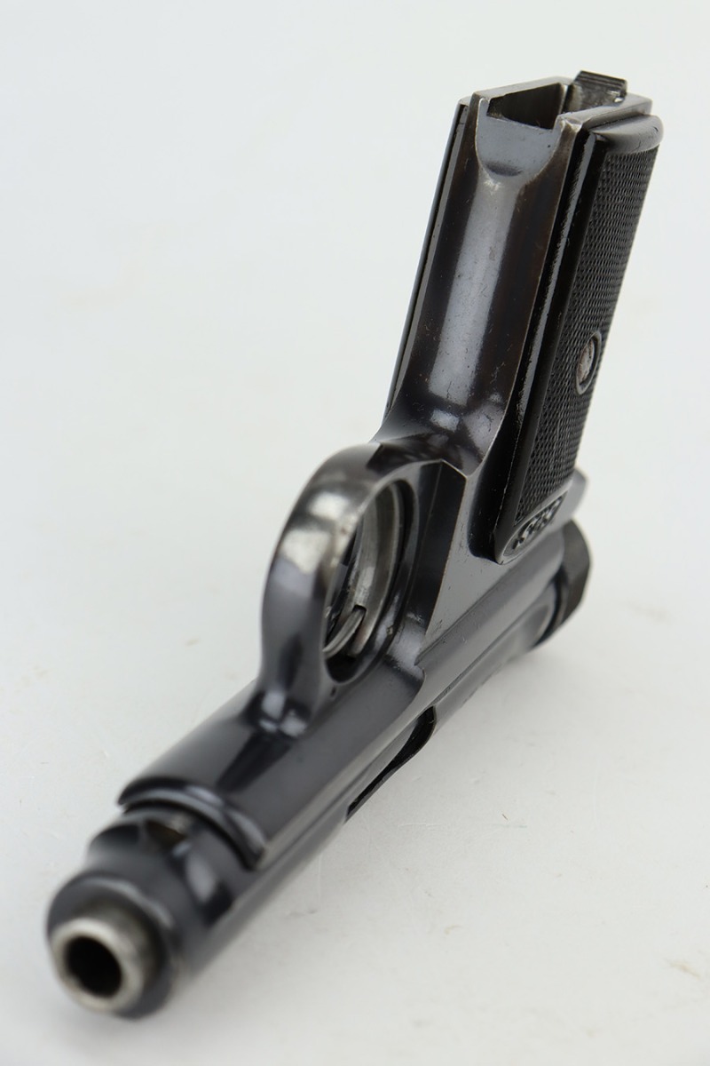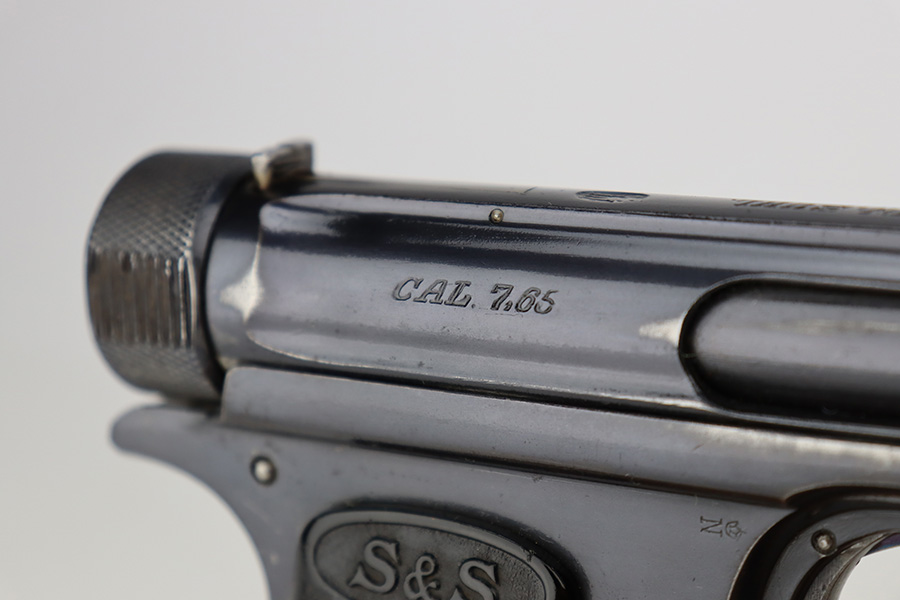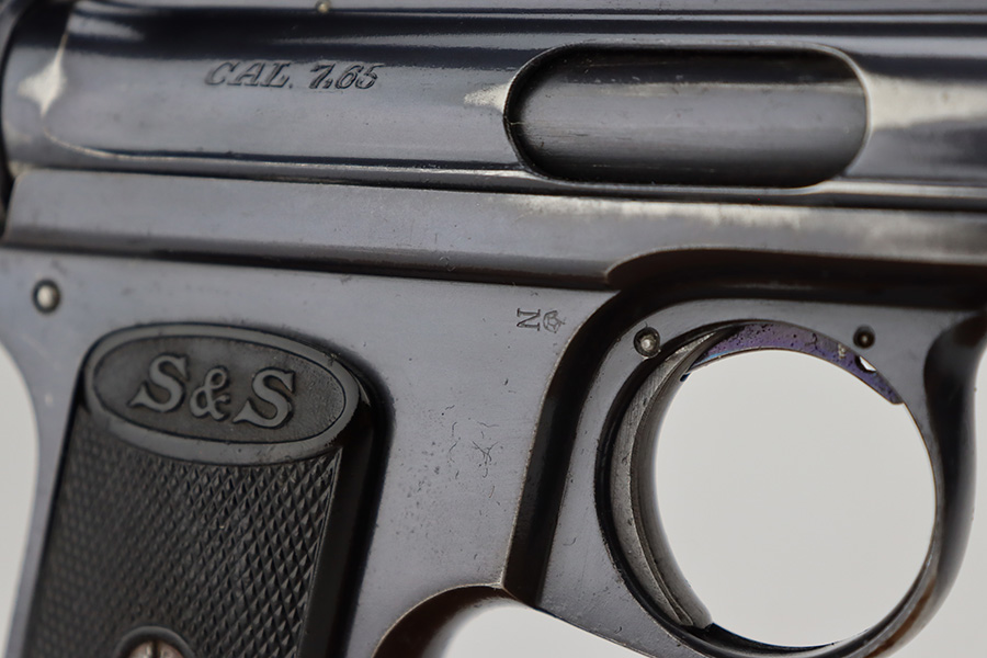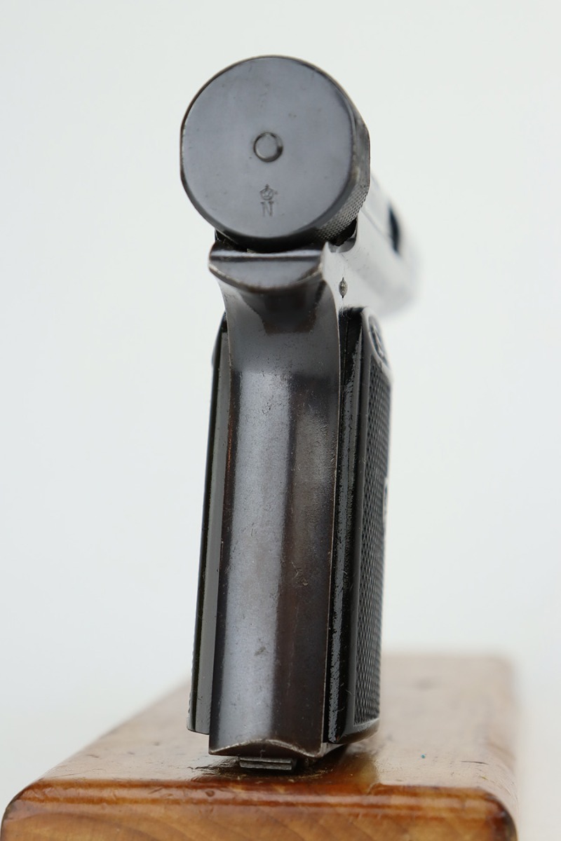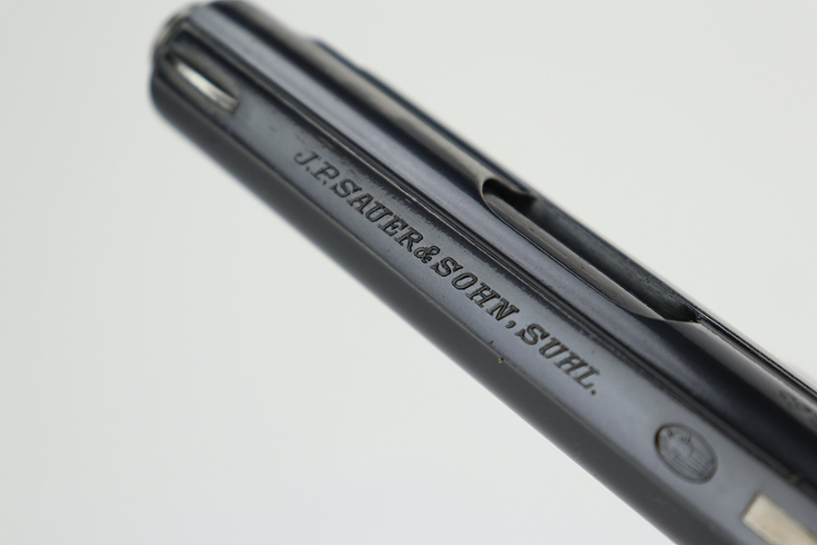 7/10/23 – This is a very nice example of a Sauer Model 1913. It is all matching and has the proper “Crown N” proofs. It has retained somewhere between 85-90% of its original bluing with wear around the muzzle and on the high edges of the slide – most noticeable along the right side. Comes with excellent period-correct black bakelite grips and one proper magazine. Minty bore.